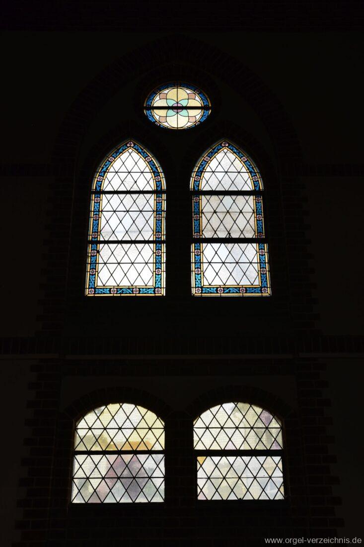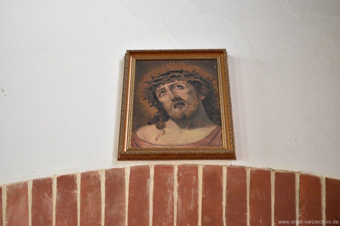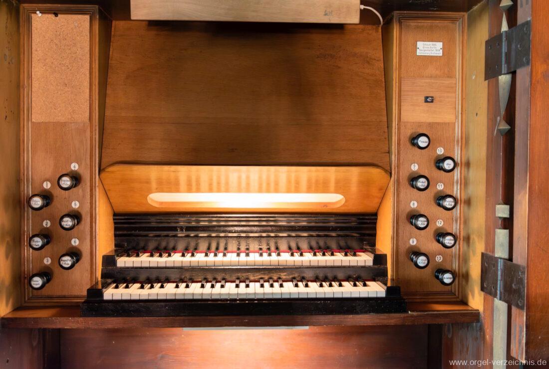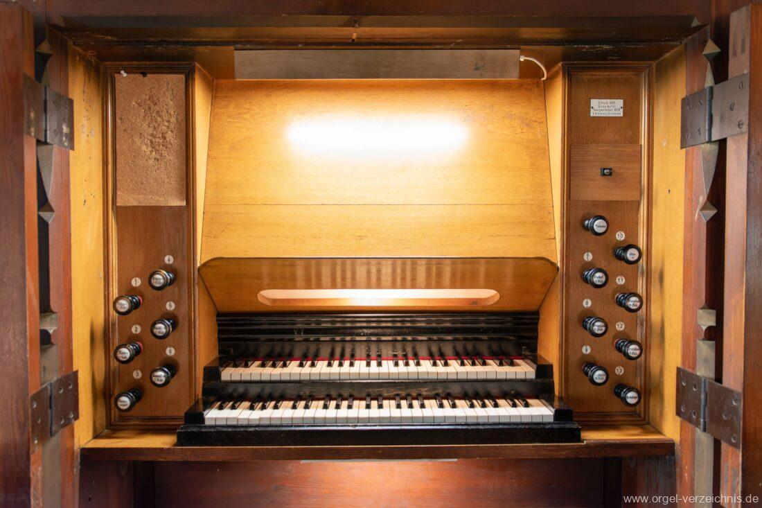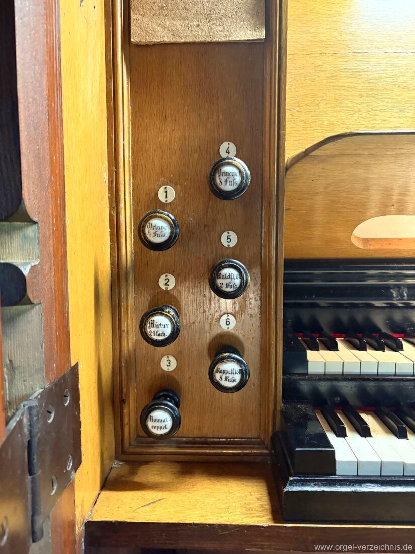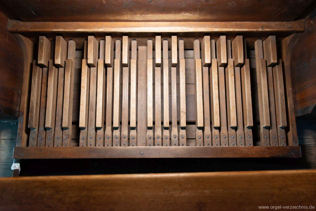 I Hauptwerk C – f“‘Principal 8 Fuss. C – F Holz offen, ab FS Prospekt, ab c‘ innen Koppelflöte 8 Fuss. C – H Holz ged., ab c° Metall konisch Octave 4 Fuss. C – H Prospekt, ab c° innen Waldflöte 2 Fuss. Metall leicht konisch Mixtur 2-3 fach. ist 3-4 fach – rep. c°/c’/c“‘, ab c‘ 4 fach |