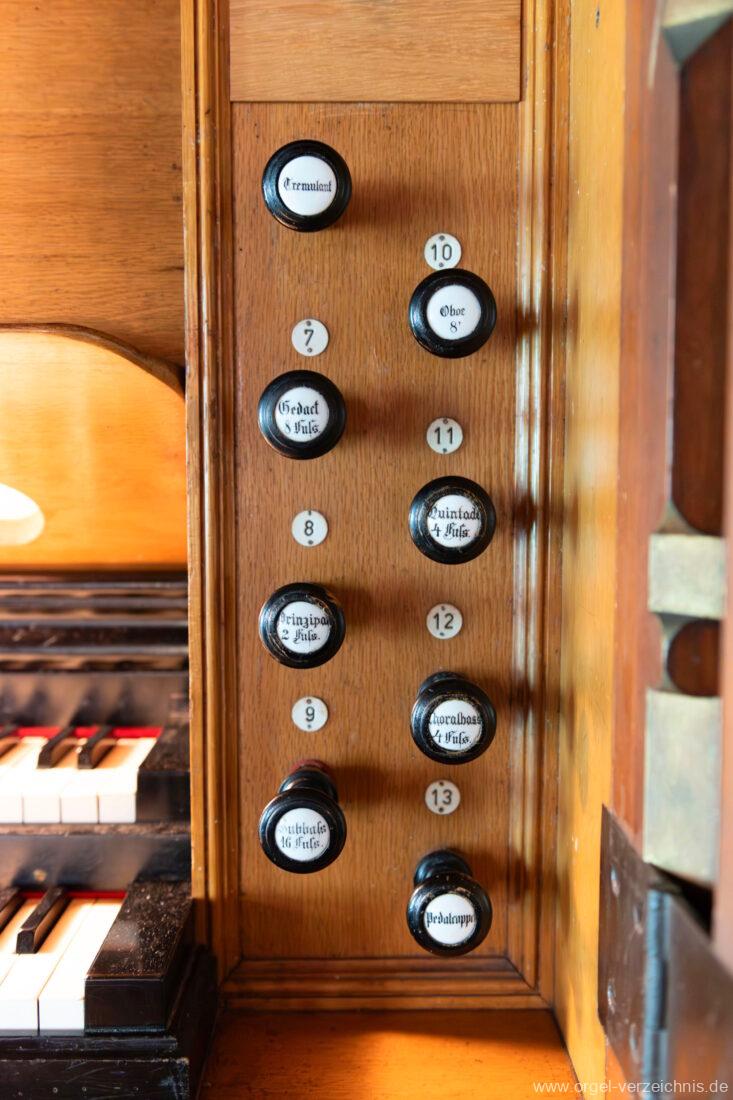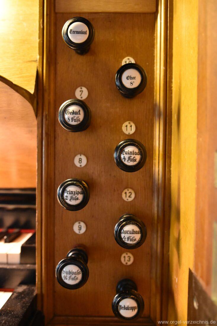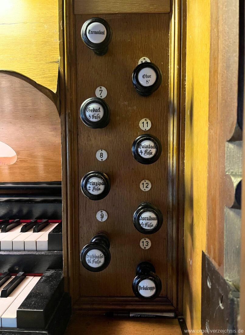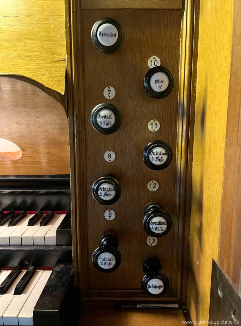 Rechte Seite: Tremulant (wirkt aufs gesamte Werk), Pedalcoppel als Registerzüge Nr. 9 und 13