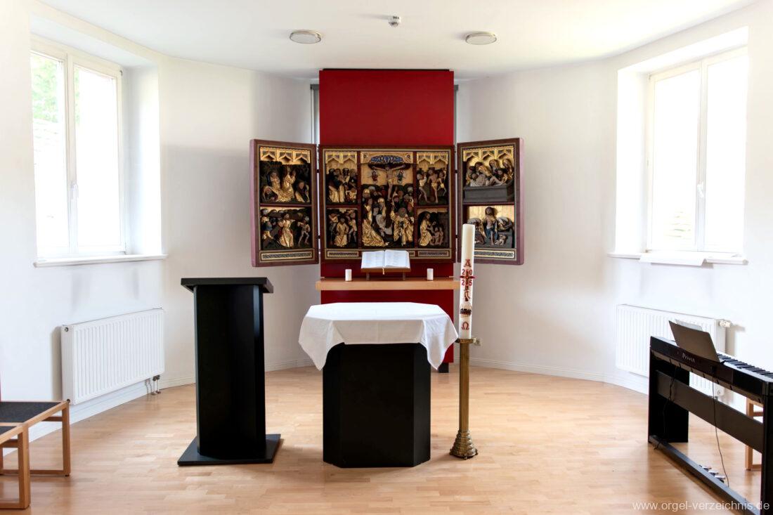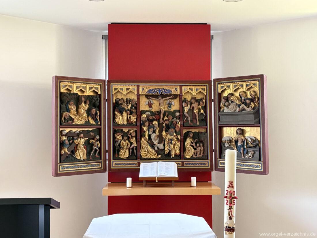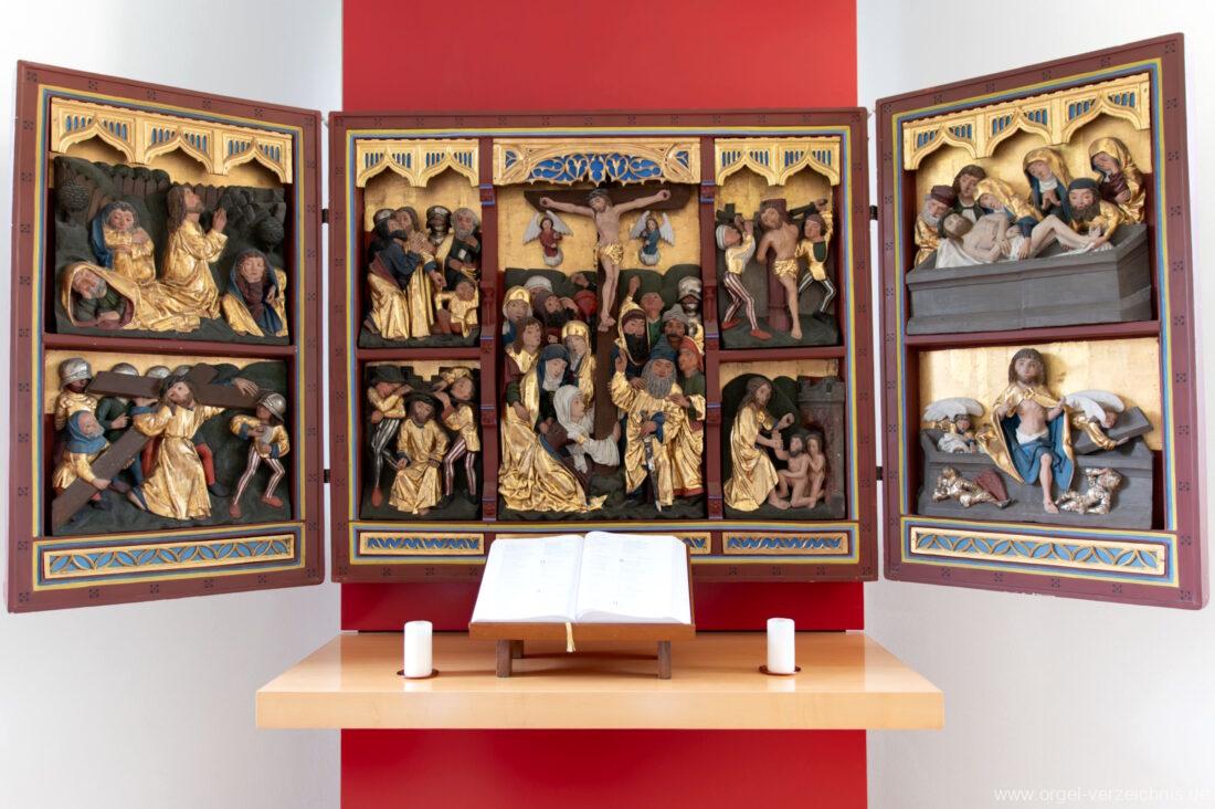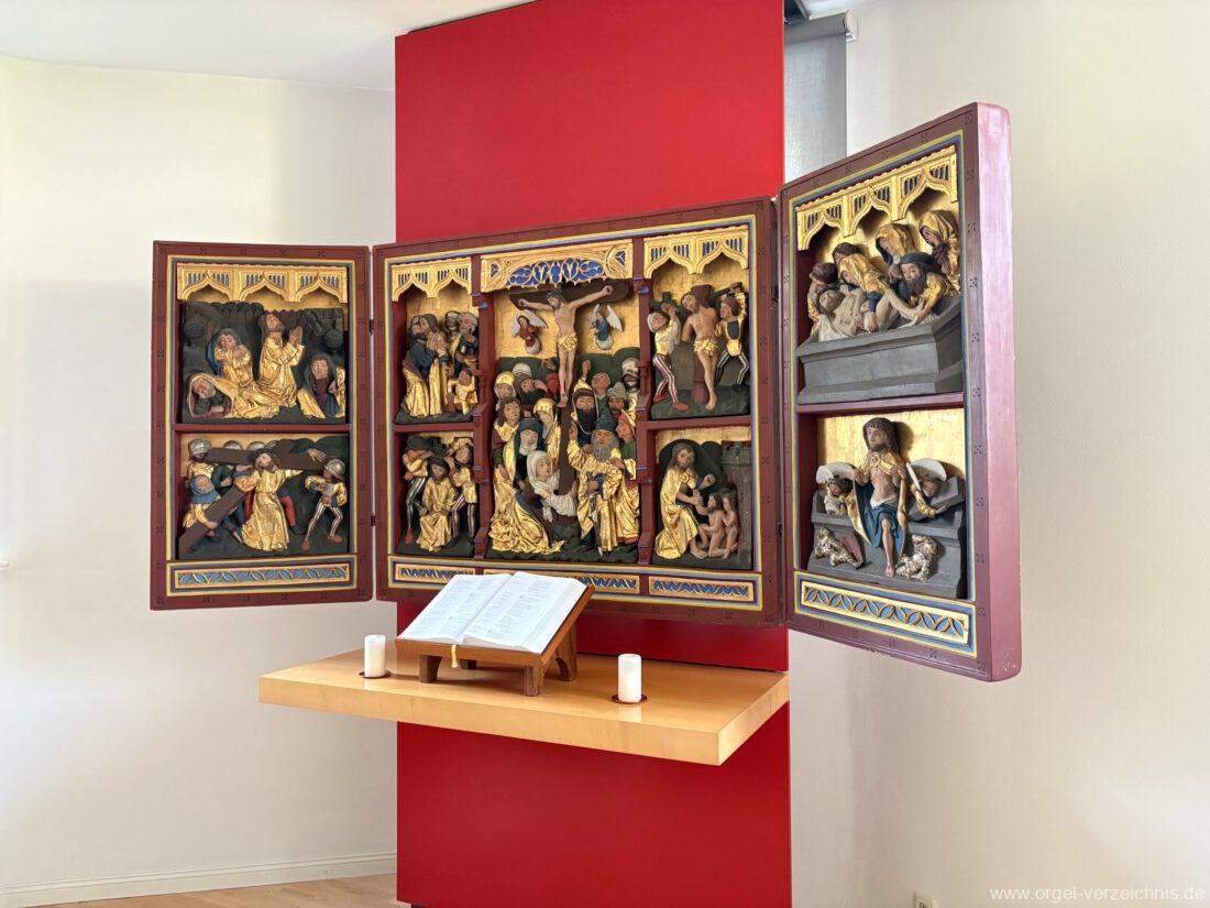 1999 Neugestaltung des Kircheninnenraumes. Integrierung eines mittelalterlichen Retabels im Chorraum.