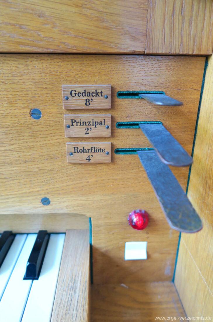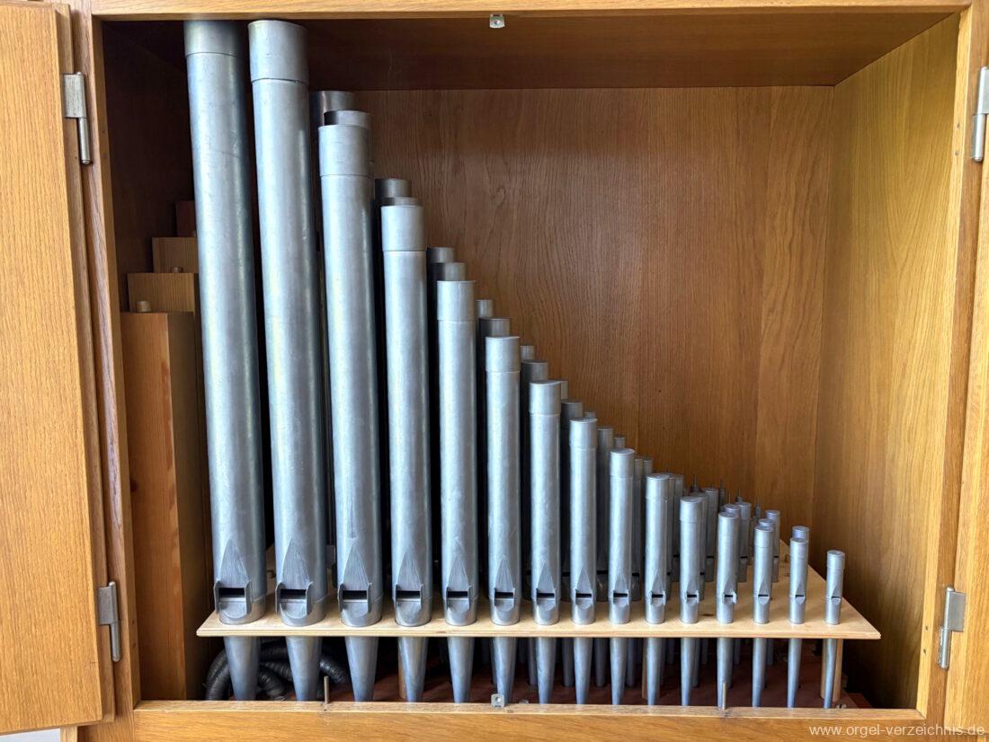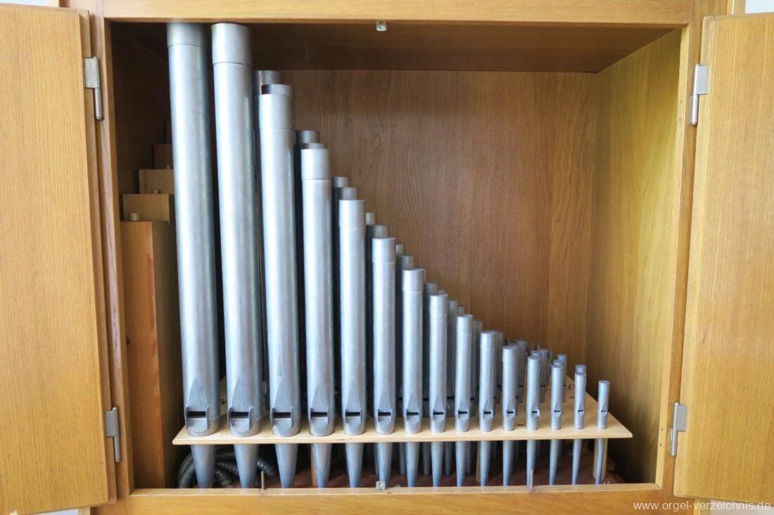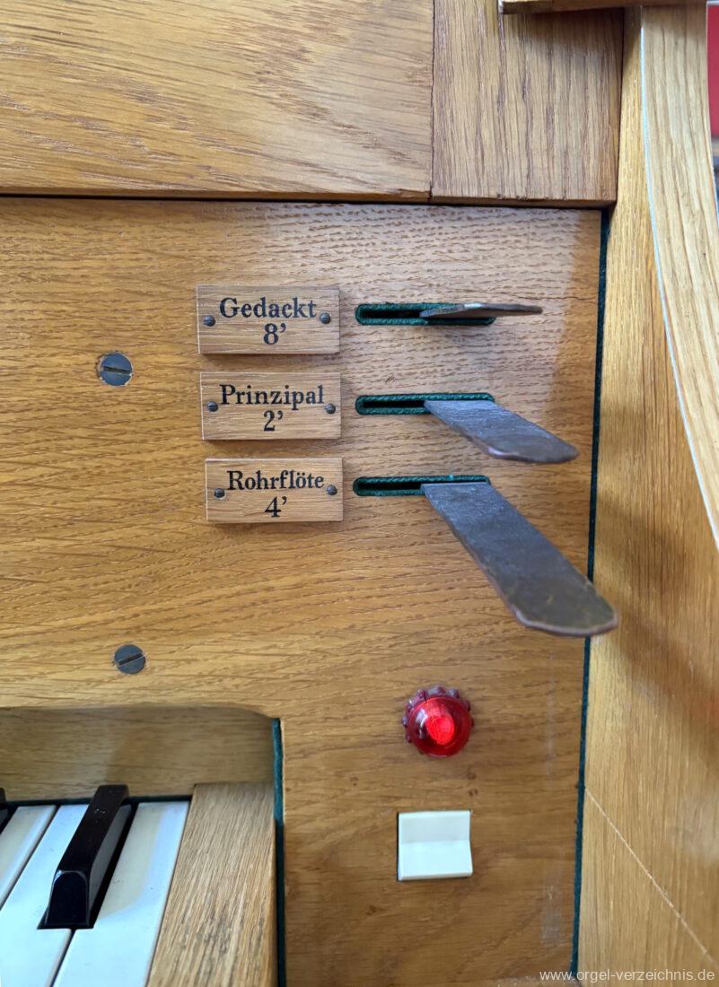 Manual F – d‘Gedackt 8′ F – A Holz ged., ab B Metall ged. Rohrflöte 4′ Metall rohrged. Prinzipal 2′ Metall