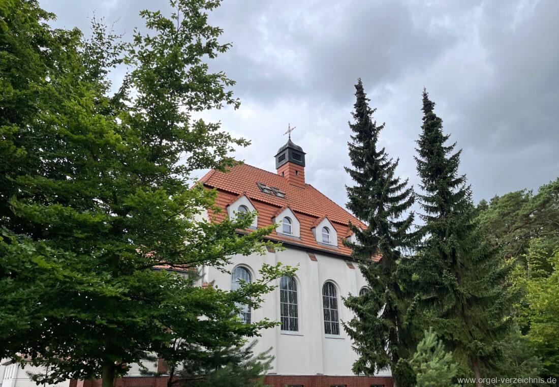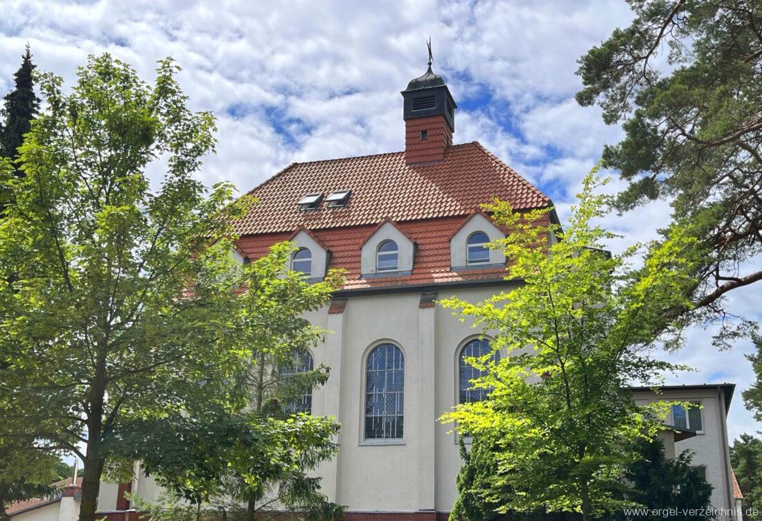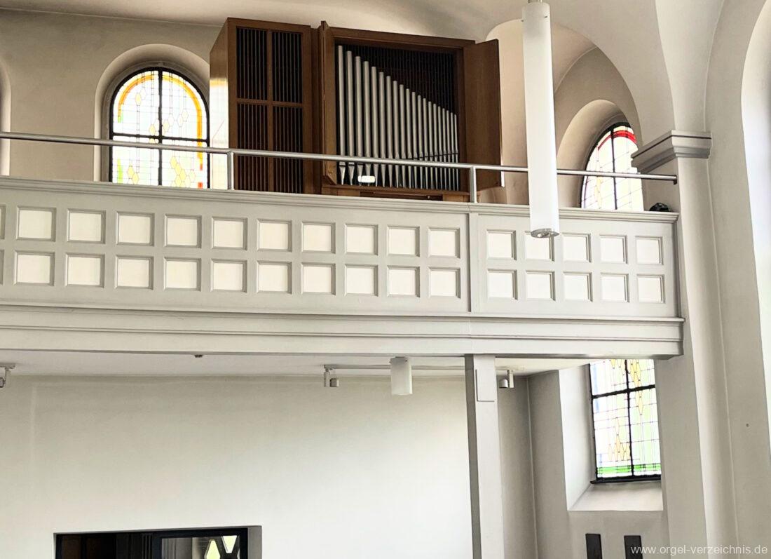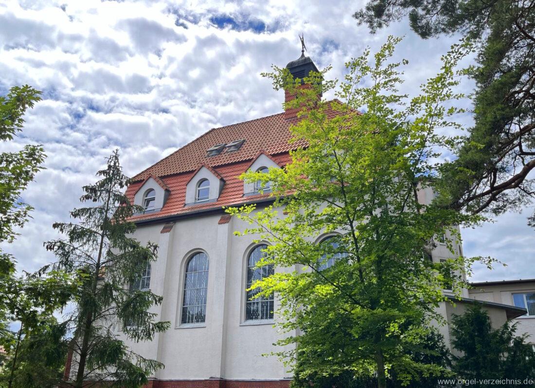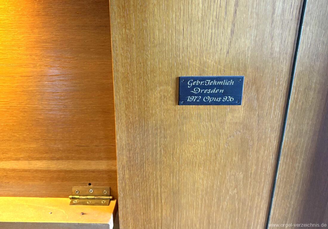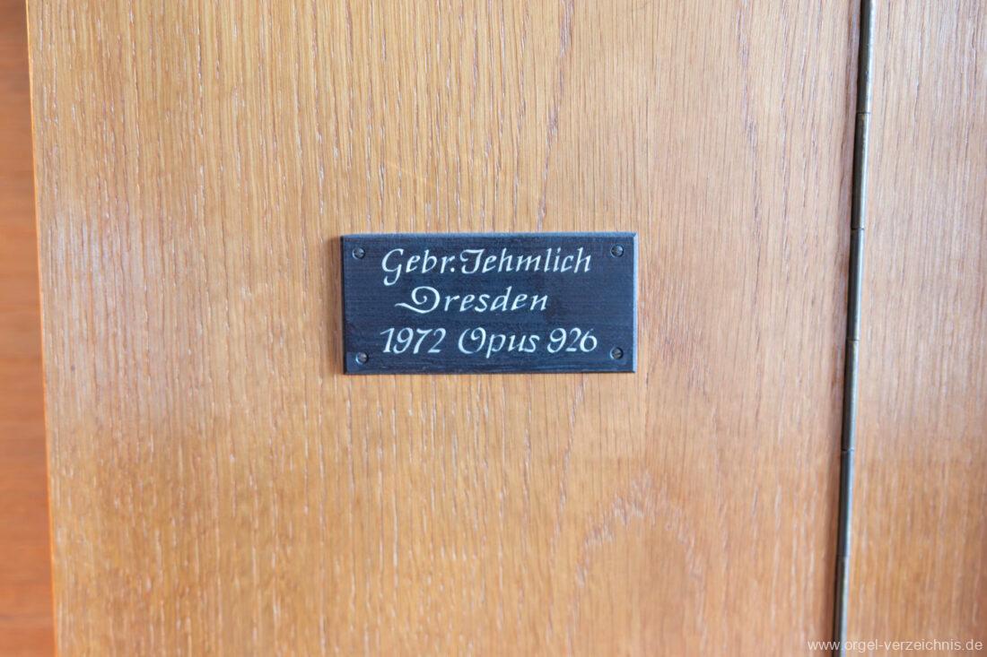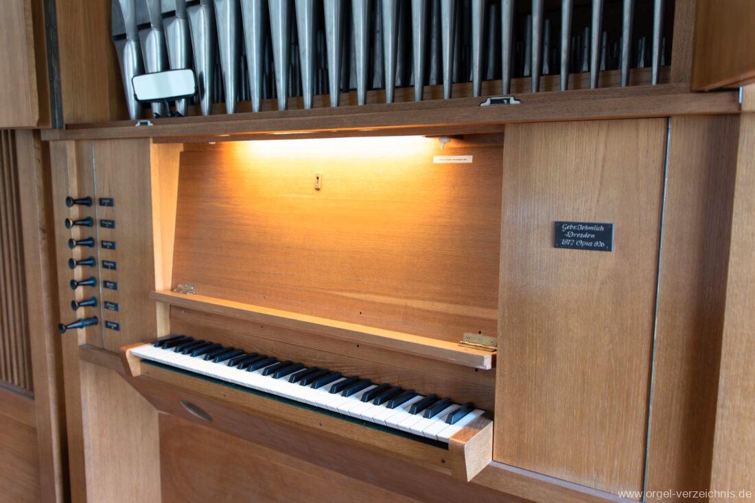 1972 mechanische Schleifladenorgel mit fest ins Gehäuse eingelassenem Spieltisch, erbaut Opus 926 von Orgelbau Gebrüder Jehmlich Dresden I/7. Das Manualwerk ist mittels zweier von Hand schiebbarer Prospektflügeltüren schwellbar. Das Pedalregister befindet sich im Gehäuseanbau auf der linken Seite.