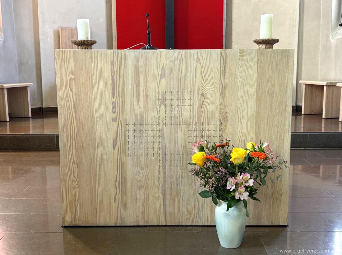 1999 Neugestaltung des Kircheninnenraumes. Integrierung eines mittelalterlichen Retabels im Chorraum.
