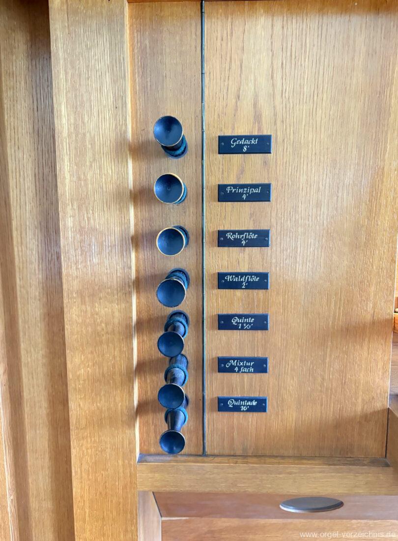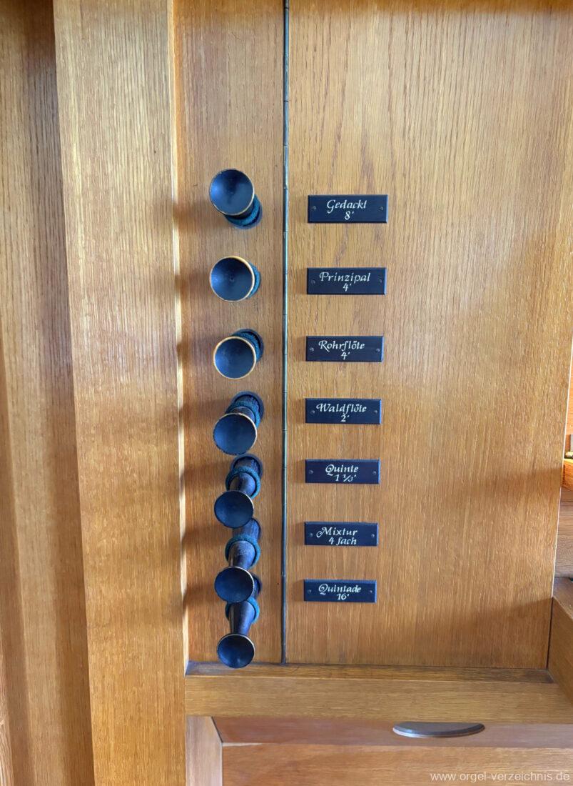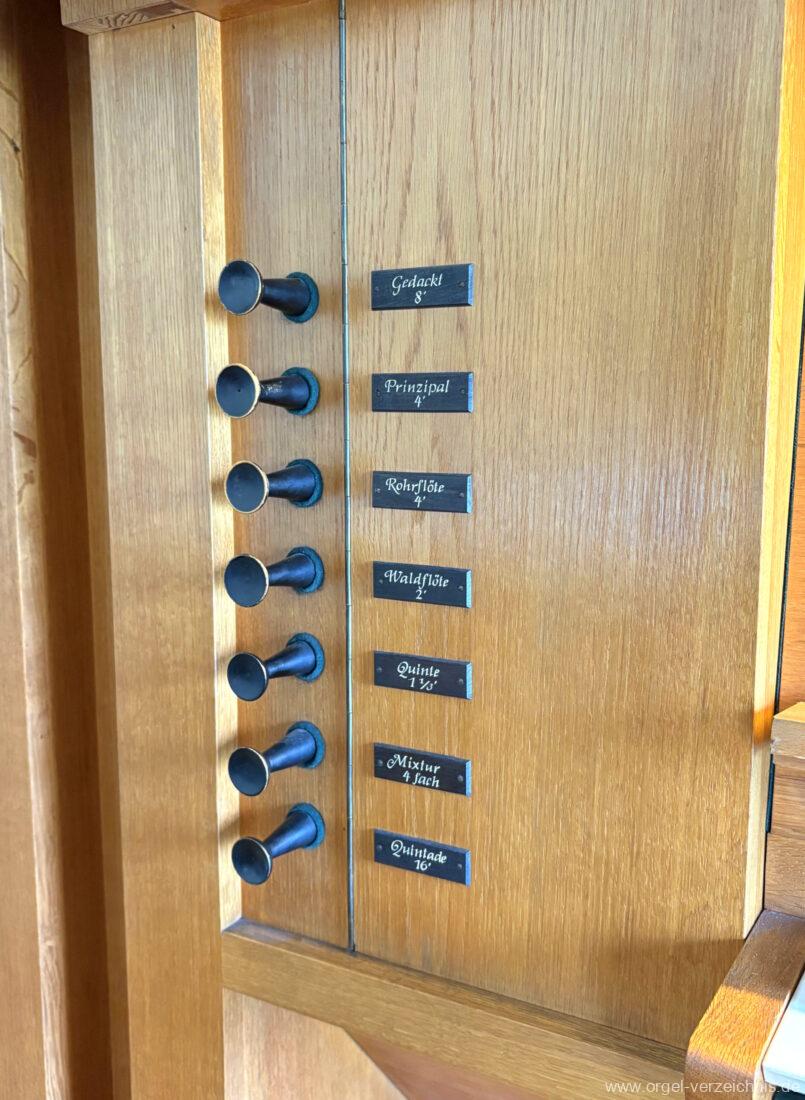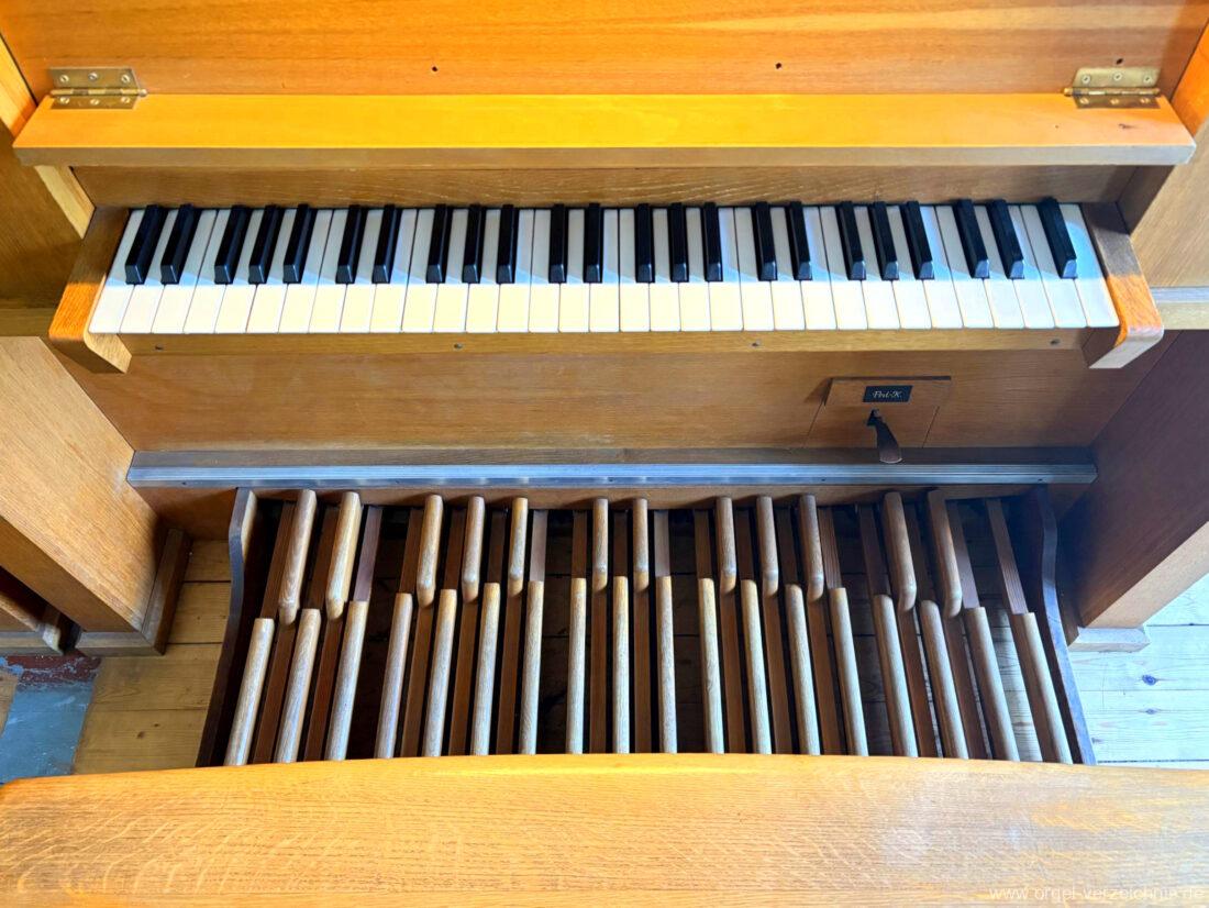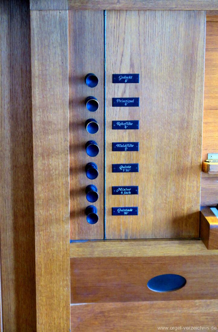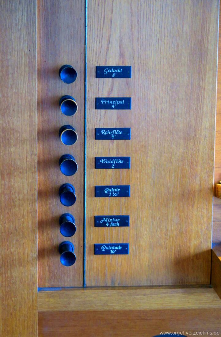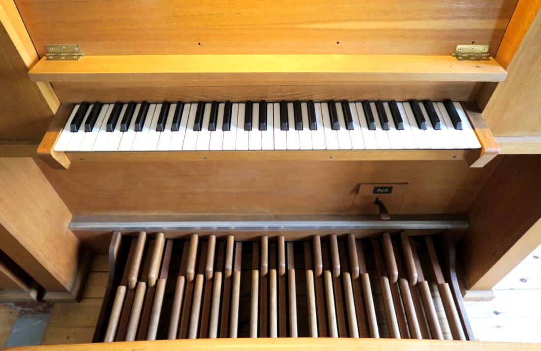 Manual C – g“‘Gedackt 8′ Metall ged. Prinzipal 4′ C – g° Prospekt, ab gs° innen Rohrflöte 4′ Metall rohrged., ab fs“ offen konisch Waldflöte 2′ Metall, leicht konisch Quinte 1 1/3′ Metall Mixtur 4 fach 2′ – rep. c°/c’/c“