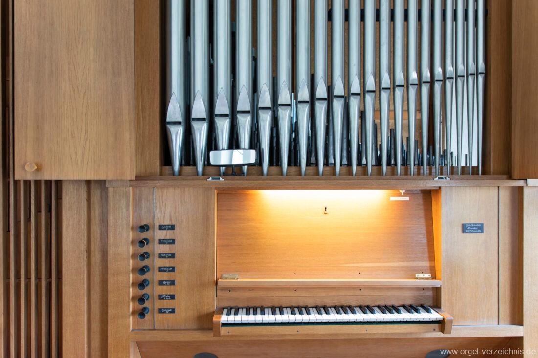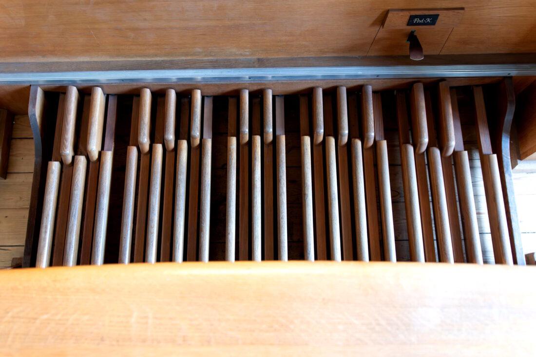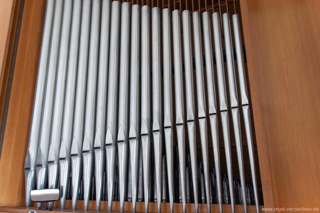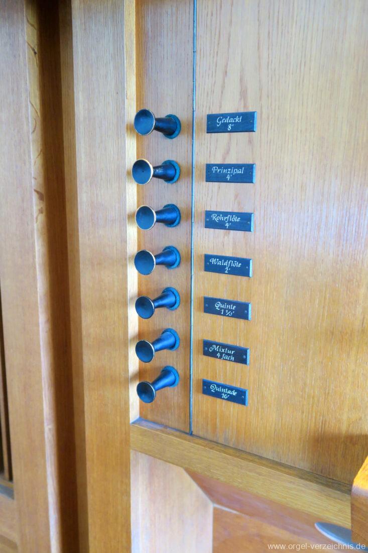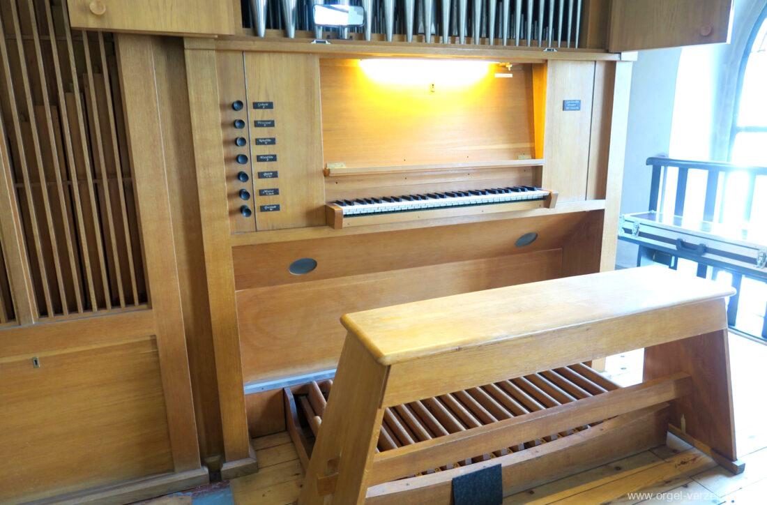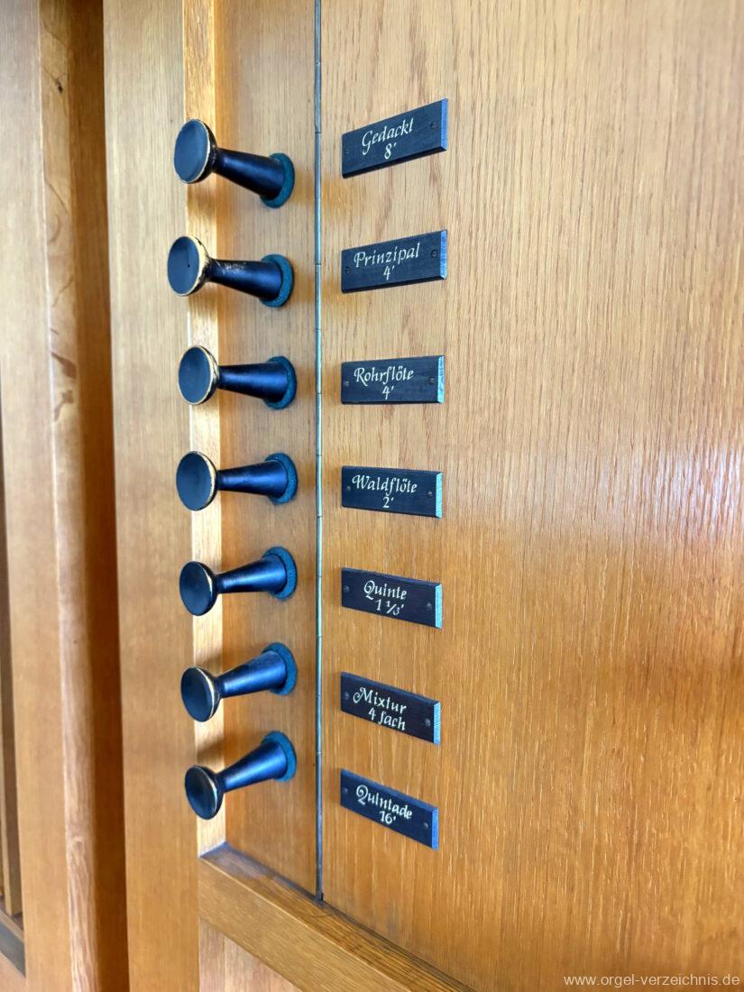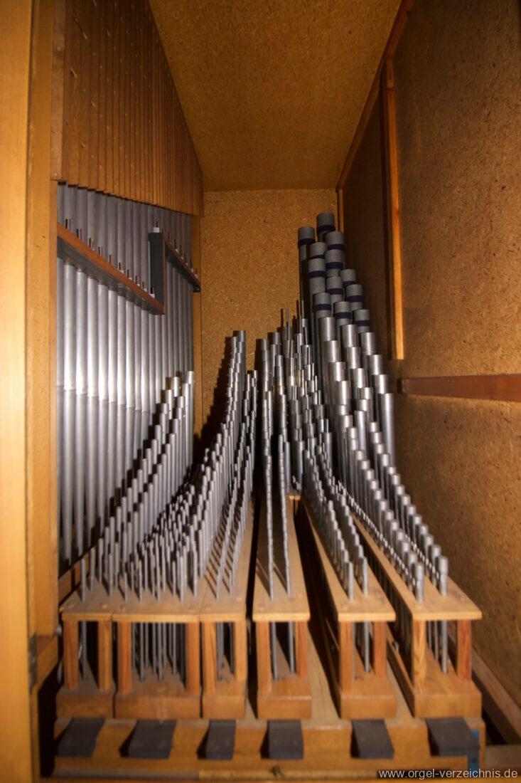 Manual C – g“‘Gedackt 8′ Metall ged. Prinzipal 4′ C – g° Prospekt, ab gs° innen Rohrflöte 4′ Metall rohrged., ab fs“ offen konisch Waldflöte 2′ Metall, leicht konisch Quinte 1 1/3′ Metall Mixtur 4 fach 2′ – rep. c°/c’/c“