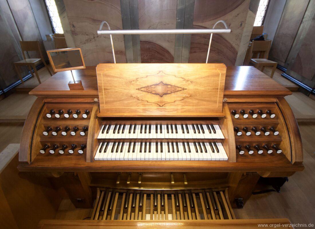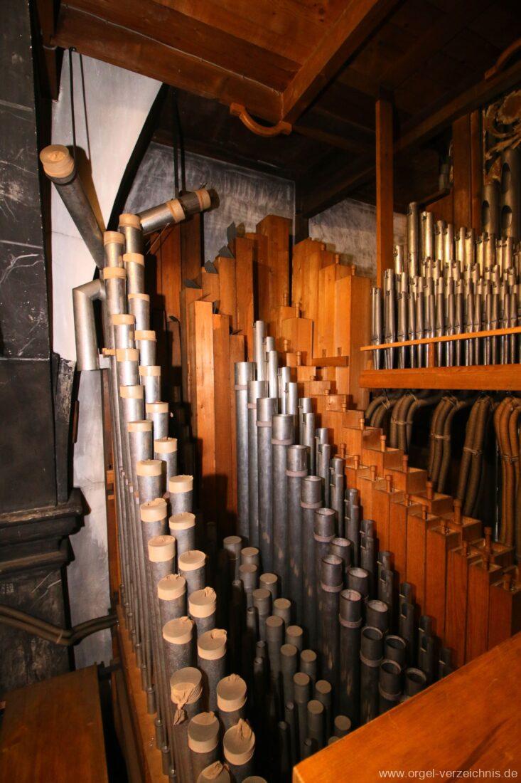I Hauptwerk C – f“‘Bourdon 16′ Holz ged., ab c“ Metall ged. Principal 8′ Metall Coppel 8′ C – cs° Holz ged., ab d° Metall ged. Viola di Gamba 8′ Metall Flûte Dous 8′ C – H Holz offen, ab c° Metall Octav 4′ C – H Prospekt, ab c° innen Flauto Cuspito 4′ Metall konisch Doublette 2′ Metall Cornet 8′ 4-5-fach ab c° (5-fach ab fs°) aufgebänkt Mixtur 1 1/3′ 4-5 fach rep. A/a°/a’/a“/c“‘, 5-fach ab a“ Trompete 8′ Stiefel Metall/Becher Naturguss