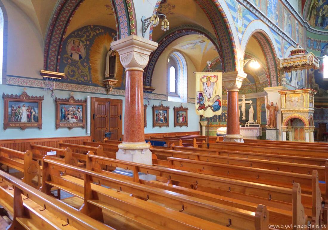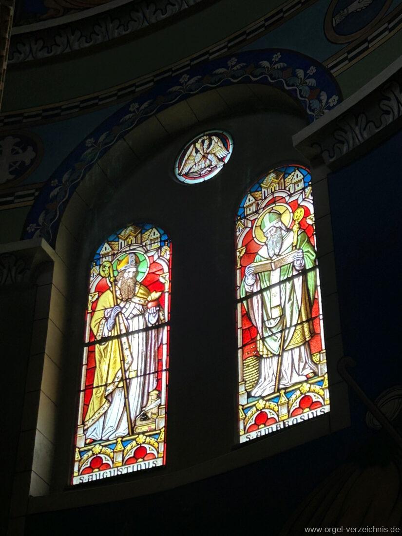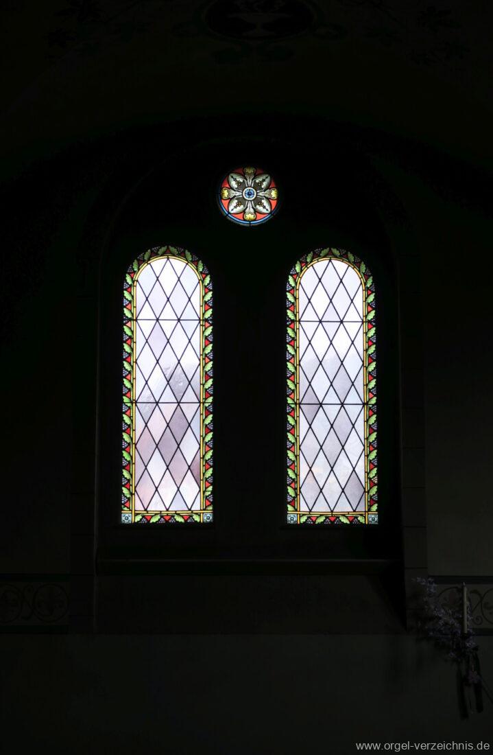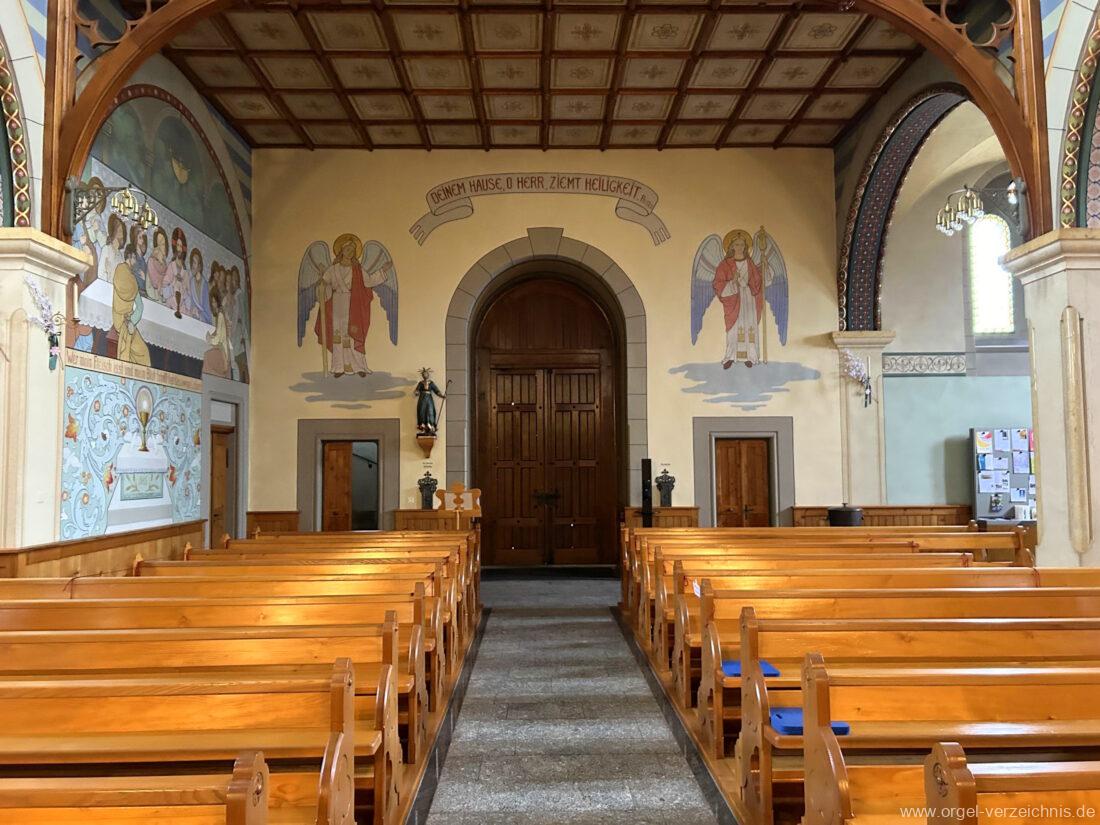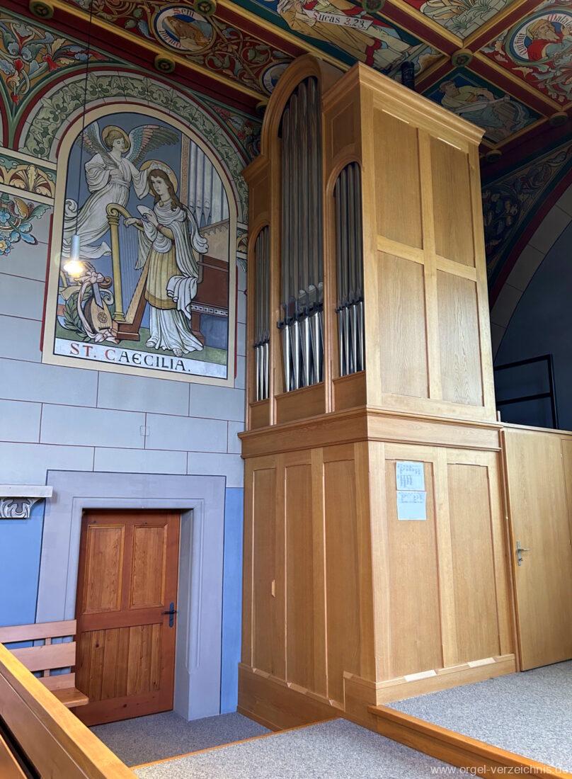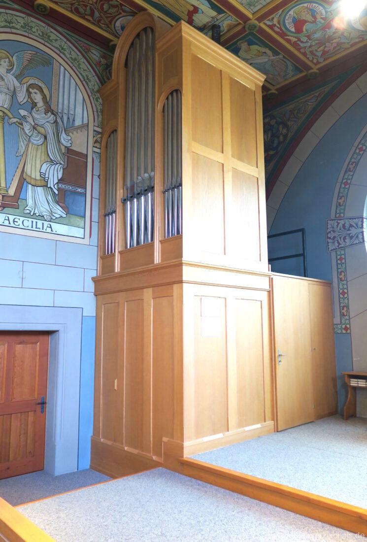 1908 pneumatische Kegelladenorgel mit mittig freistehendem Spieltisch, erbaut durch die Gebrüder Mayer (Feldkirch/Vorarlberg) II/19. Das Gehäuse wurde von Carl Glauner (Wil) erschaffen und gefasst.