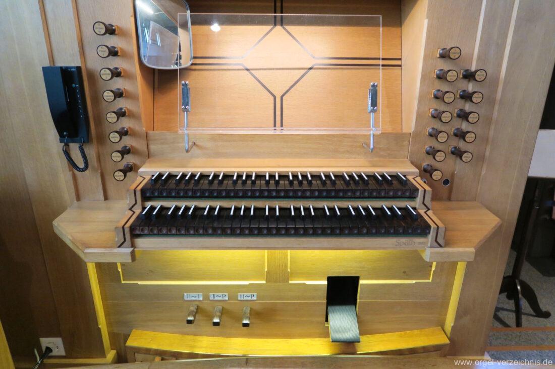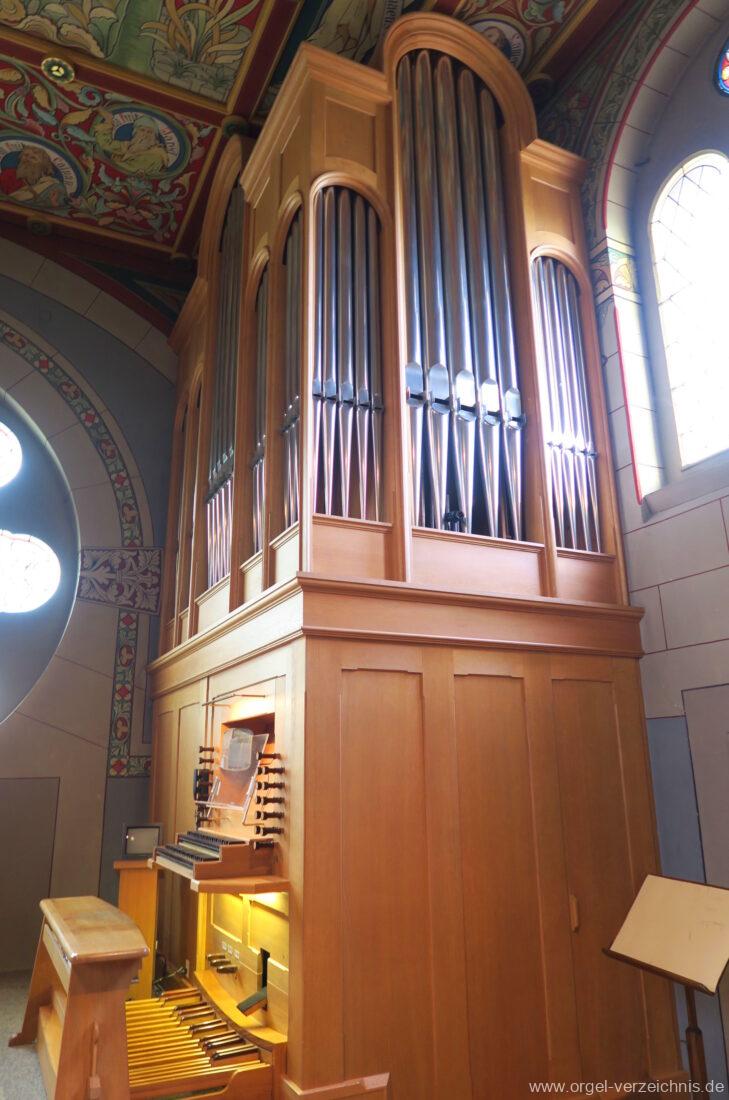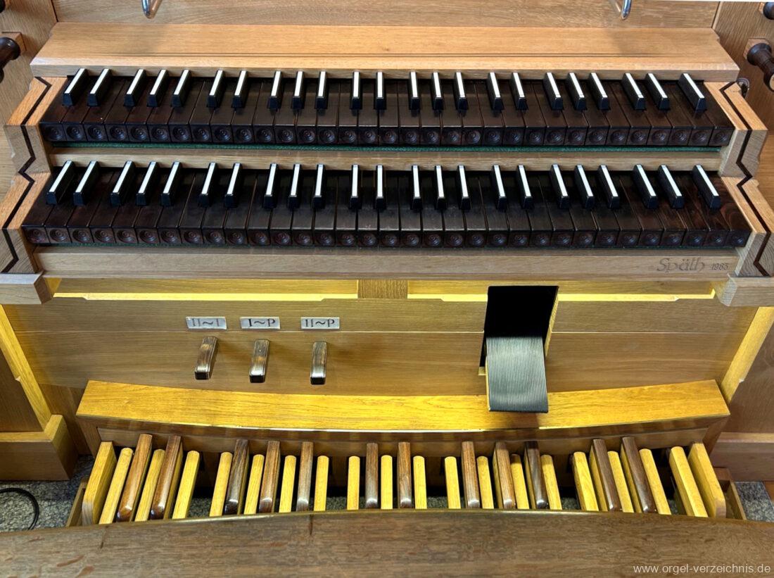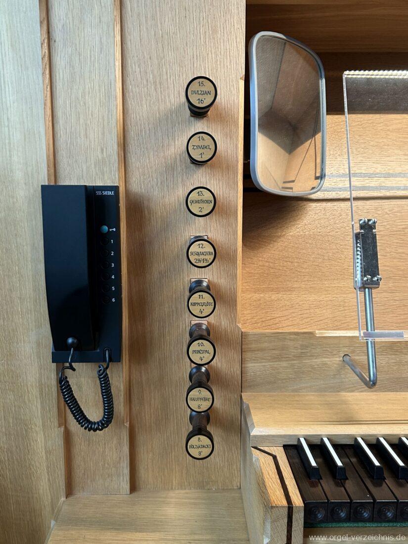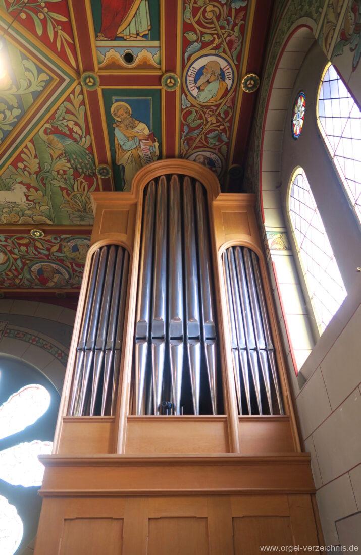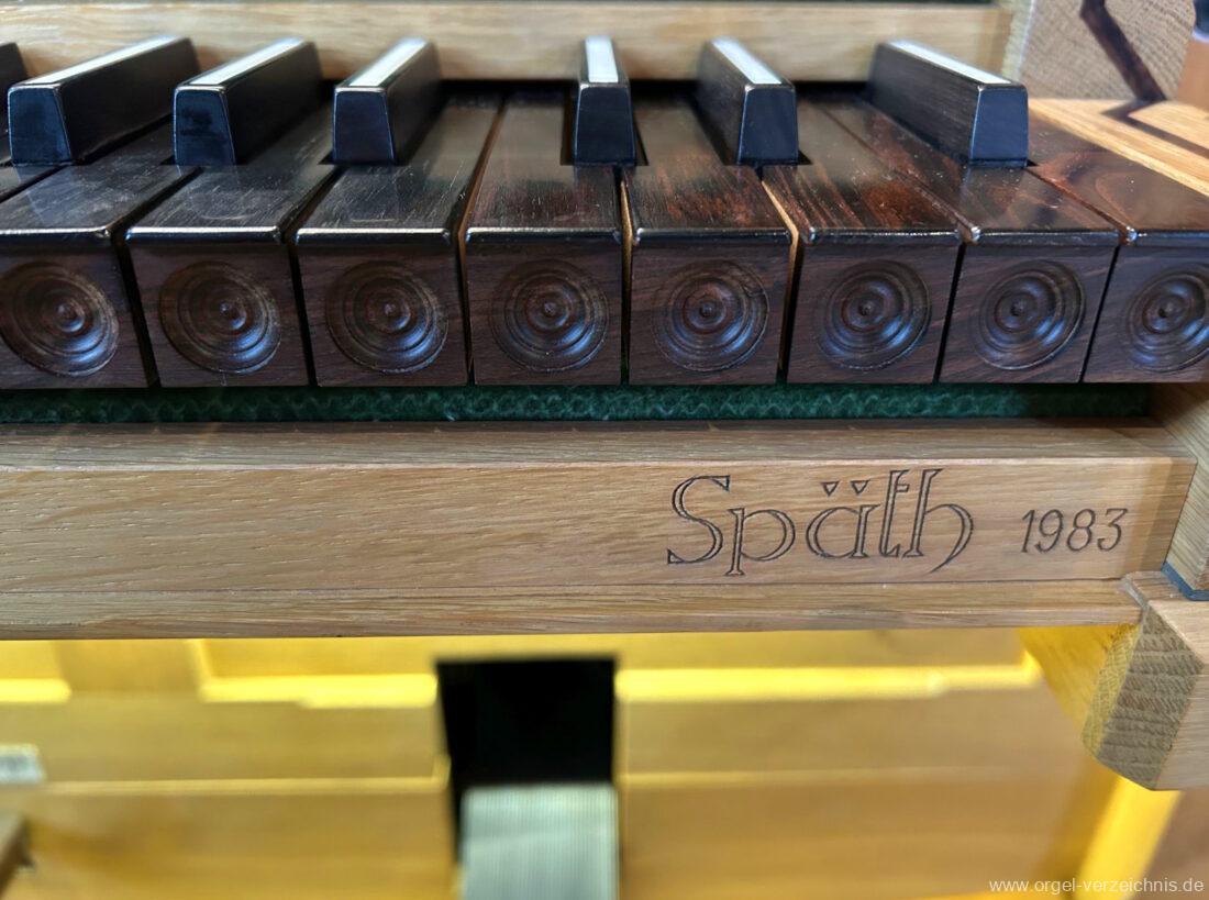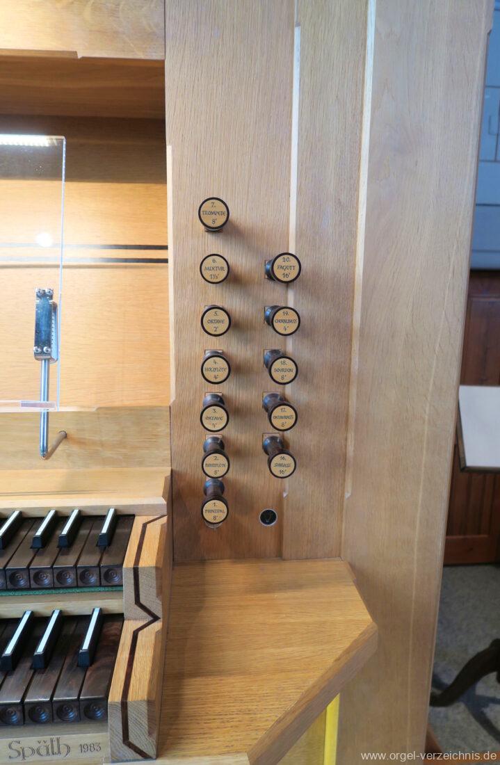 1983 rein mechanische Schleifladenorgel, erbaut mit zweiteiligem Prospekt um das Rosettenfenster und mittig fest in das rechte Gehäuse seitlich eingebautem Spieltisch durch Späth Orgelbau AG (Rapperswil) II/20 + 1 Vorabzug.