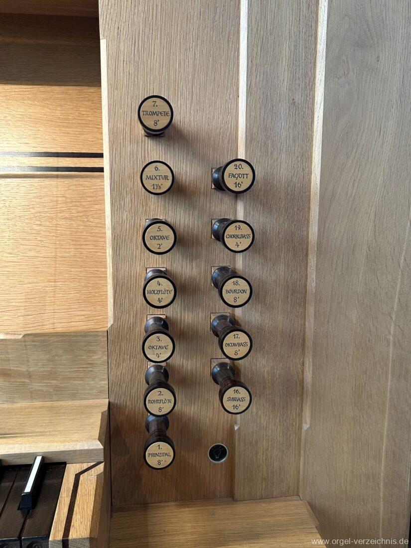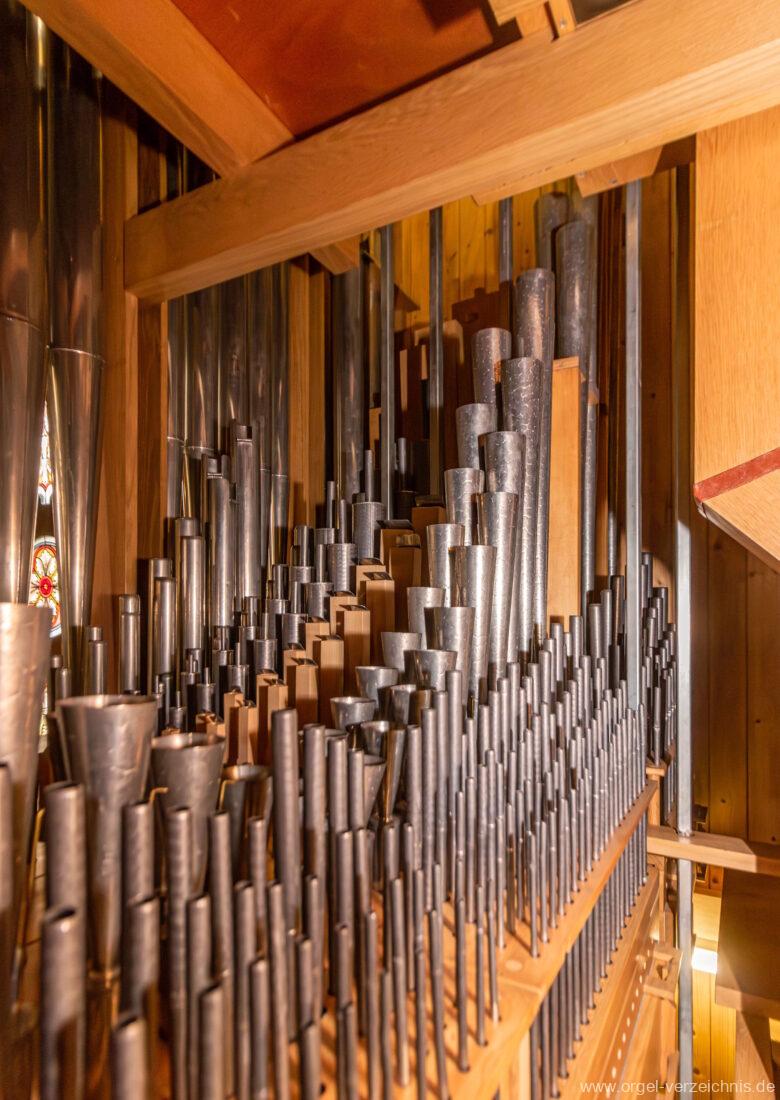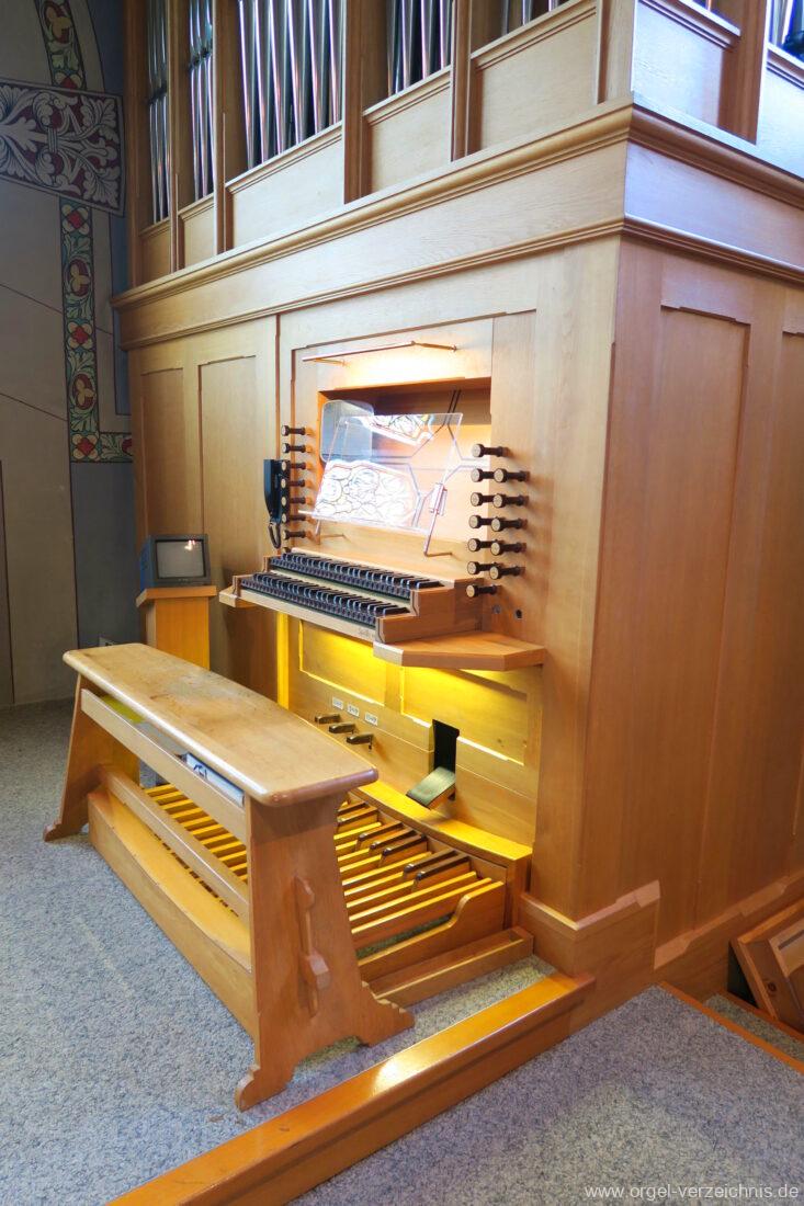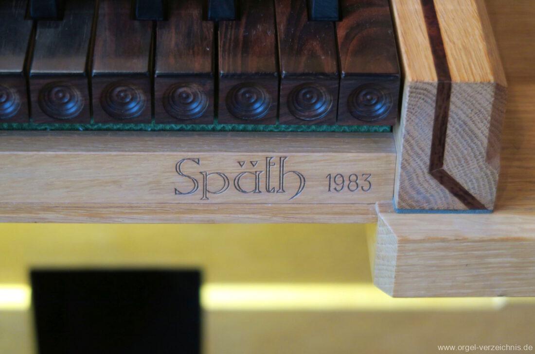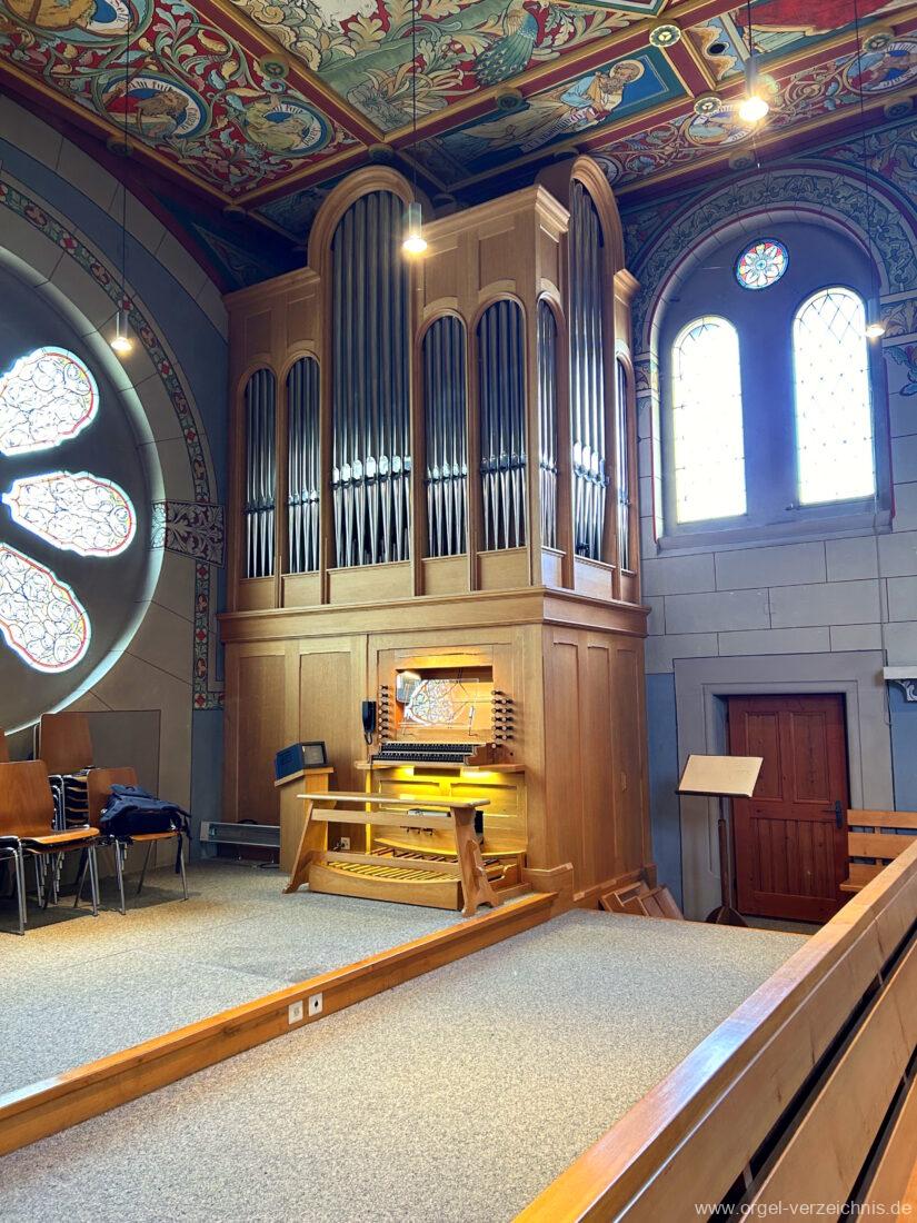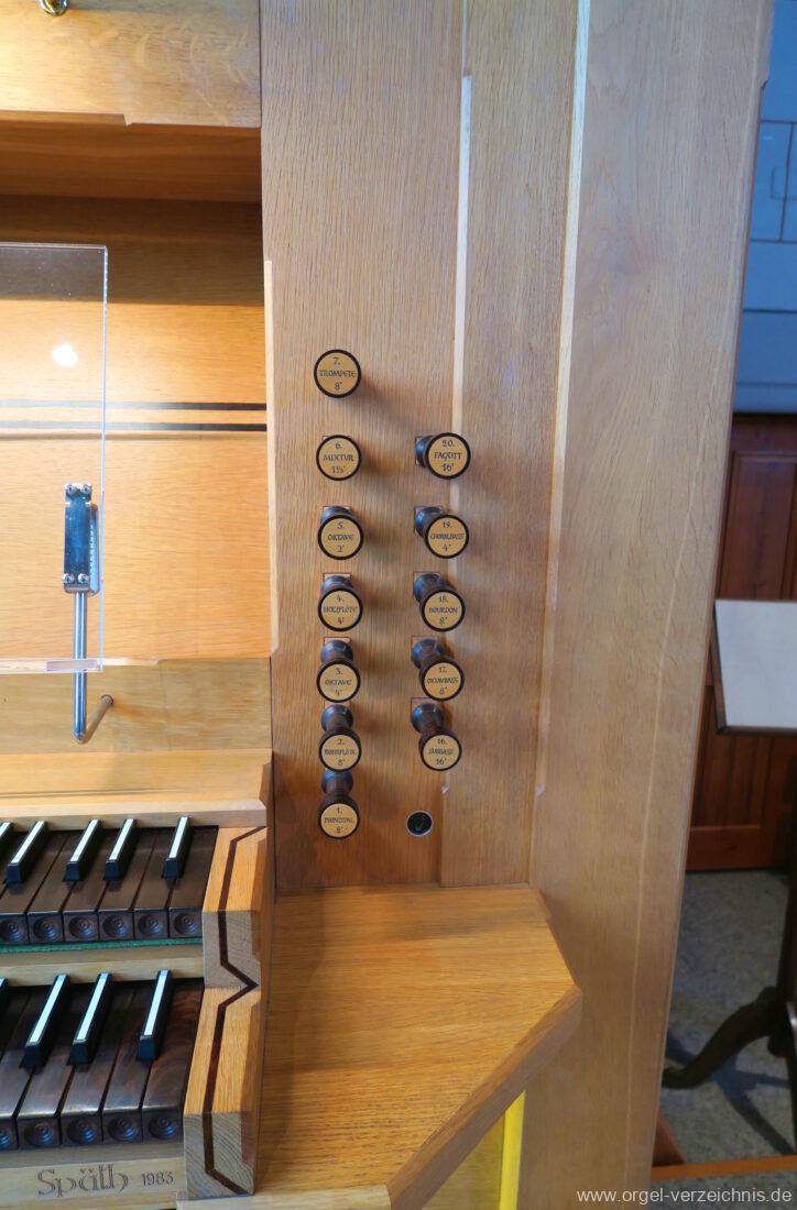 1983 rein mechanische Schleifladenorgel, erbaut mit zweiteiligem Prospekt um das Rosettenfenster und mittig fest in das rechte Gehäuse seitlich eingebautem Spieltisch durch Späth Orgelbau AG (Rapperswil) II/20 + 1 Vorabzug.