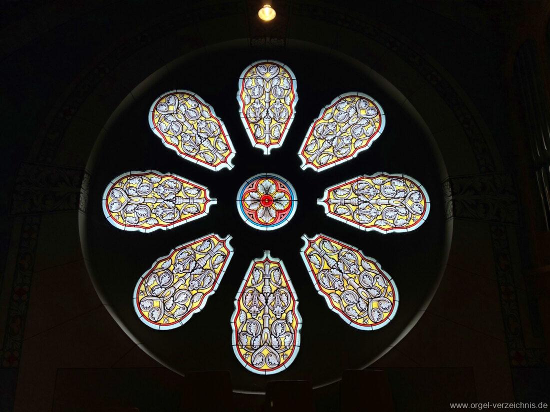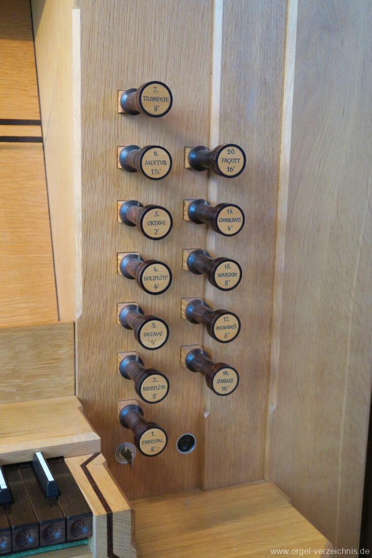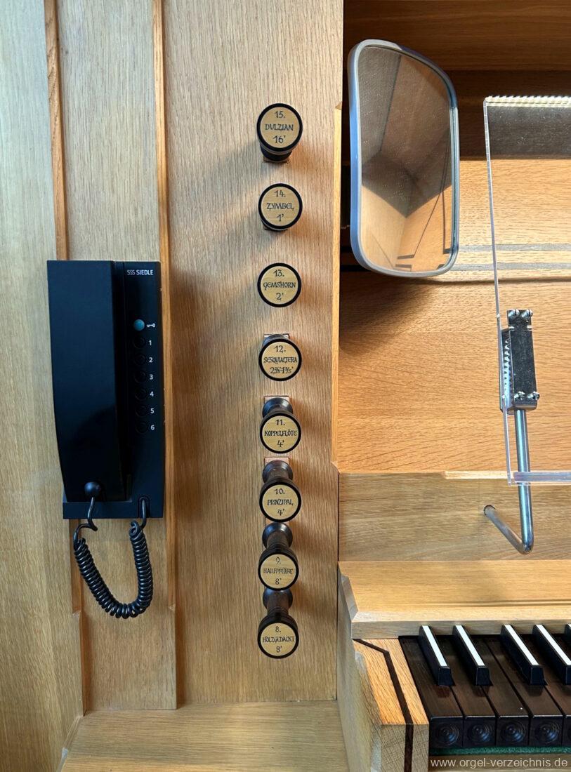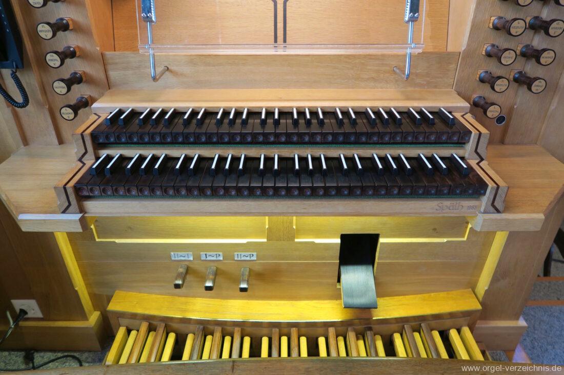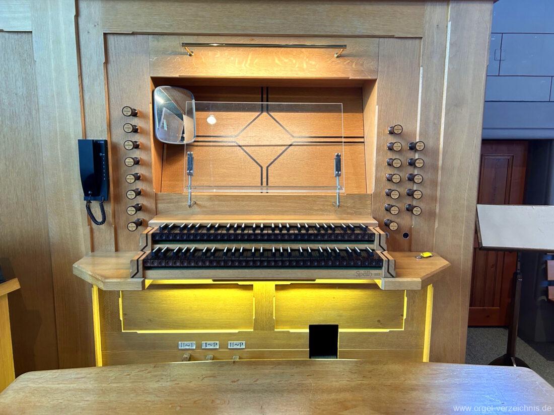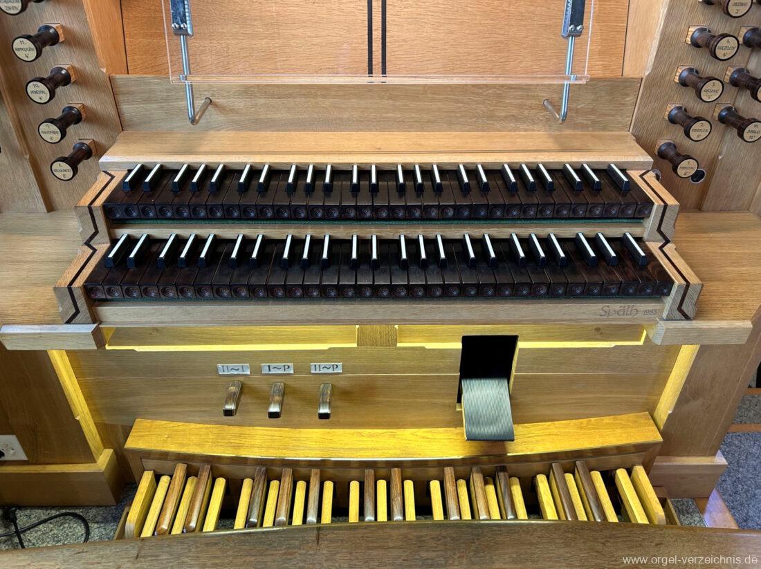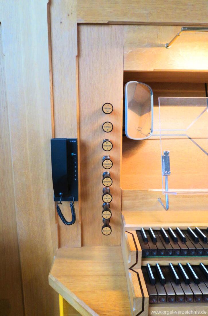 1983 rein mechanische Schleifladenorgel, erbaut mit zweiteiligem Prospekt um das Rosettenfenster und mittig fest in das rechte Gehäuse seitlich eingebautem Spieltisch durch Späth Orgelbau AG (Rapperswil) II/20 + 1 Vorabzug.