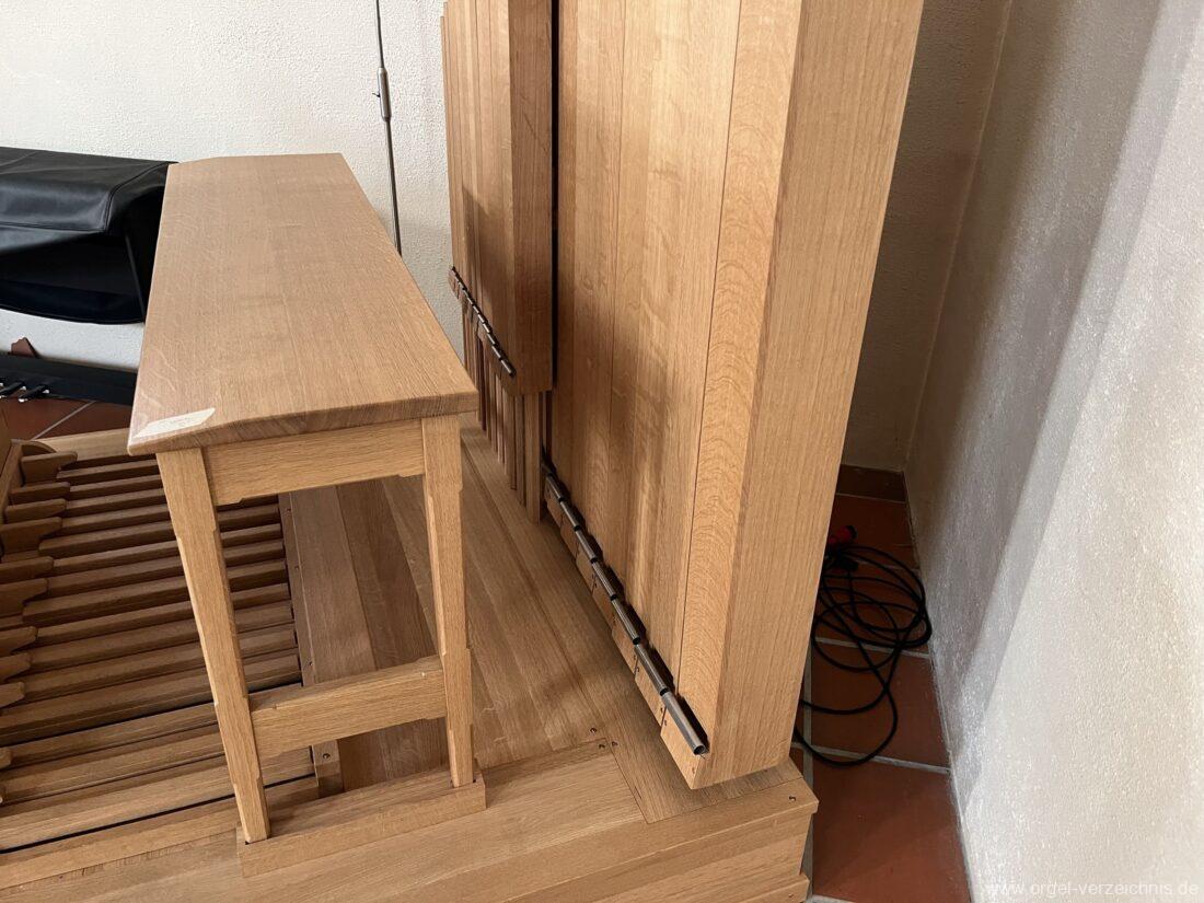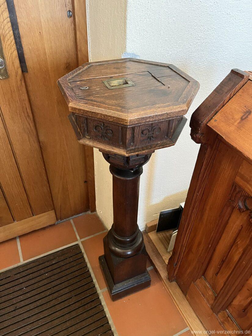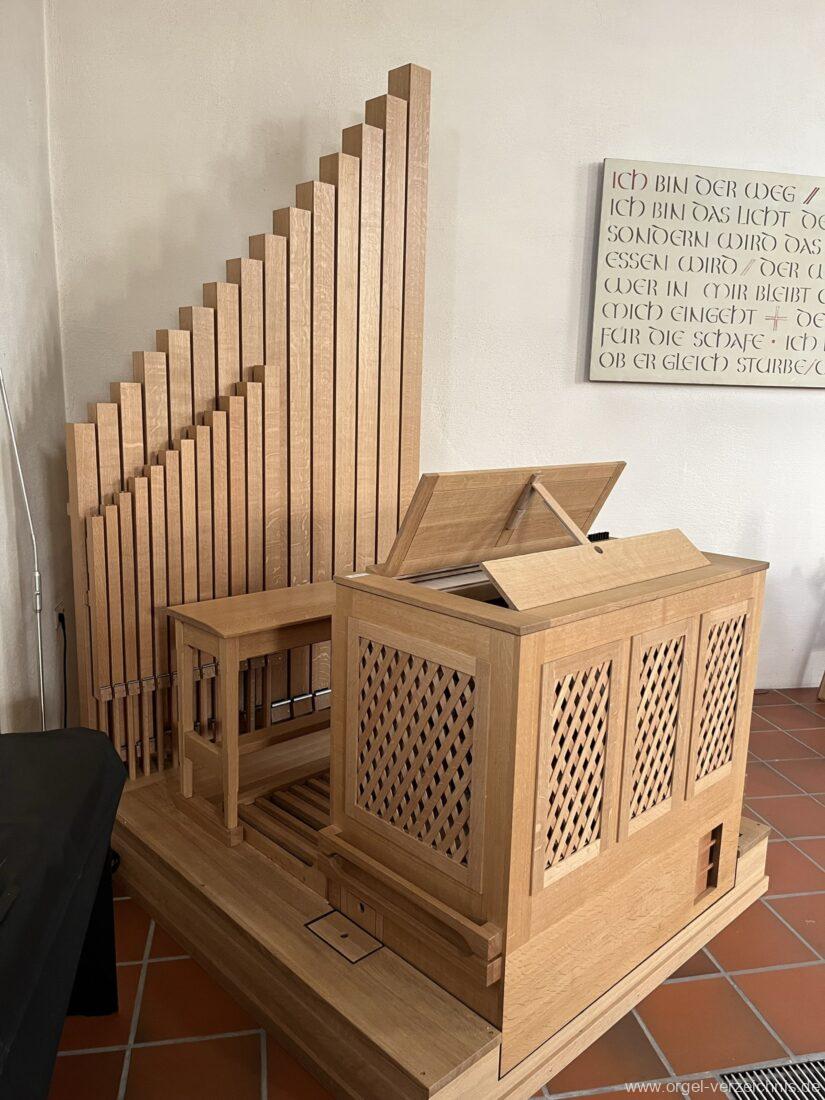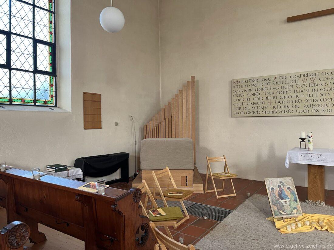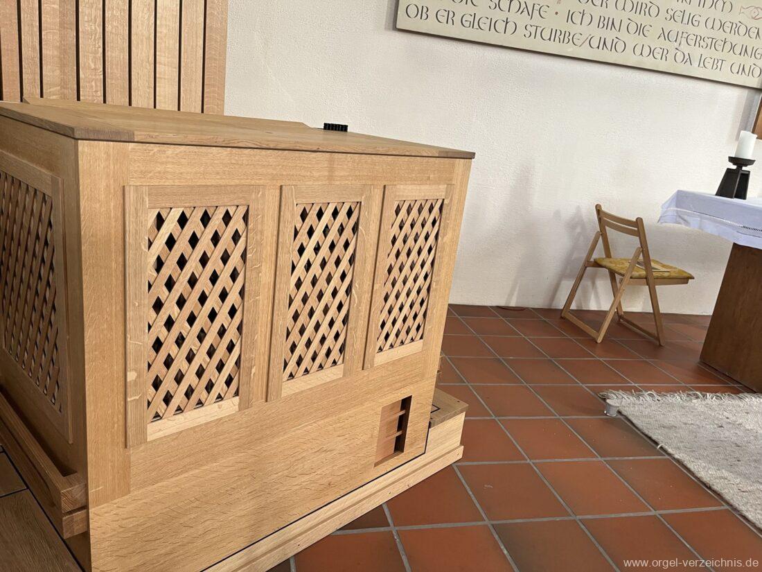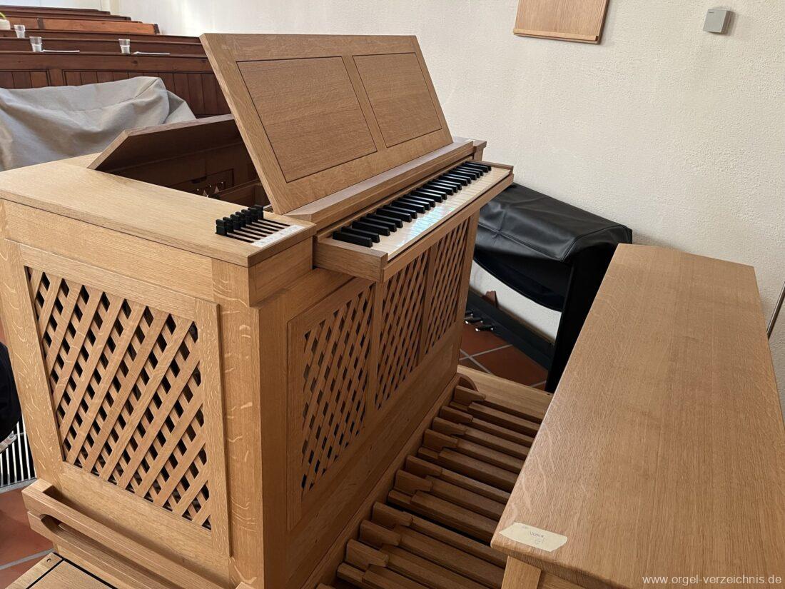 2022 mechanische Schleifladenorgel mit Schleifenteilung, erbaut in der Art einer Truhenorgel (Eichenholz-Gehäuse) mit angehängtem Pedal und eigenem Pedalregister durch Orgelbau Jens Steinhoff (Schwörstadt) I/6 aP. Die Truhenorgel kann separiert werden und in anderen Kirchen der Region zu Konzerten und Veranstaltungen genutzt werden – Einweihung am 13. März 2022 mit LKMD Christoph Bogon.