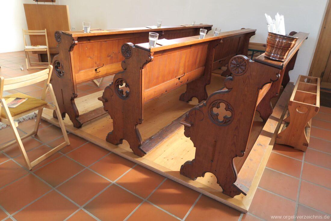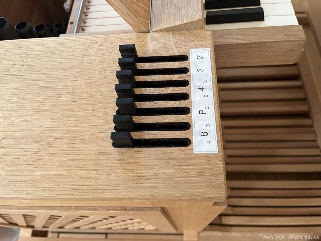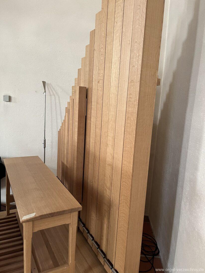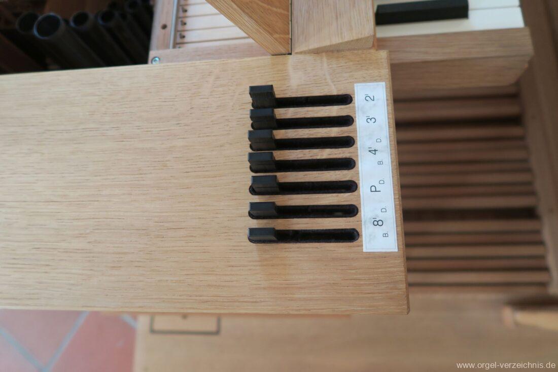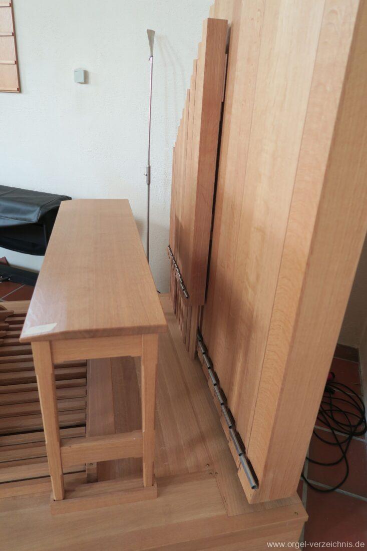 Manual (Truhenorgel) C – f“‘Principal 8′ Disc. ab c‘ Gedeckt 8′ Bass/Disc. Gedeckt 4′ Bass/Disc. Quinte 3′ Disc. ab c‘ Octav 2′ Bass/Disc. C – F gedeckt