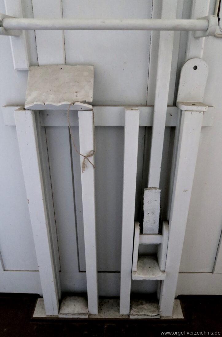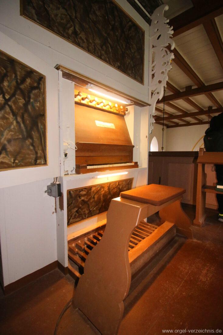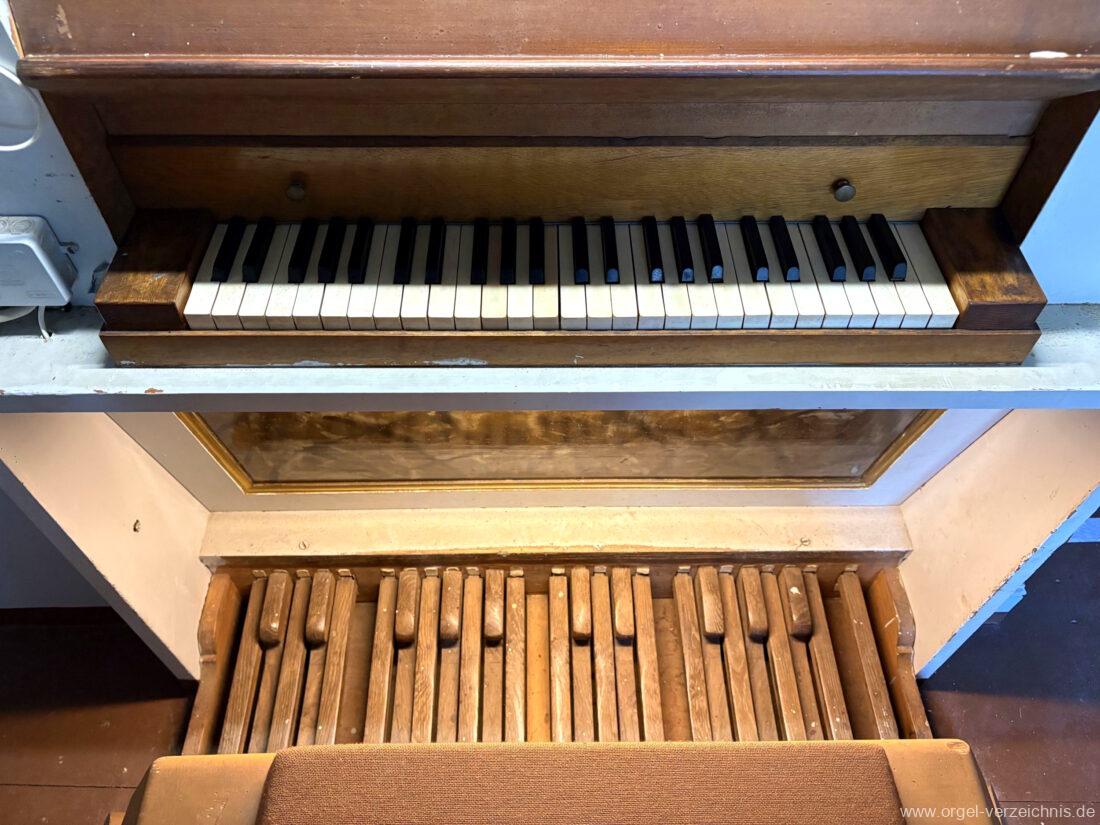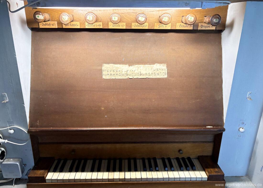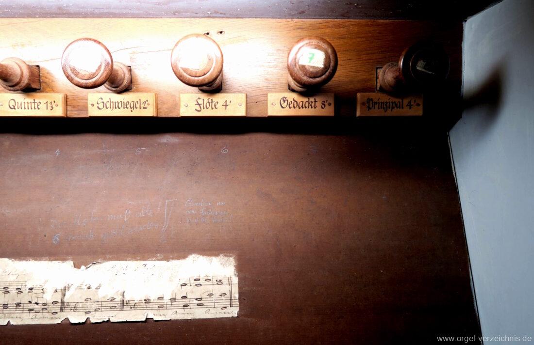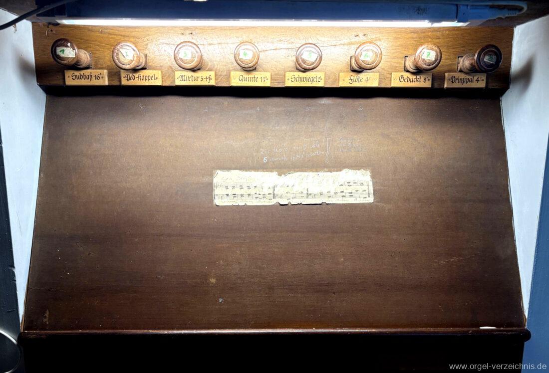 Manual C – c“‘Gedackt 8′ Holz ged. neu, ab c‘ Metall ged. neu Prinzipal 4′ C Holz offen, CS – c“‘ Metall Prospekt – Anm. 1 Flöte 4′ C – H holz ged., ab c° Metall konisch Schwiegel 2′ Metall Quinte 1 1/3′ neu Metall Mixtur 3-4f 1 1/3′ – rep. c°/c’/f“, ab c° 4f