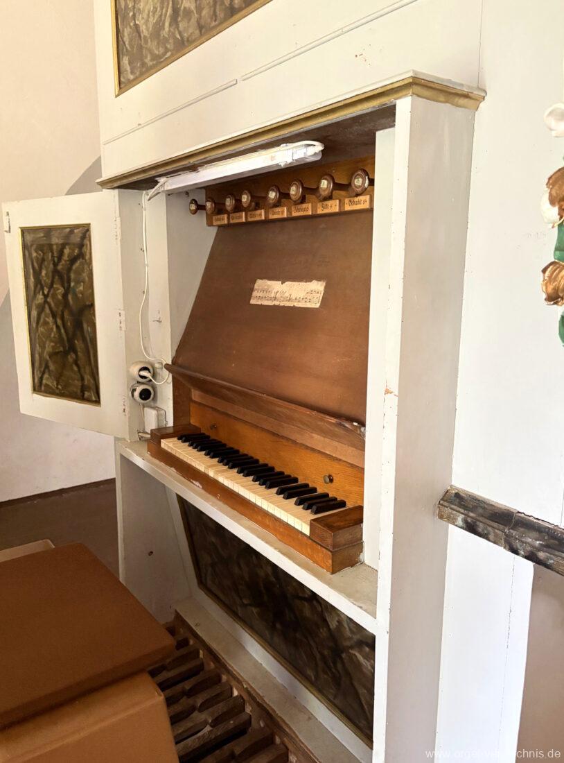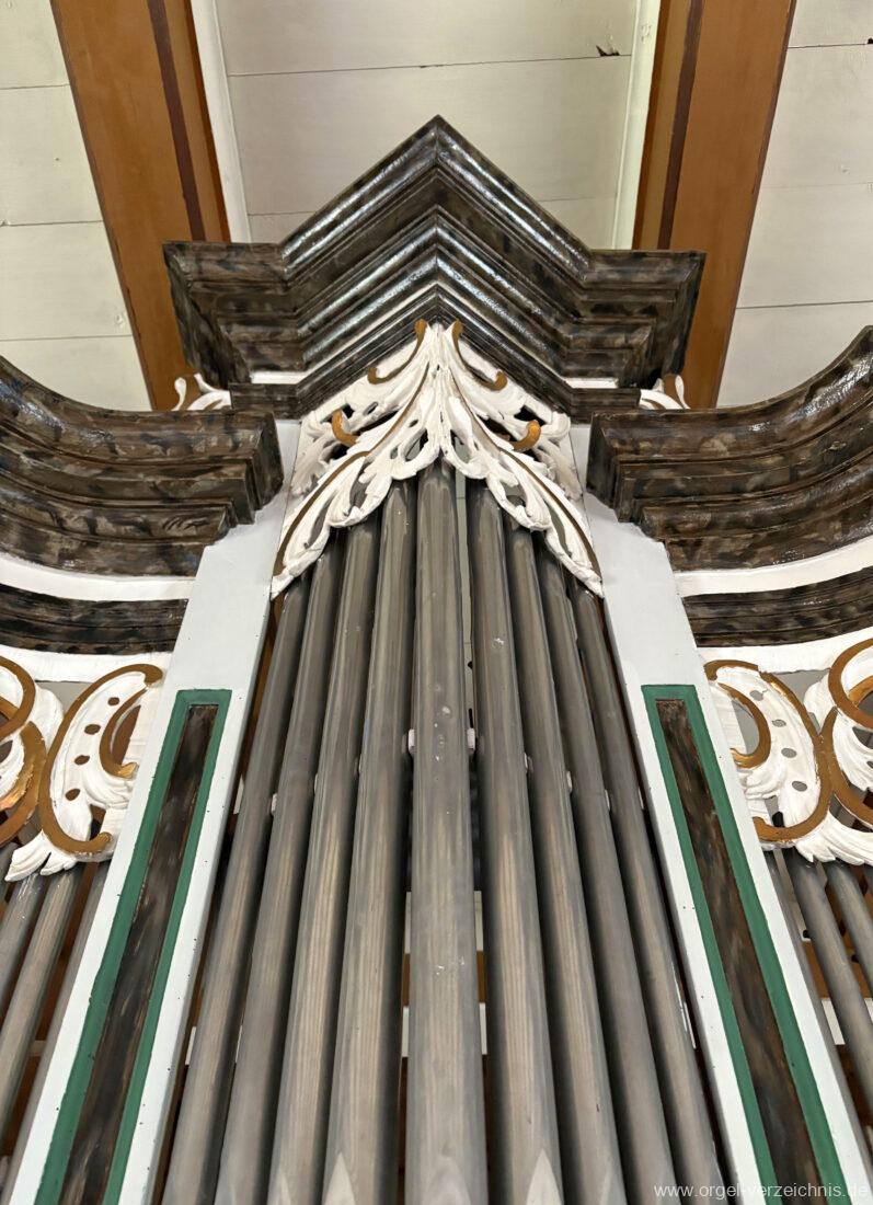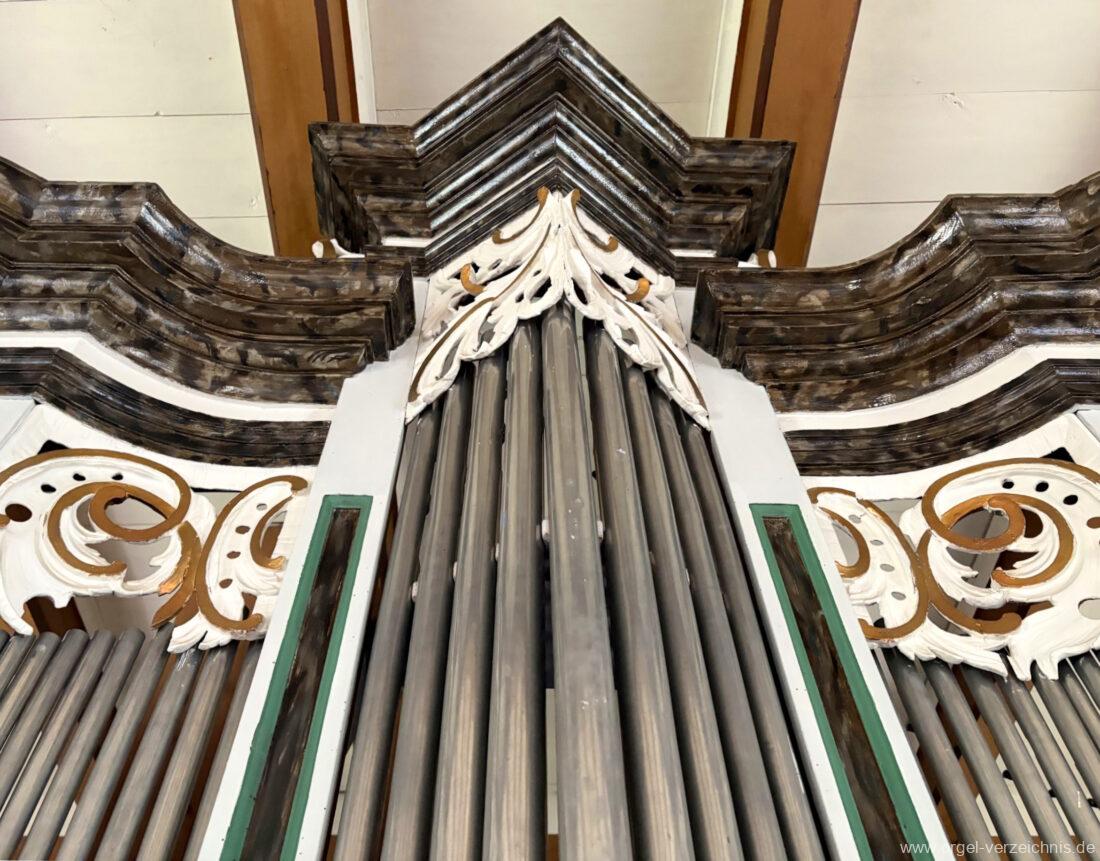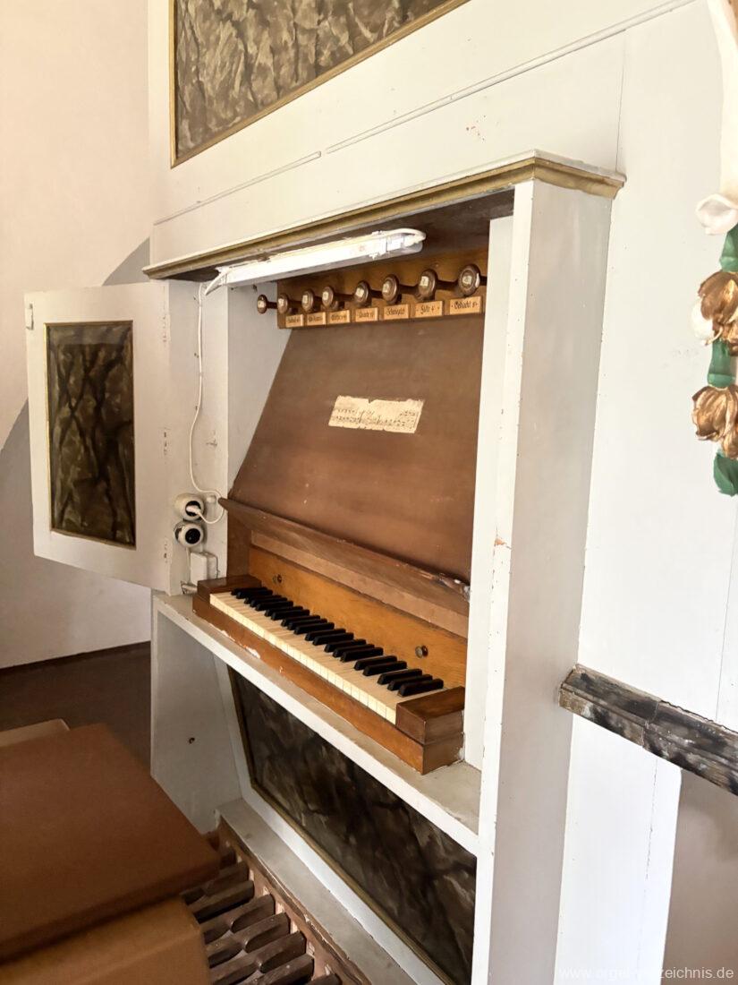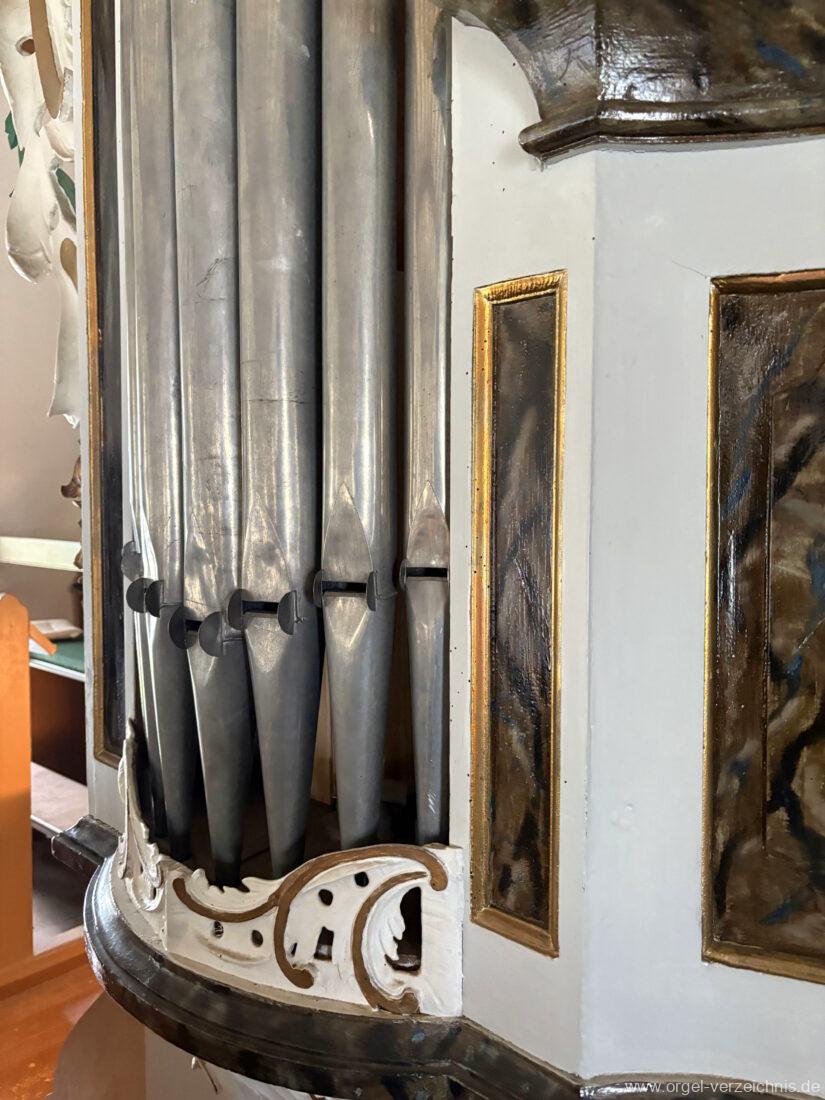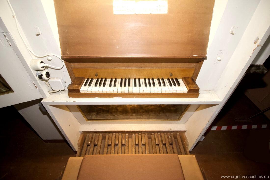 Manual C – c“‘Gedackt 8′ Holz ged. neu, ab c‘ Metall ged. neu Prinzipal 4′ C Holz offen, CS – c“‘ Metall Prospekt – Anm. 1 Flöte 4′ C – H holz ged., ab c° Metall konisch Schwiegel 2′ Metall Quinte 1 1/3′ neu Metall Mixtur 3-4f 1 1/3′ – rep. c°/c’/f“, ab c° 4f