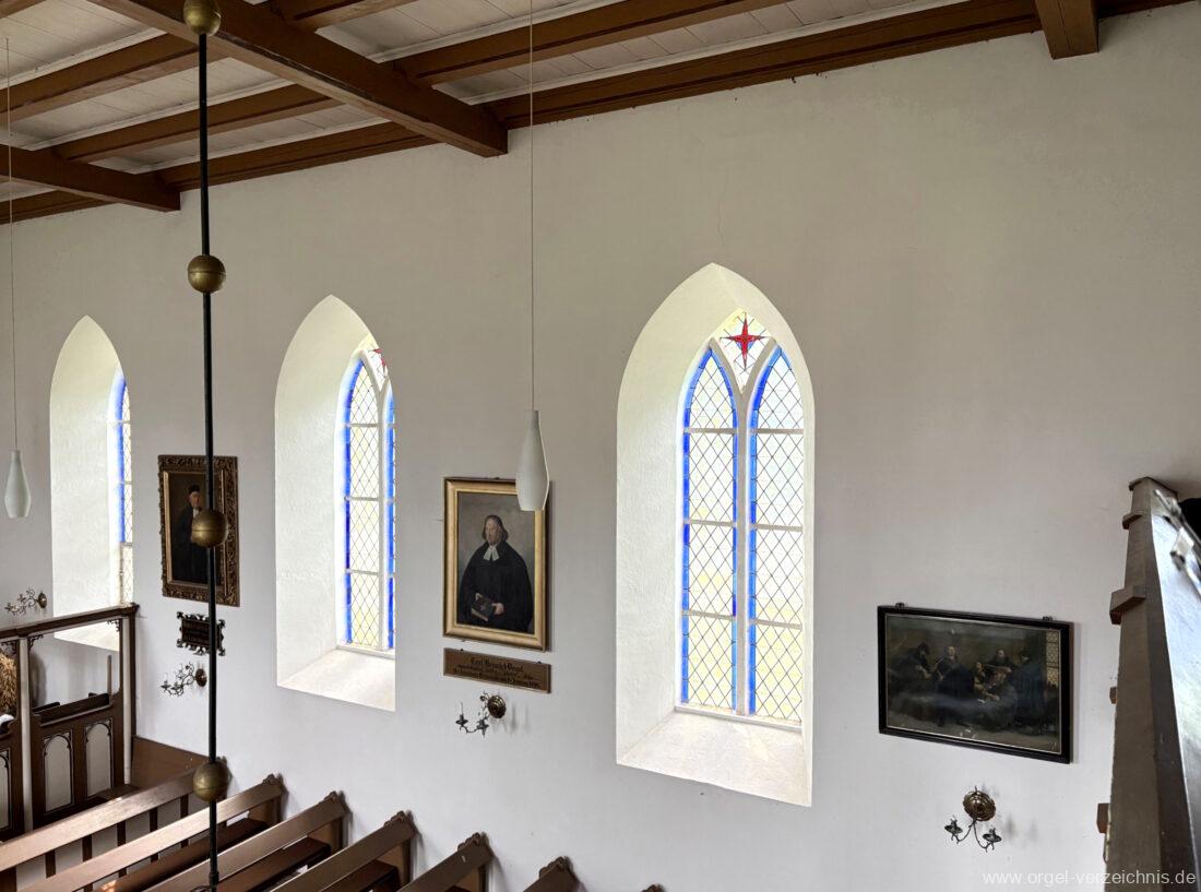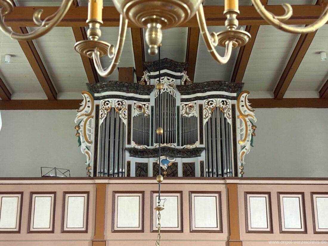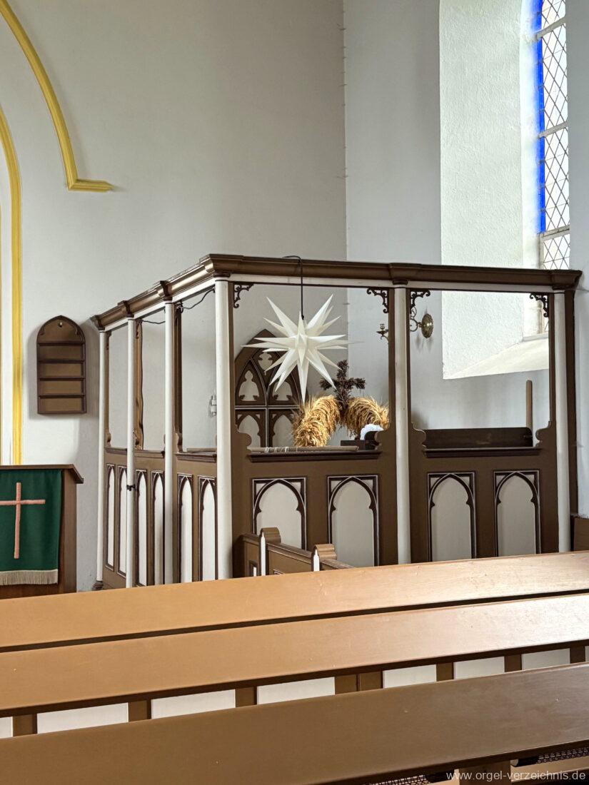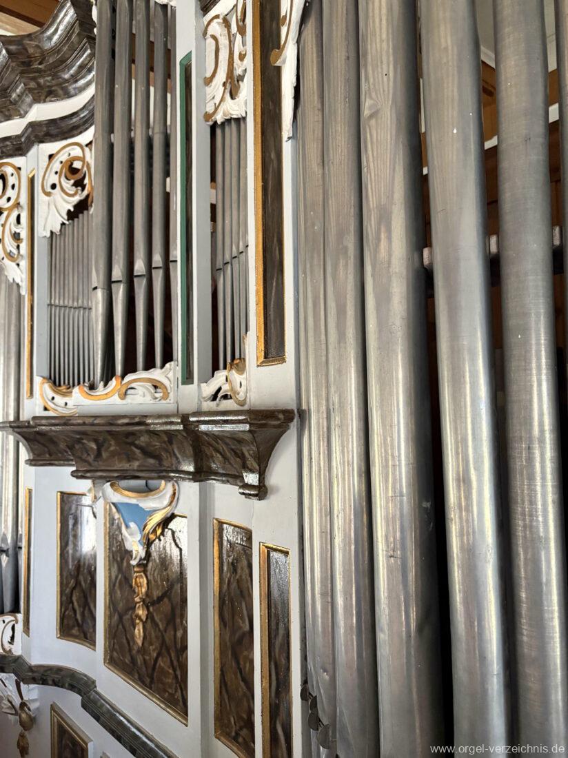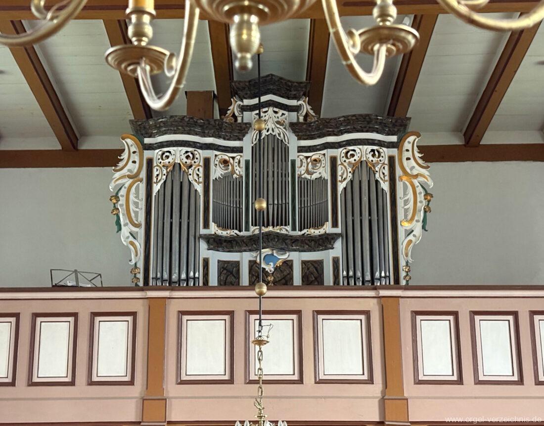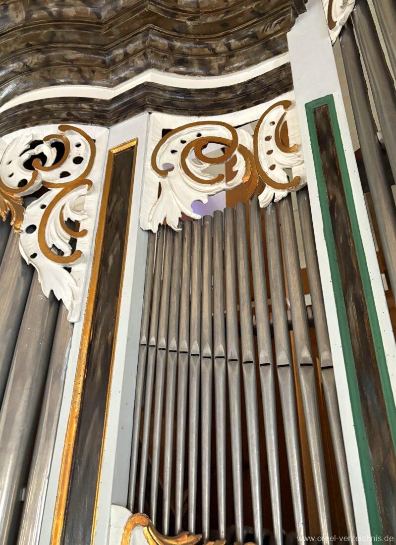 Manual C – c“‘Gedackt 8′ Holz ged. neu, ab c‘ Metall ged. neu Prinzipal 4′ C Holz offen, CS – c“‘ Metall Prospekt – Anm. 1 Flöte 4′ C – H holz ged., ab c° Metall konisch Schwiegel 2′ Metall Quinte 1 1/3′ neu Metall Mixtur 3-4f 1 1/3′ – rep. c°/c’/f“, ab c° 4f