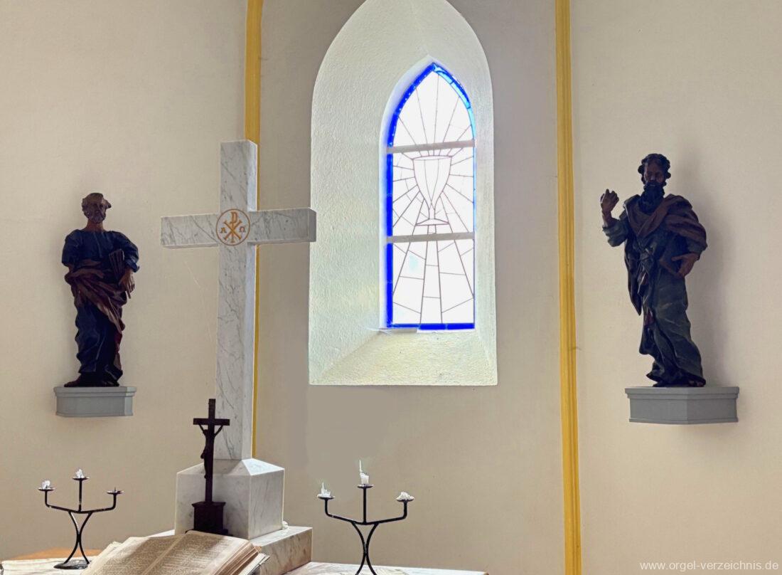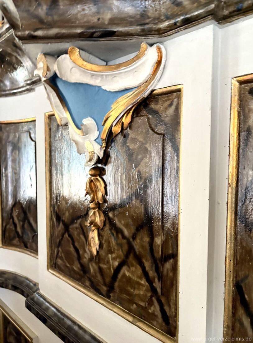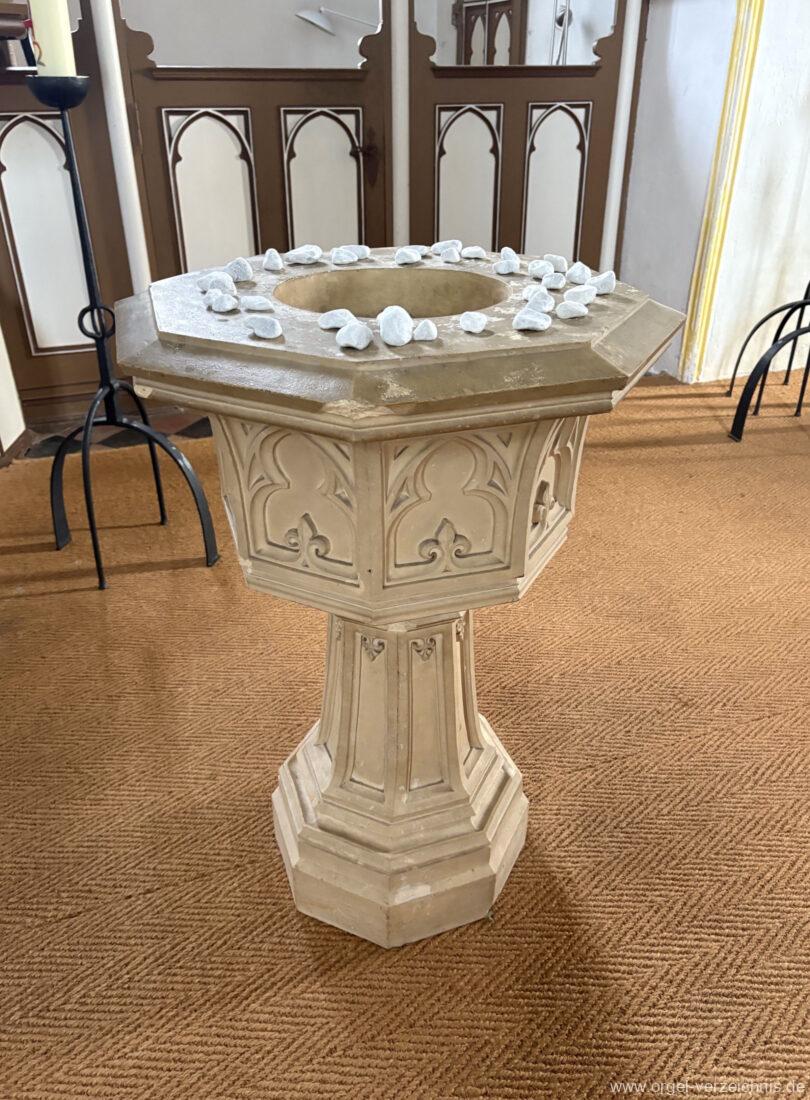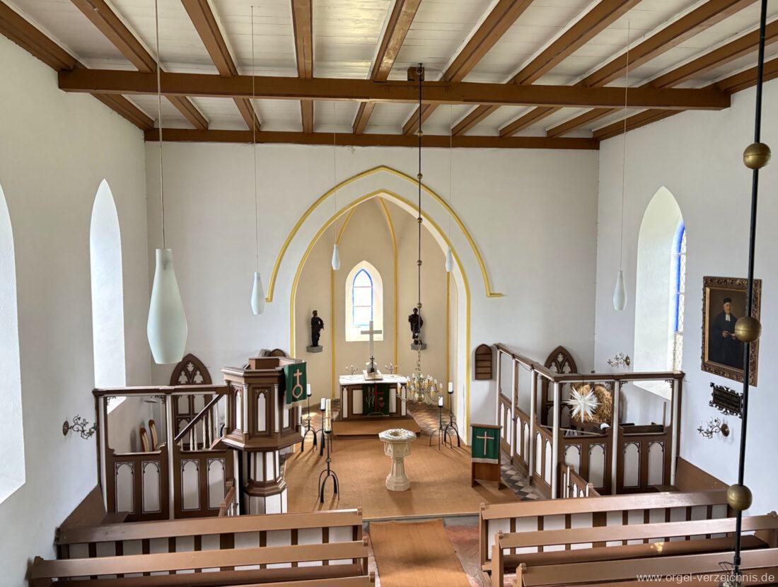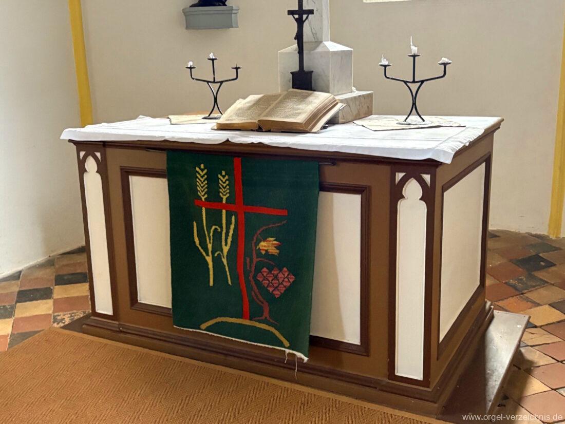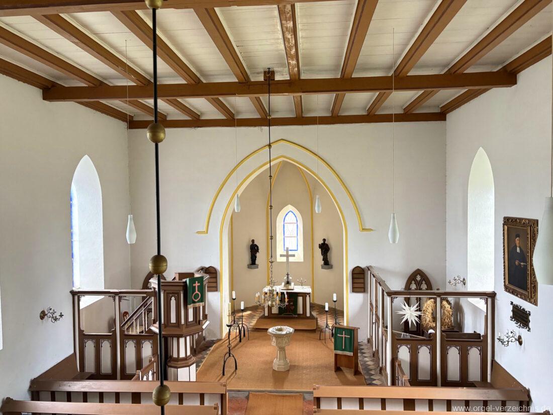 Manual C – c“‘Gedackt 8′ Holz ged. neu, ab c‘ Metall ged. neu Prinzipal 4′ C Holz offen, CS – c“‘ Metall Prospekt – Anm. 1 Flöte 4′ C – H holz ged., ab c° Metall konisch Schwiegel 2′ Metall Quinte 1 1/3′ neu Metall Mixtur 3-4f 1 1/3′ – rep. c°/c’/f“, ab c° 4f