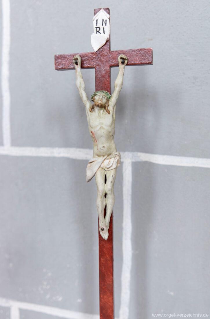 I Hauptwerk C – f“‘Principal. 8.‘ teilw. Prospekt Flöte. 8.‘ Holz offen Oktav. 4.‘ Piffaro 4′ u. 2′ Sesquialter 2 fach Mixtur 1 1/3′ IV – rep. c°/c’/c“/c“‘