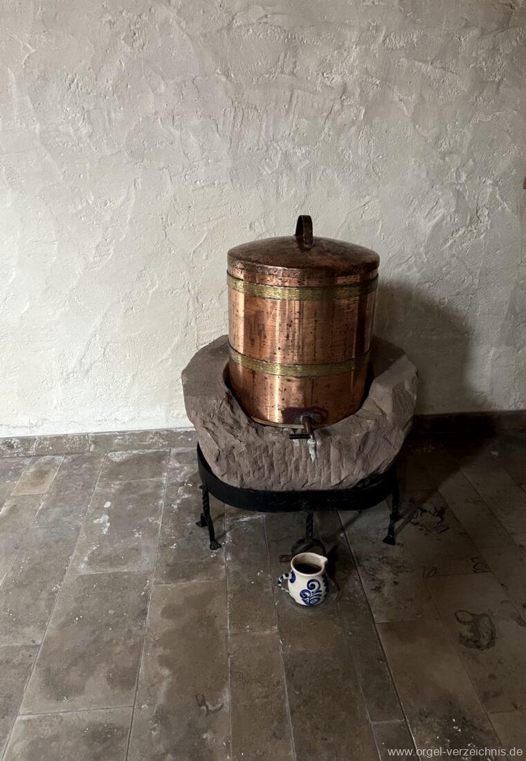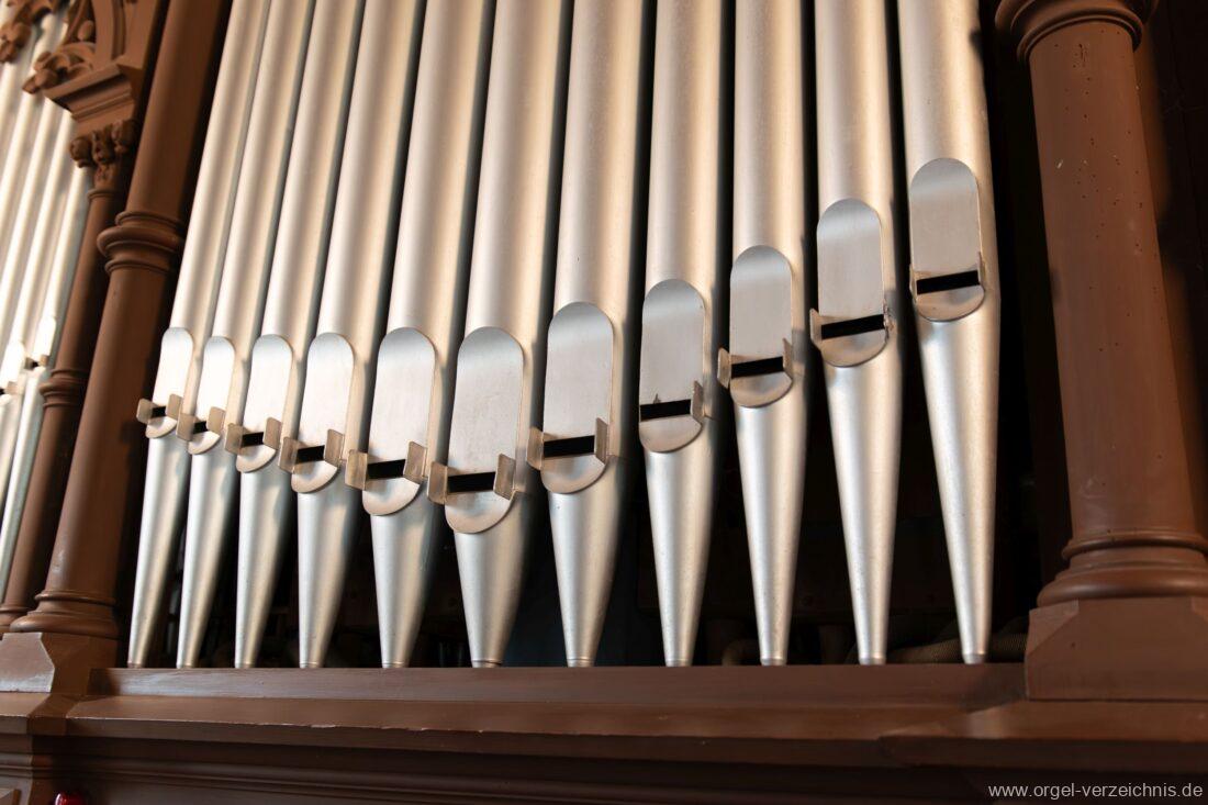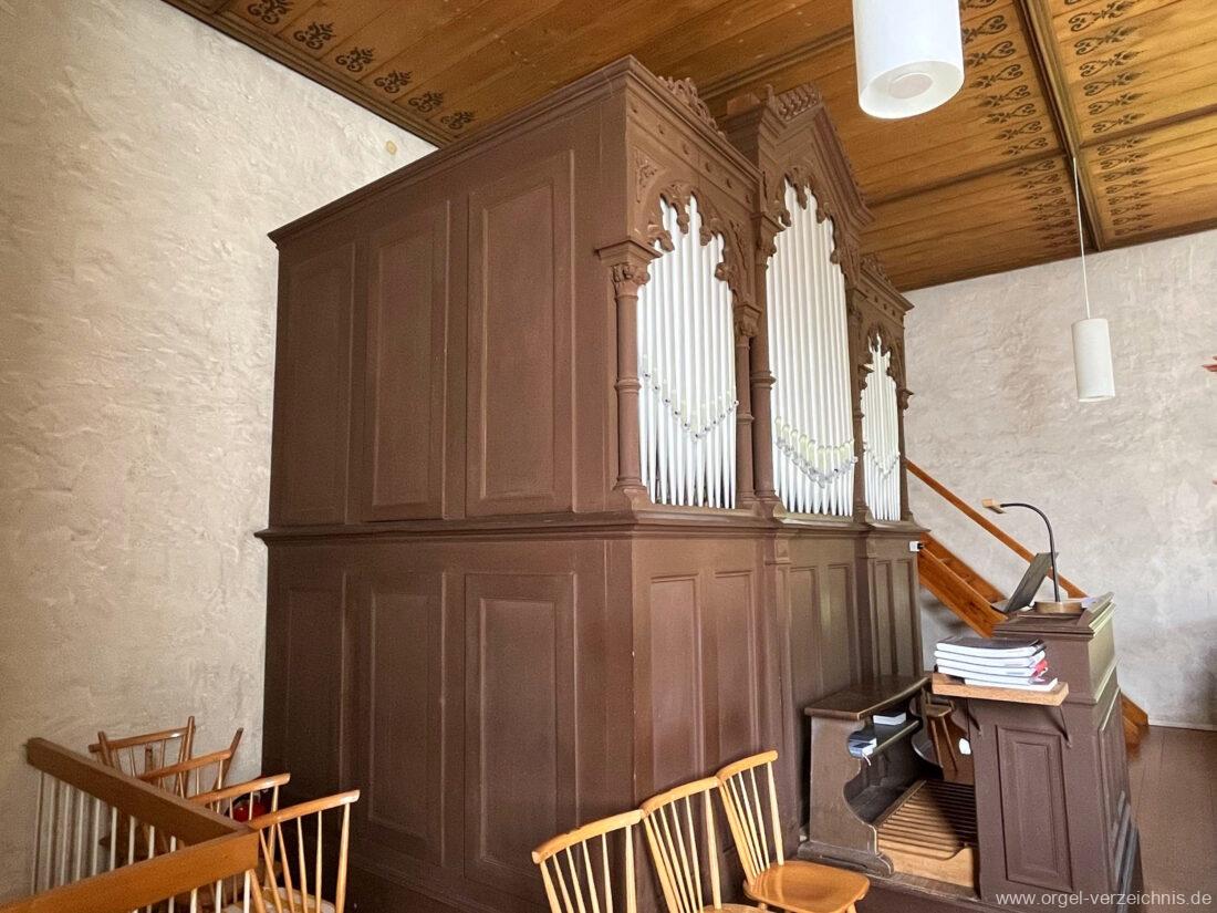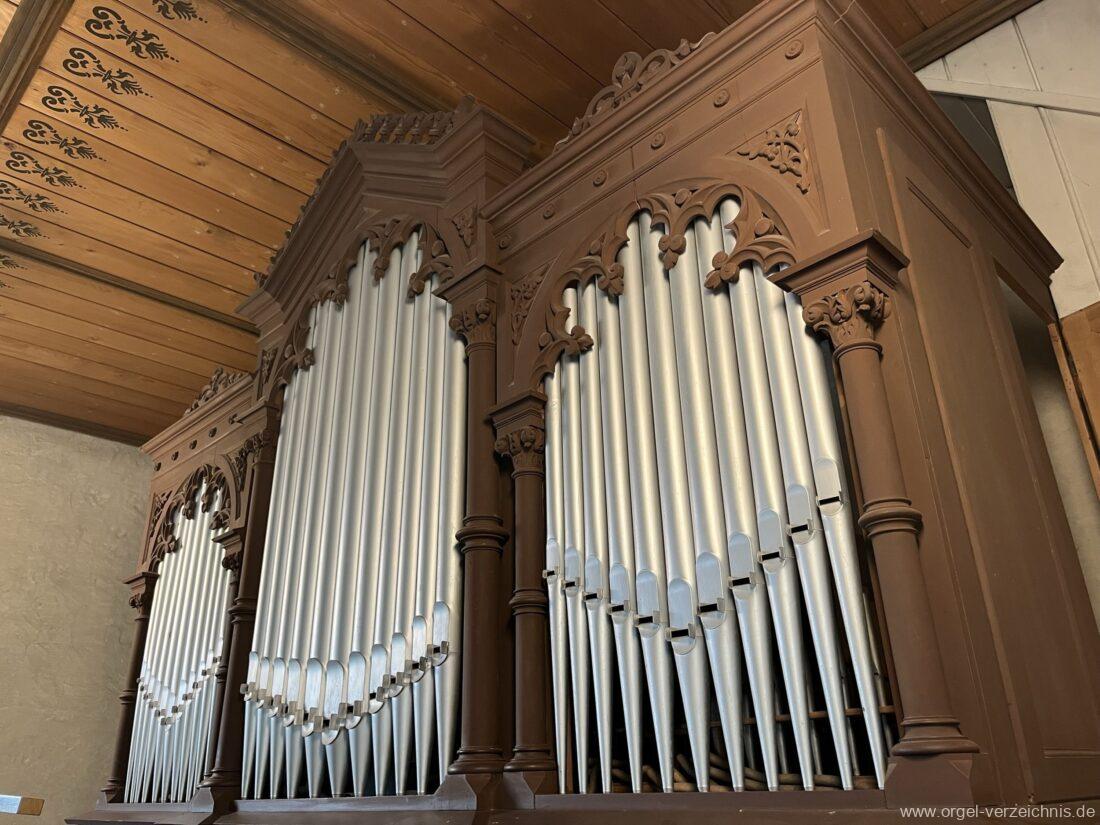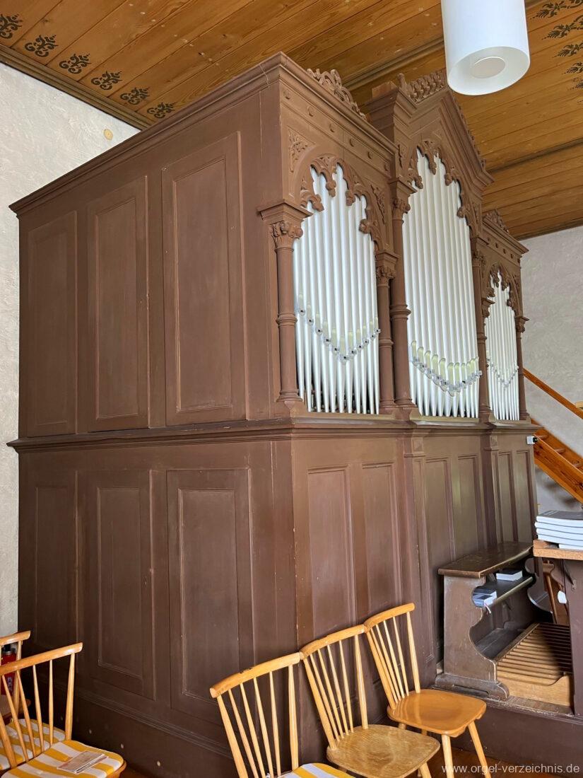 1891 mechanische Kegelladenorgel mit mittig freistehendem Spieltisch vor Prospekt, erbaut von Orgelbauer August Merklin (Freiburg im Breisgau) II/12.
