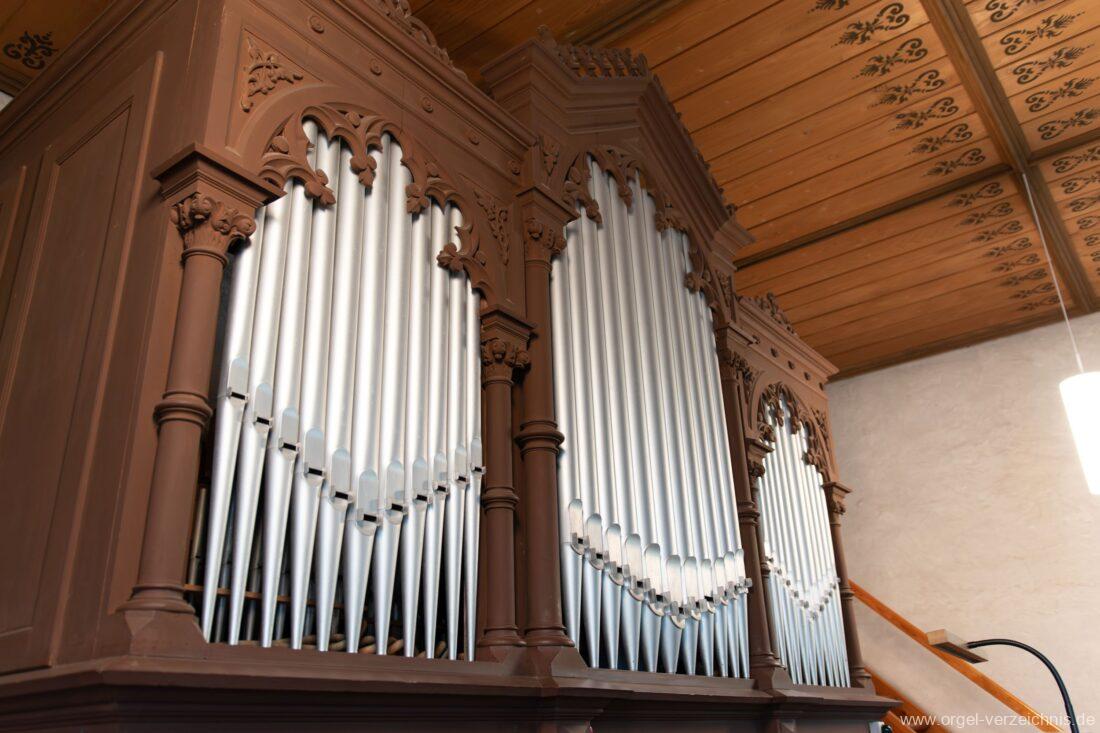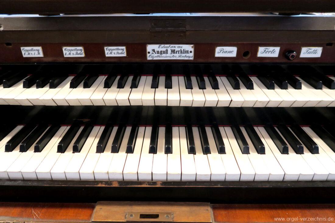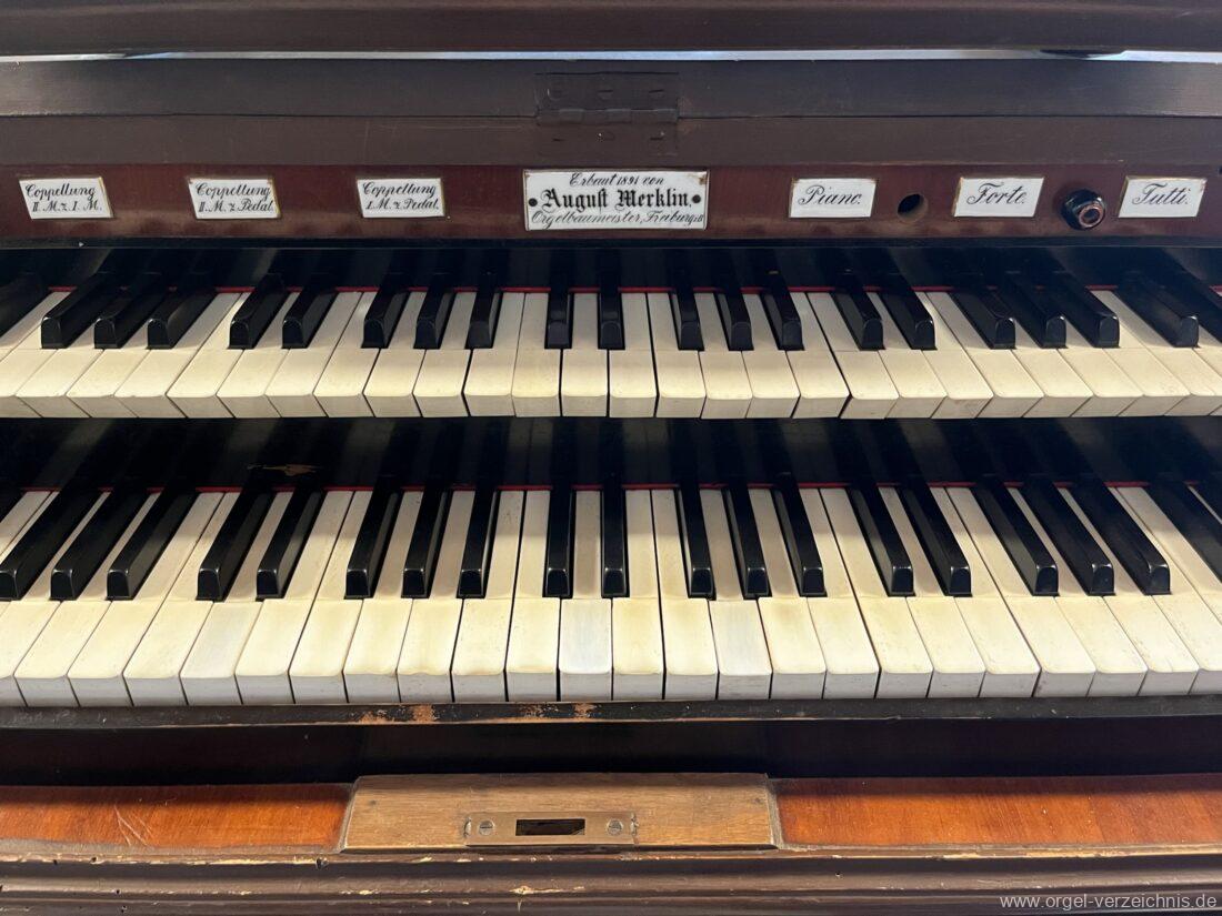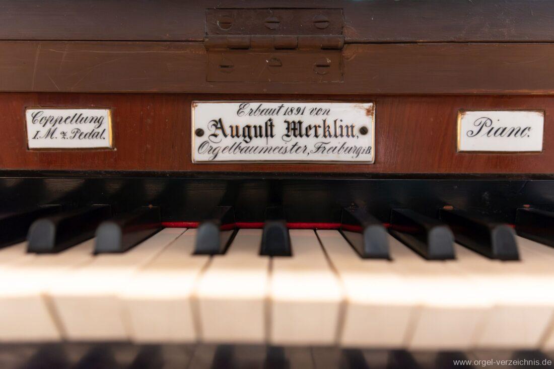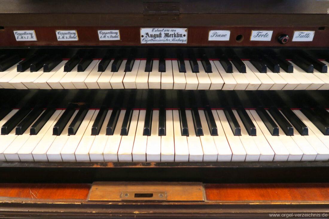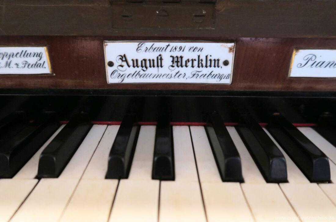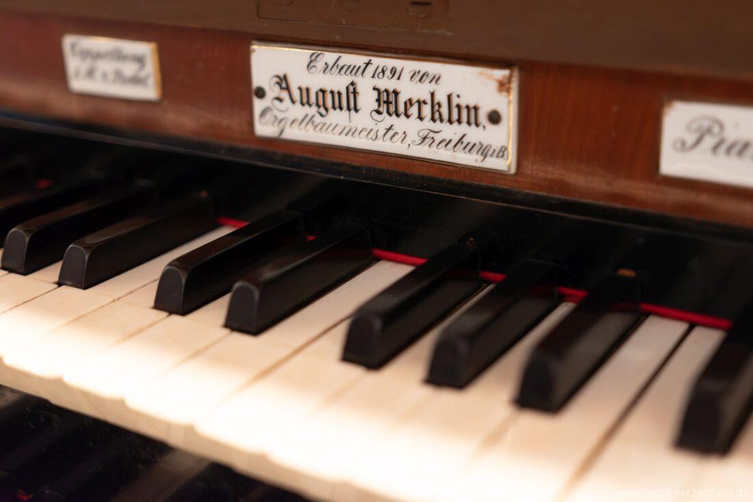 Die Originaldisposition der Orgel ist aktuell nicht bekannt. Die Merklin-Orgel der Galluskirche Ötlingen (Weil am Rhein), welche vier Jahre später mit ebenfalls 12 klingenden Registern erbaut wurde, dürfte mit ähnlicher Disposition errichtet worden sein → Link.