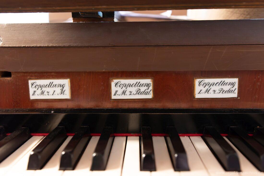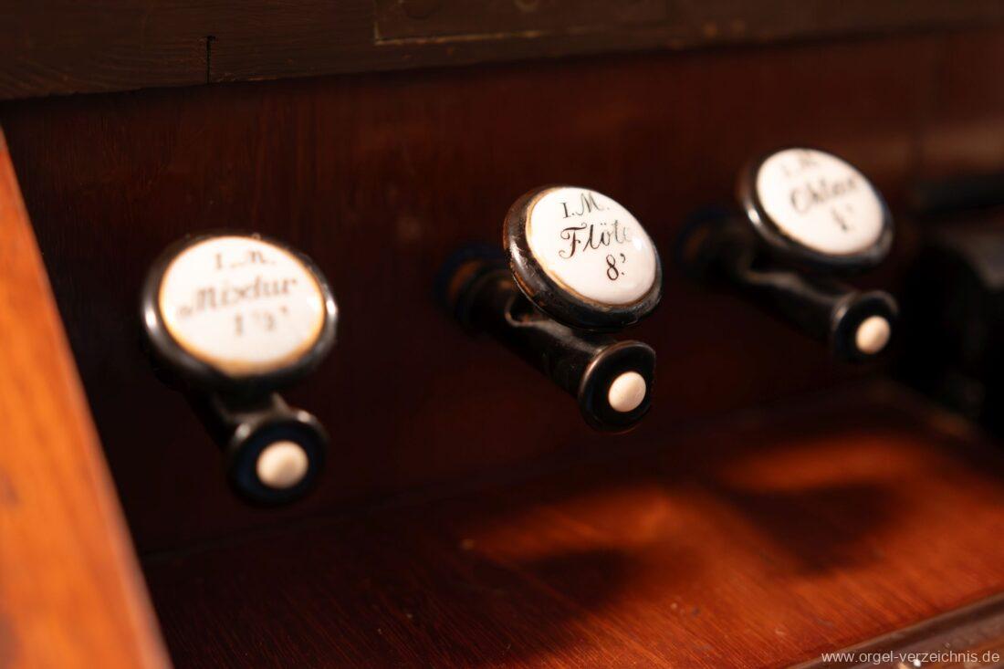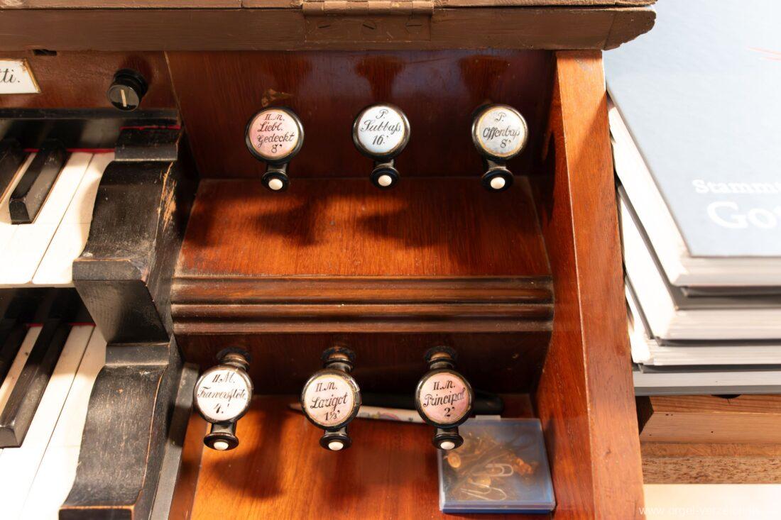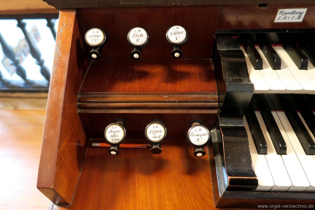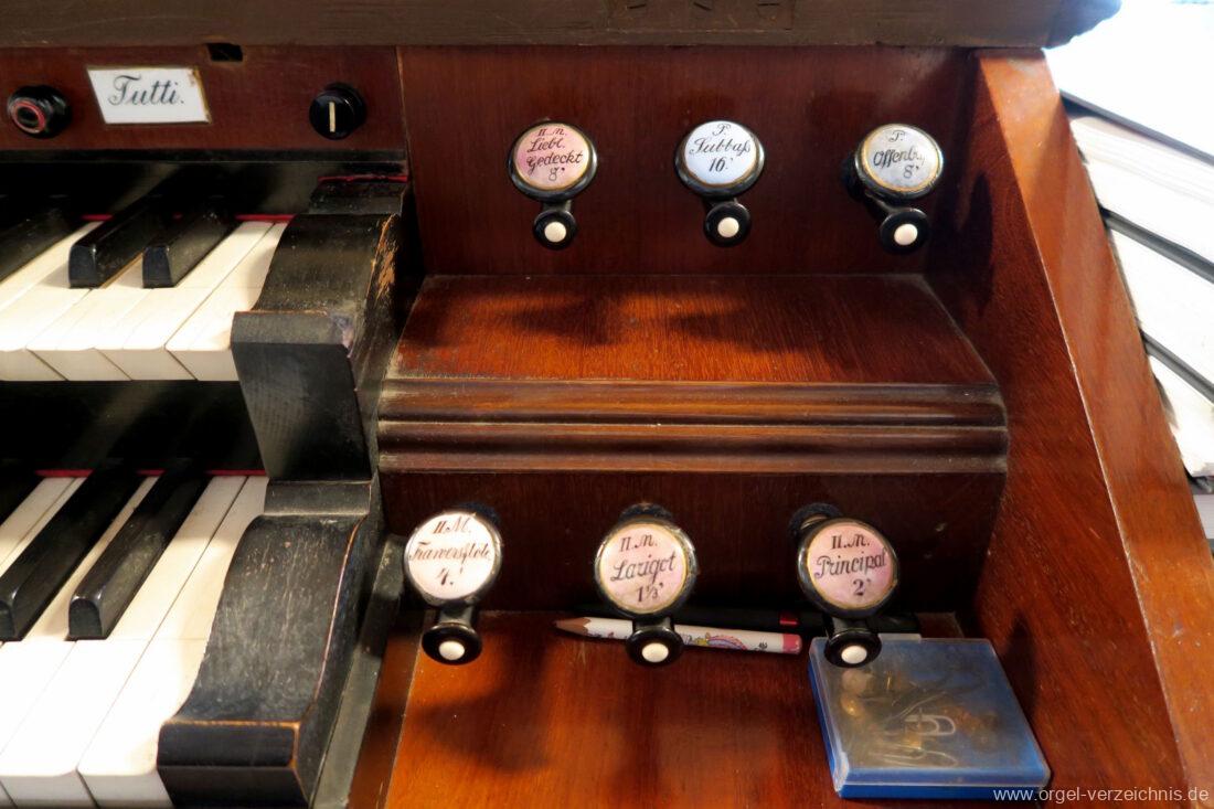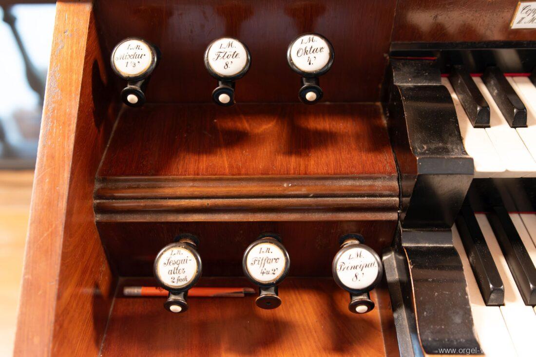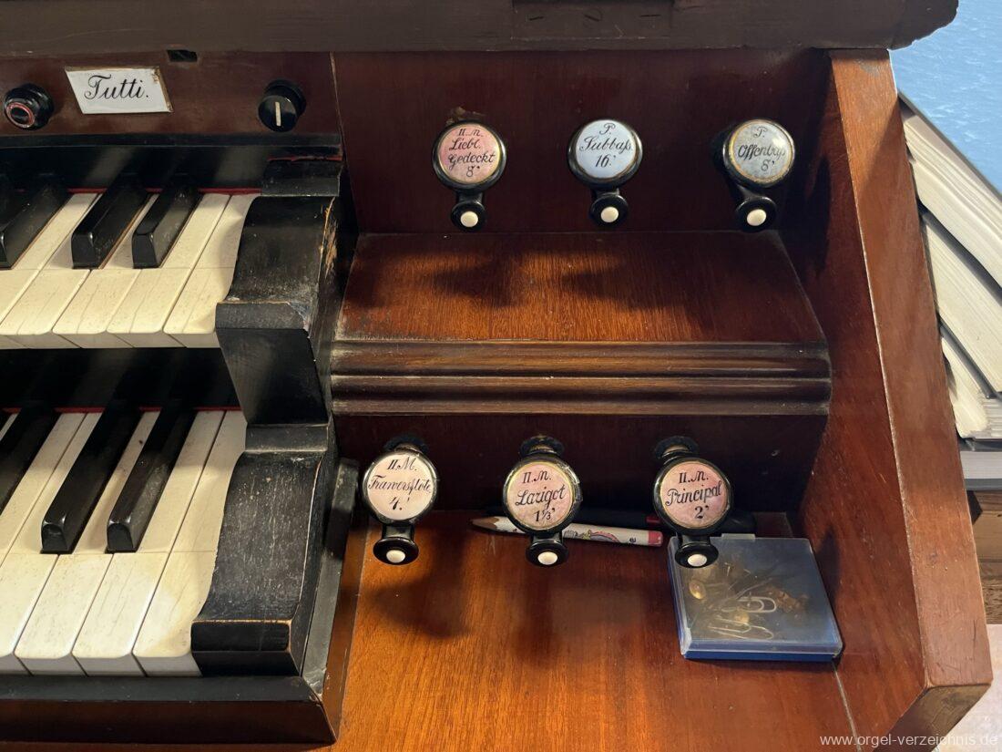 II.: Liebl. Gedeckt 8′ / Traversflöte. 4.‘ / Principal 2′ / Larigot 1 1/3′