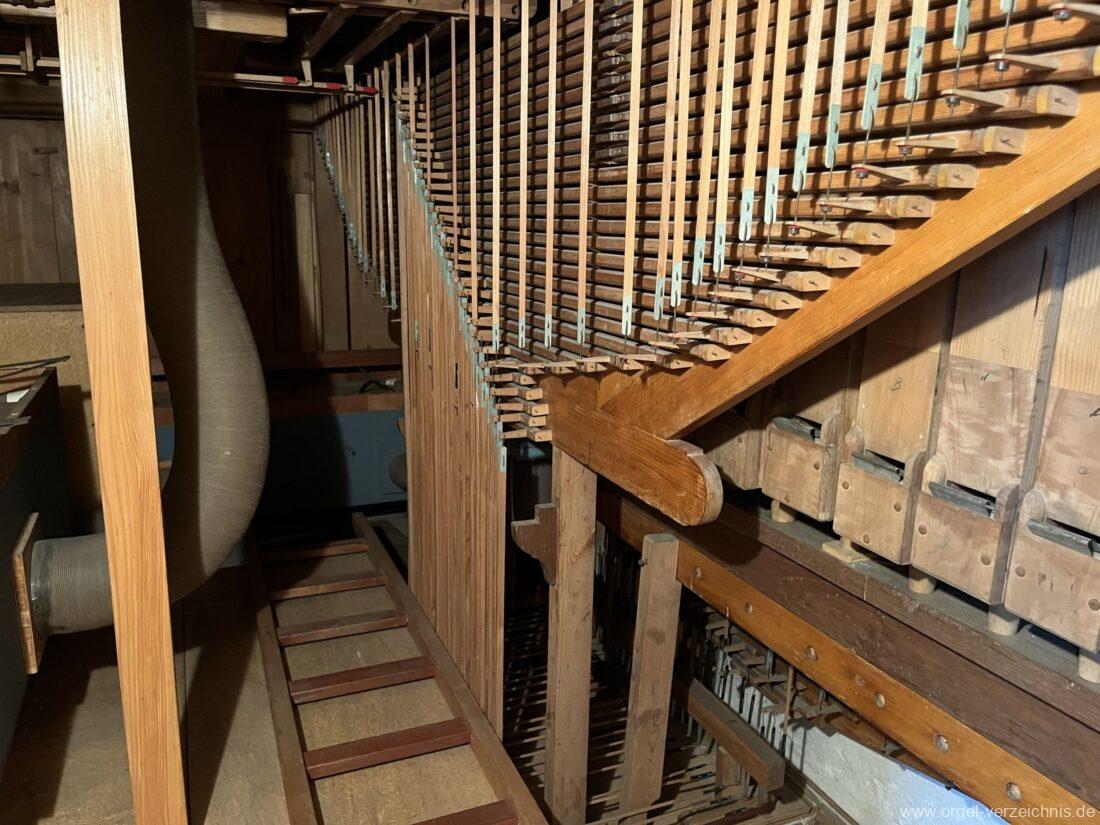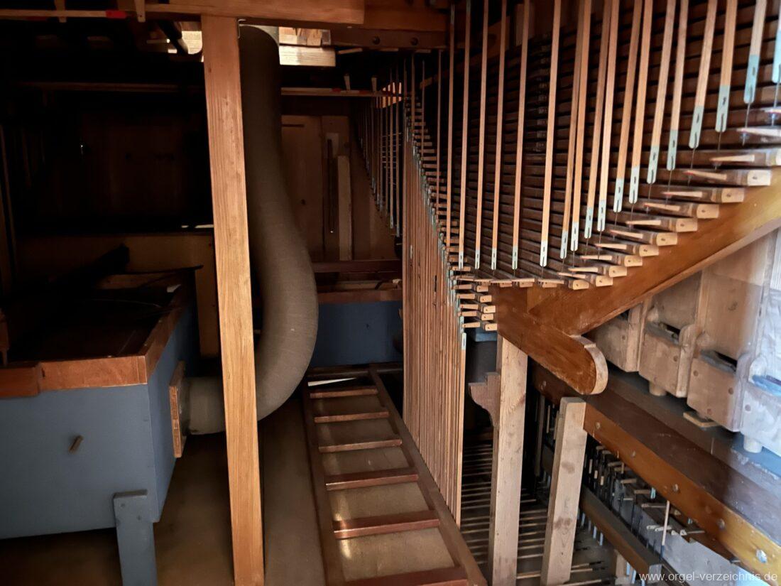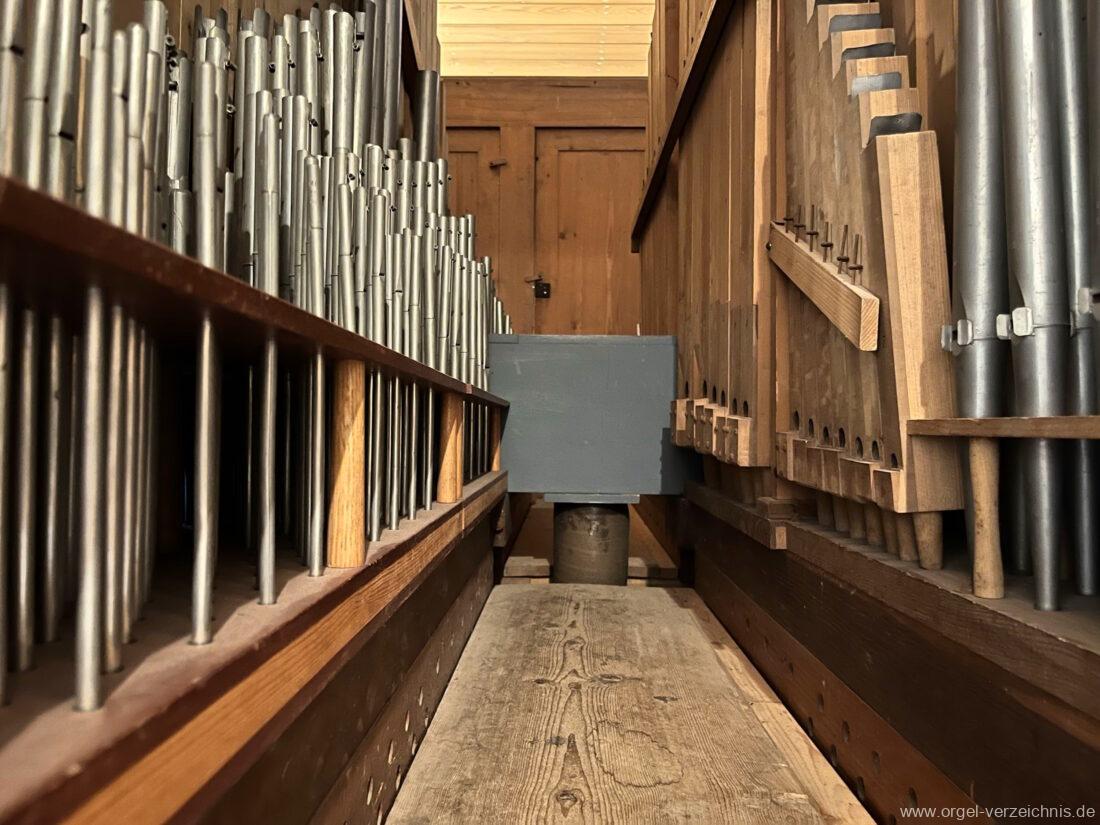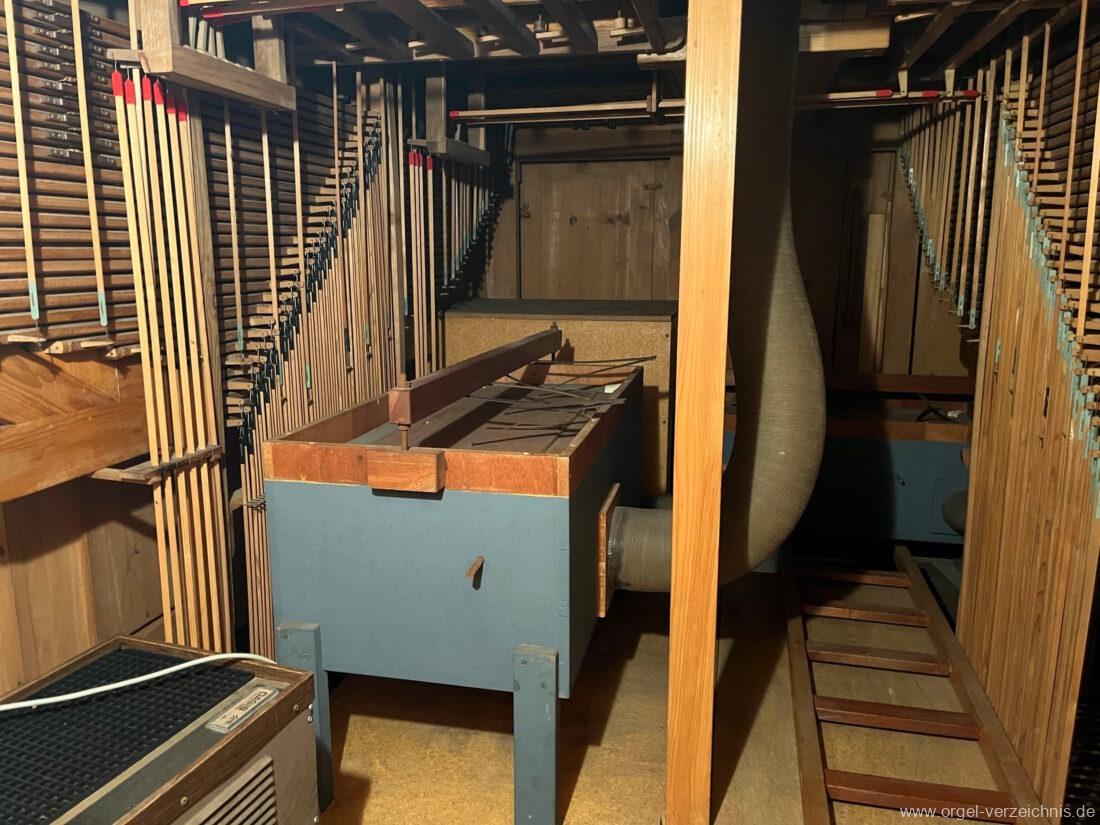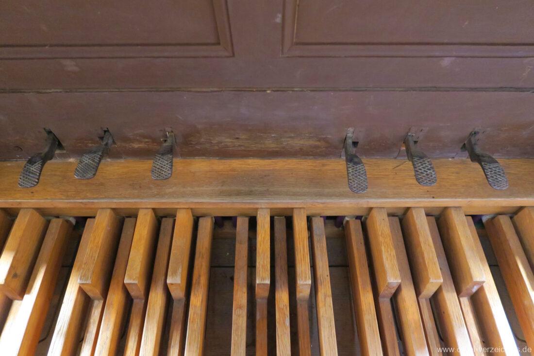 II Manual C – f“‘Liebl. Gedeckt 8′ Holz ged. Traversflöte. 4.‘ Holz innenlabiiert, teilw. Metall überbl. Principal 2′ Larigot 1 1/3′ |