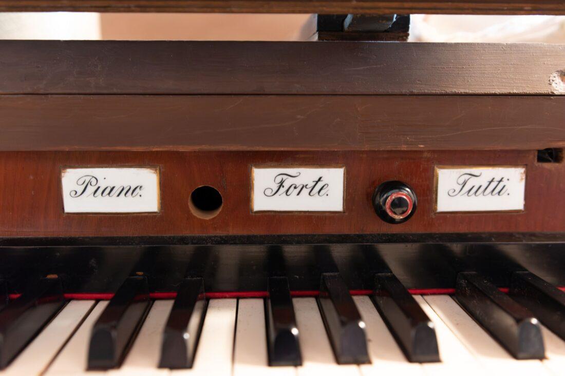 Fuß: Coppellung II. M.z. I. M., Coppellung II. M.z. Pedal, Coppellung I. M.z. Pedal, Piano., Forte., Tutti. als Rastentritte von links nach rechts
