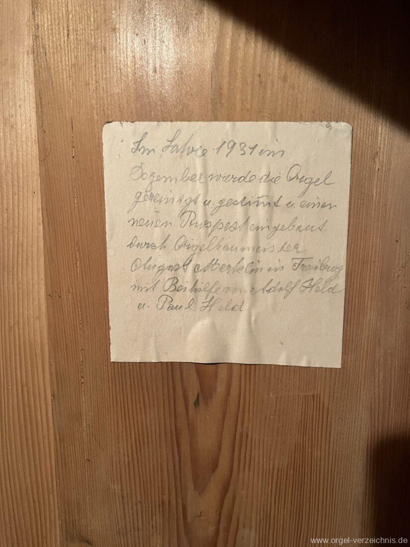 1931 Ausreinigung und Einbau in einen neuen Prospekt durch Orgelbau August Merklin unter Beihilfe von Adolf und Paul Held.