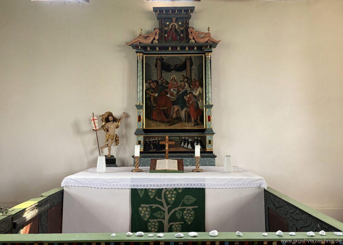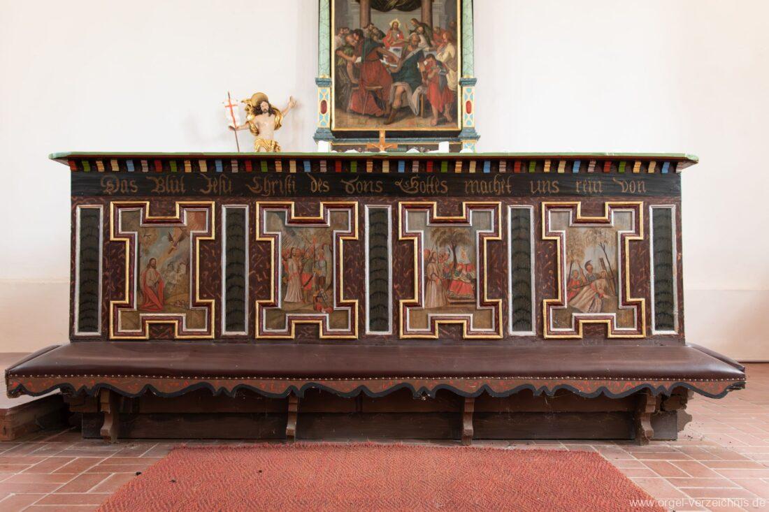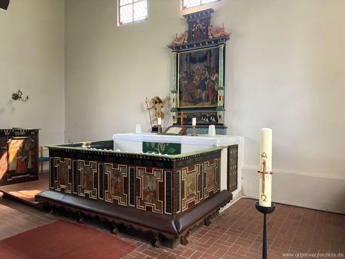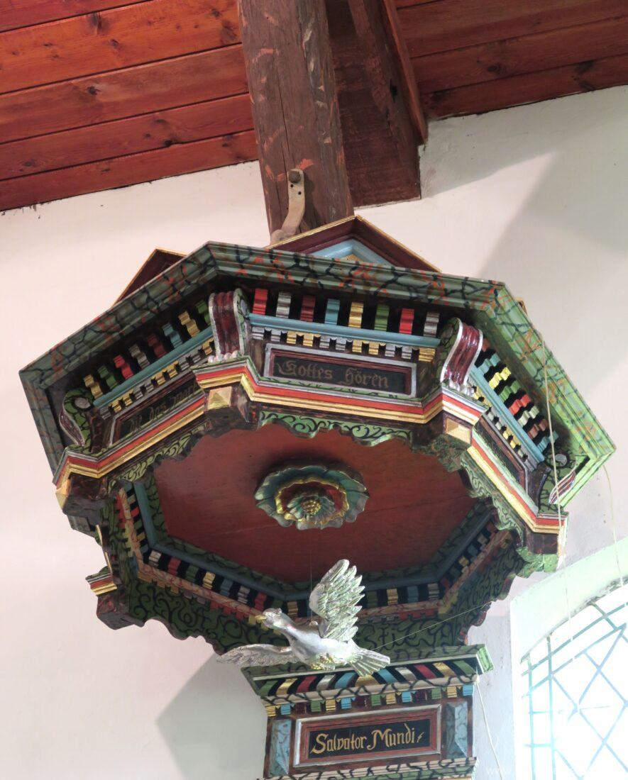 1883 Renovierung der Kirche und Überdeckung der Bemalungen von der Kanzel, des Gestühls und der Empore. Entfernung des mittelalterlichen Altares.