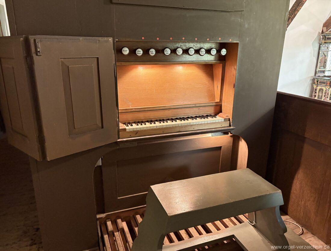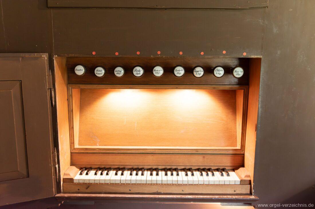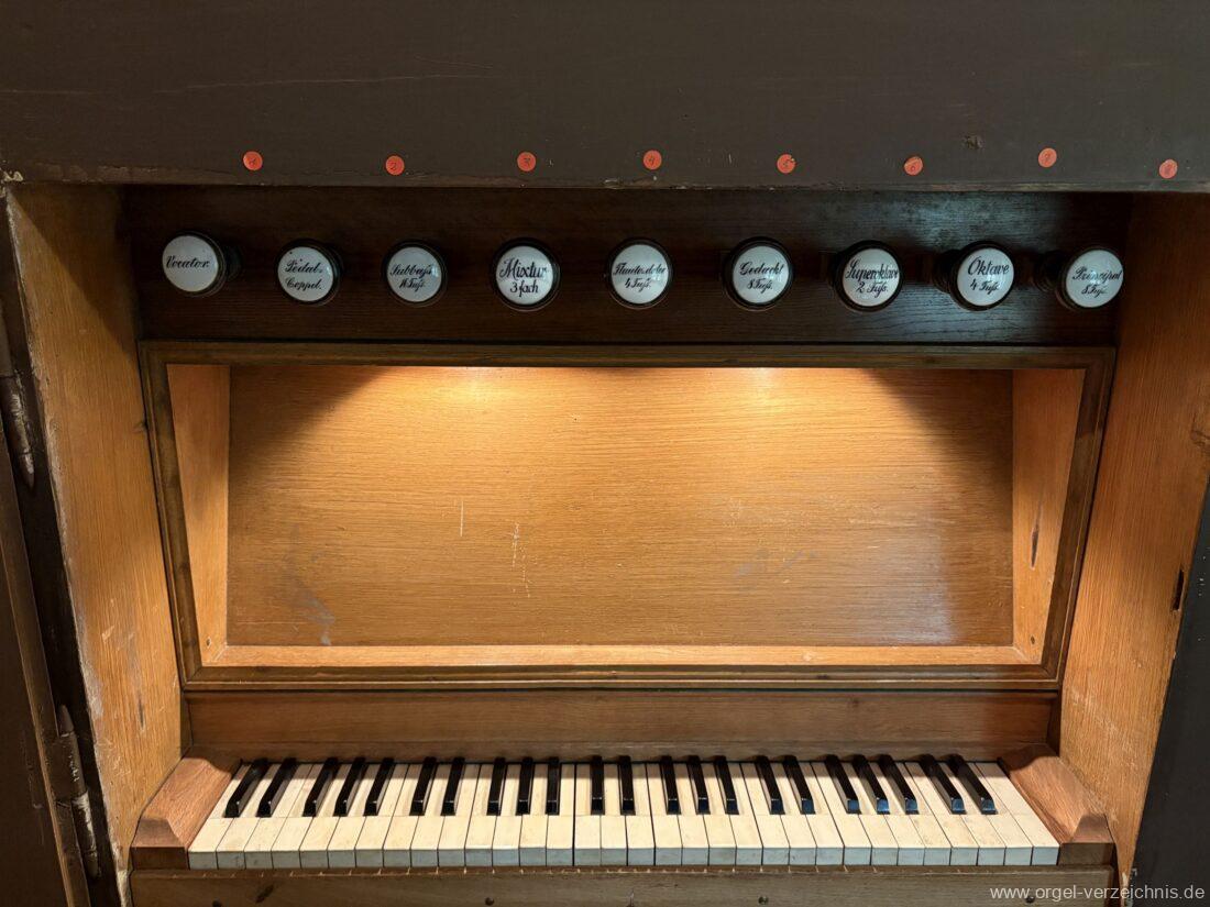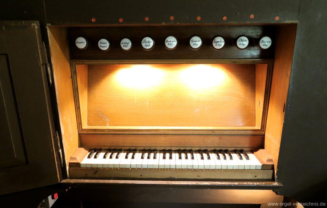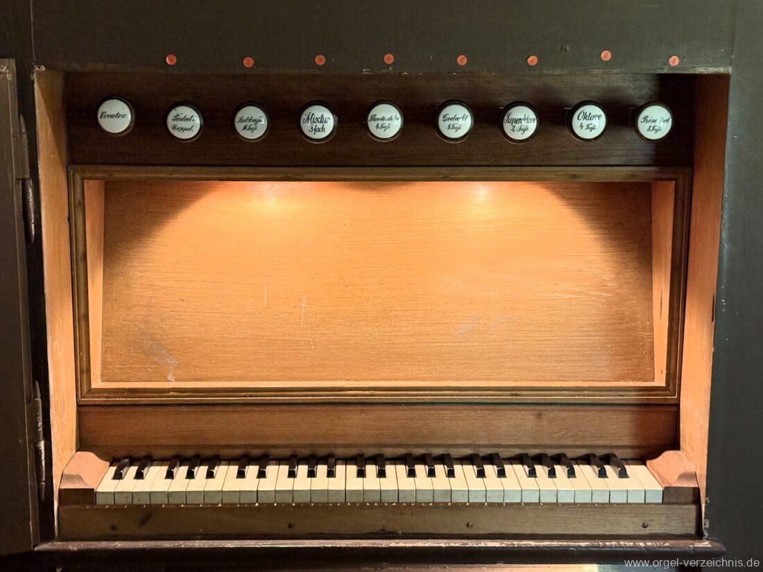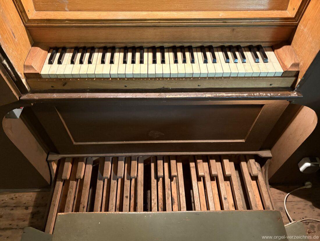 Manual C – f“‘Principal 8 Fuss. C – H Holz offen, c°/cs° innen Metall, d° – g‘ Prospekt, ab gs‘ innen Metall Gedackt 8 Fuss. C – f° Holz ged., ab fs° Metall ged. Oktave 4 Fuss. C – H Prospekt, ab c° innen Metall Flauto=dolce 4 Fuss. C – H Holz ged., ab c° Metall rohrged., ab fs“ offen konisch Superoktave 2 Fuss. Metall Mixtur 3 fach 1 1/3′ – rep. c°/c’/c“