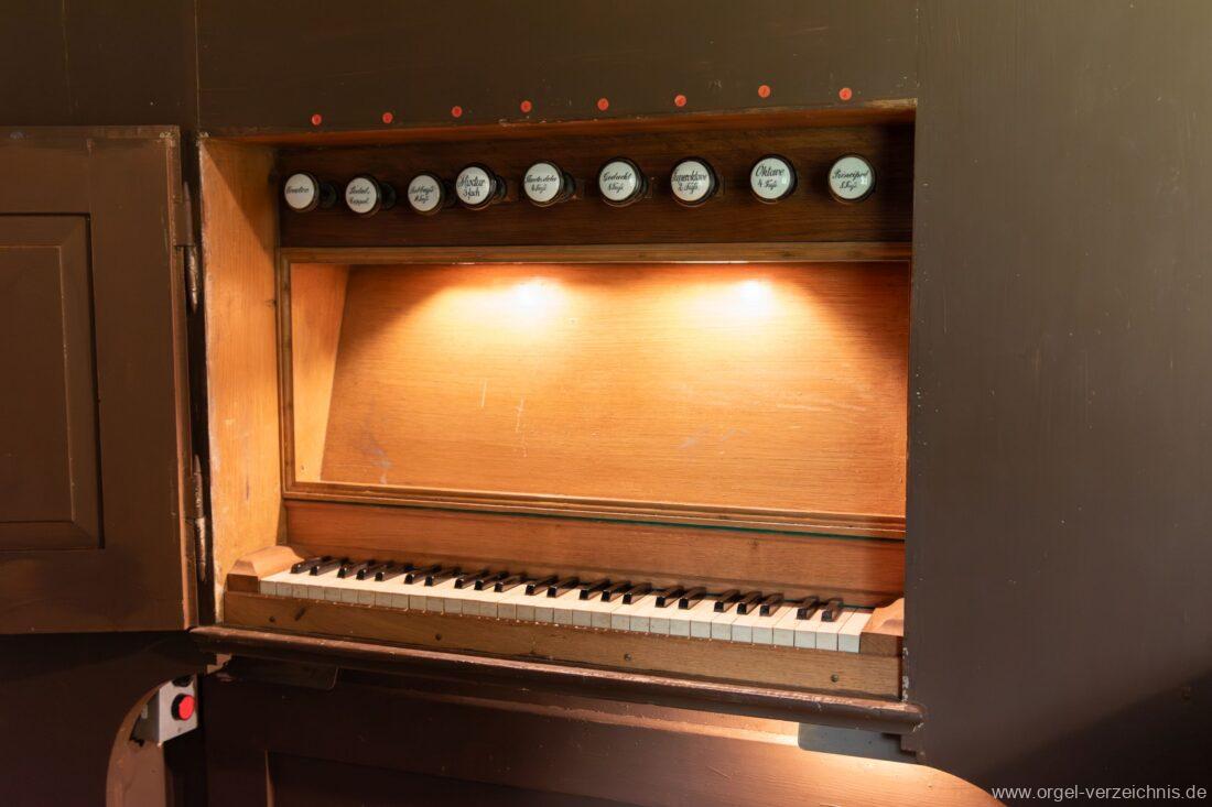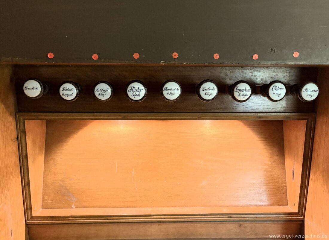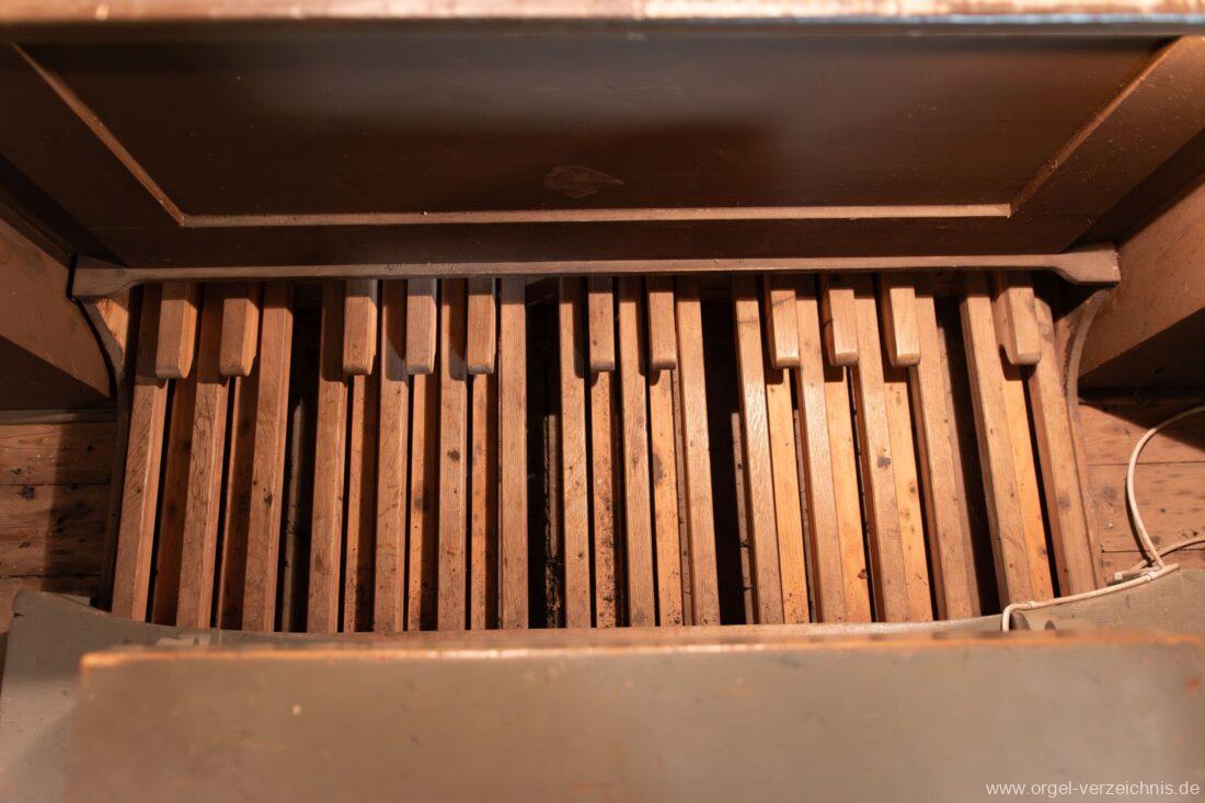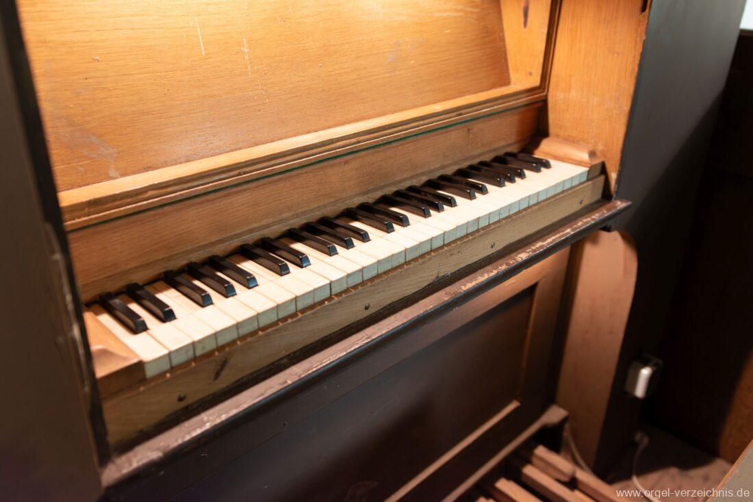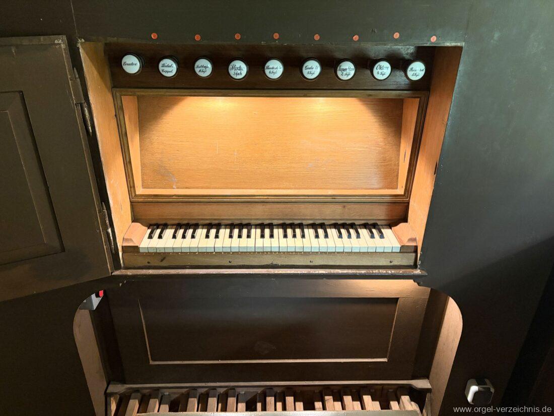 Manual C – f“‘Principal 8 Fuss. C – H Holz offen, c°/cs° innen Metall, d° – g‘ Prospekt, ab gs‘ innen Metall Gedackt 8 Fuss. C – f° Holz ged., ab fs° Metall ged. Oktave 4 Fuss. C – H Prospekt, ab c° innen Metall Flauto=dolce 4 Fuss. C – H Holz ged., ab c° Metall rohrged., ab fs“ offen konisch Superoktave 2 Fuss. Metall Mixtur 3 fach 1 1/3′ – rep. c°/c’/c“