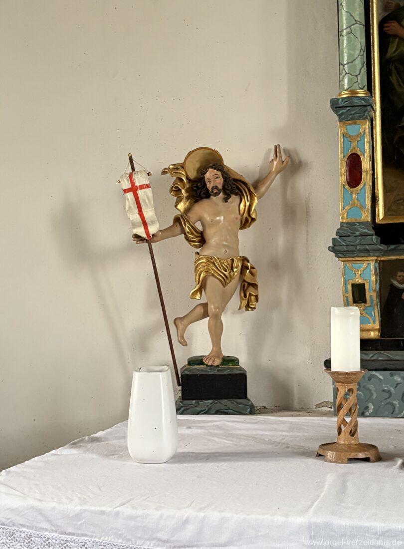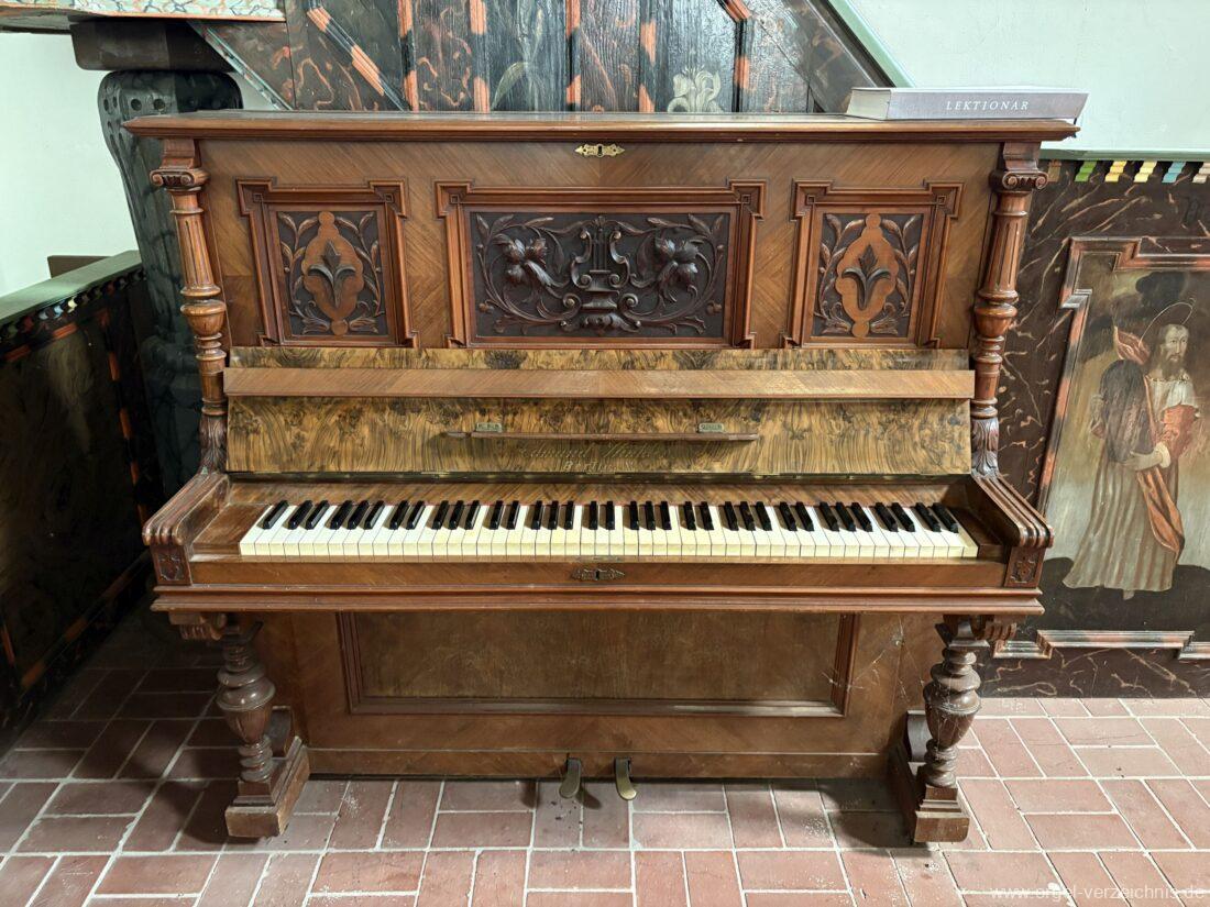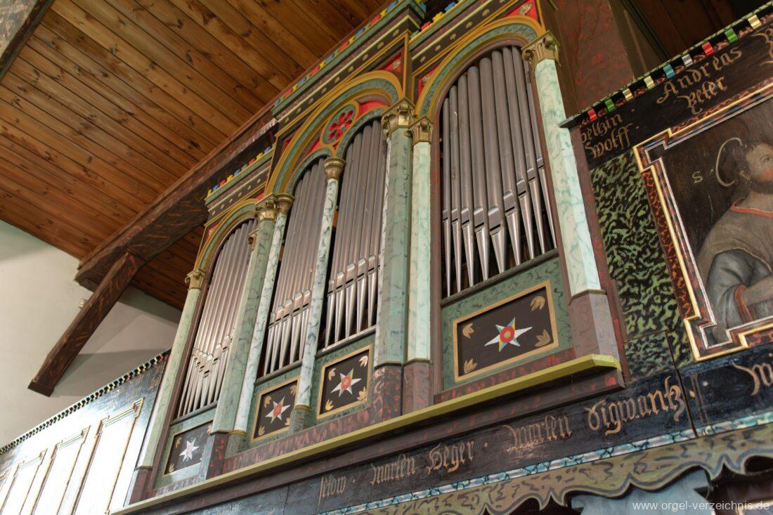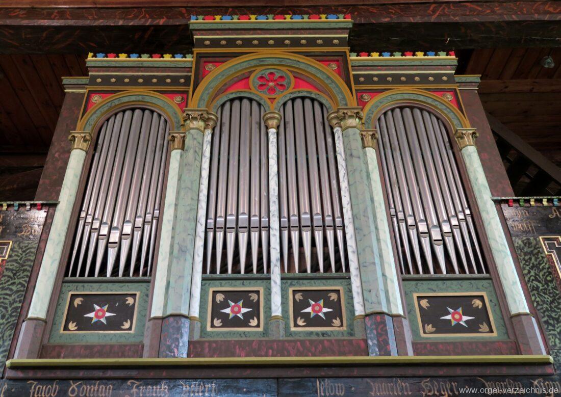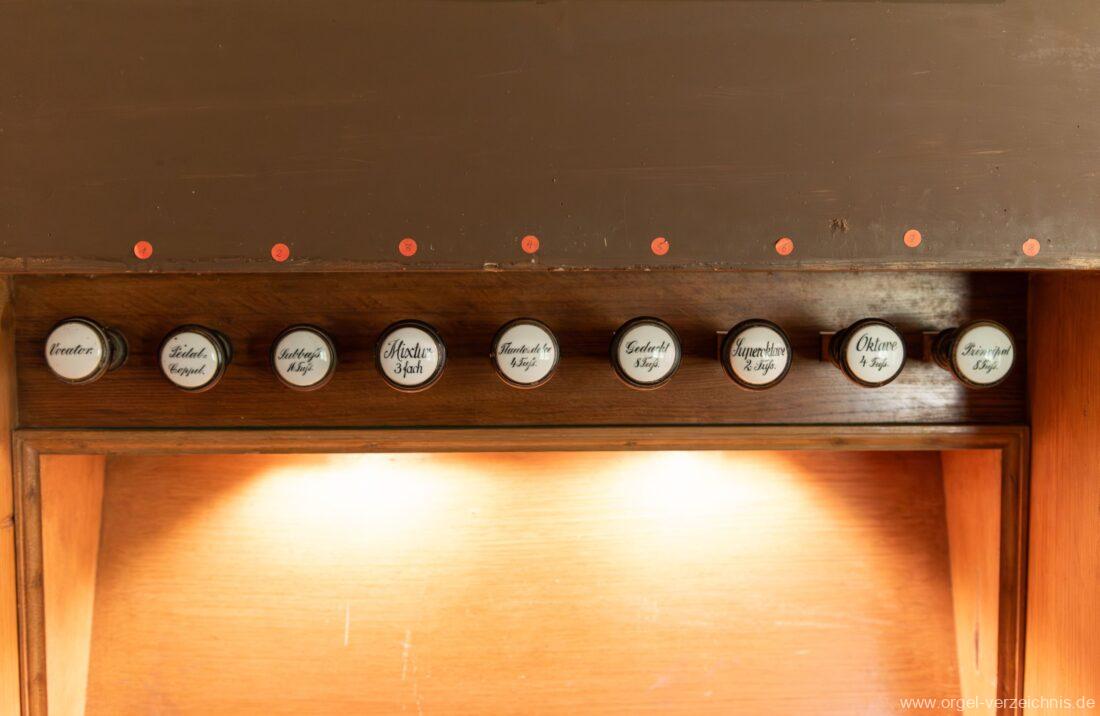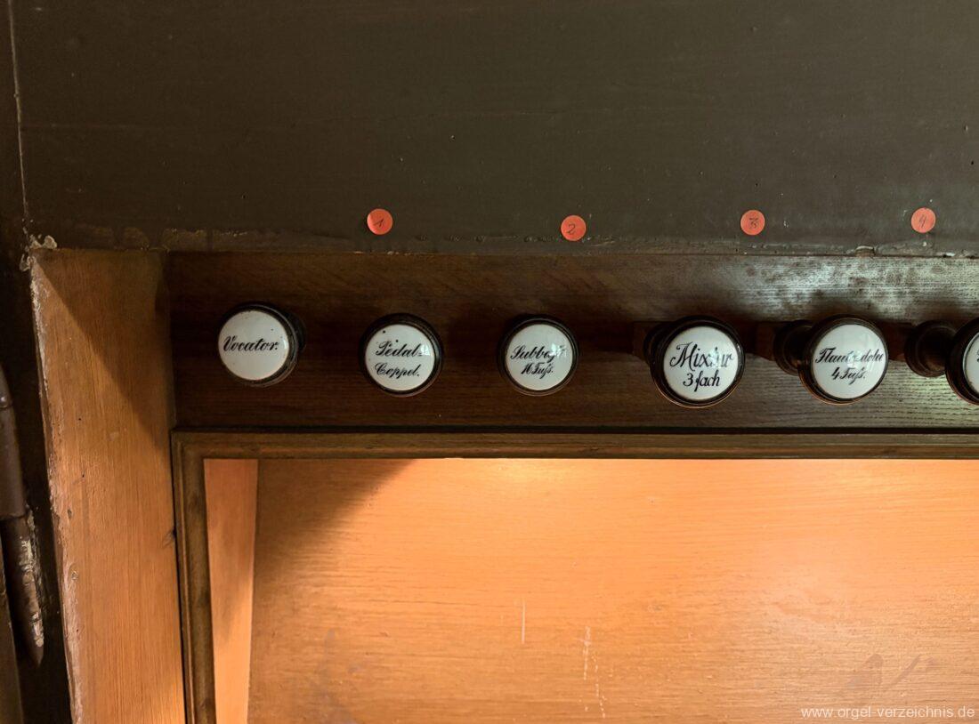 Manual C – f“‘Principal 8 Fuss. C – H Holz offen, c°/cs° innen Metall, d° – g‘ Prospekt, ab gs‘ innen Metall Gedackt 8 Fuss. C – f° Holz ged., ab fs° Metall ged. Oktave 4 Fuss. C – H Prospekt, ab c° innen Metall Flauto=dolce 4 Fuss. C – H Holz ged., ab c° Metall rohrged., ab fs“ offen konisch Superoktave 2 Fuss. Metall Mixtur 3 fach 1 1/3′ – rep. c°/c’/c“