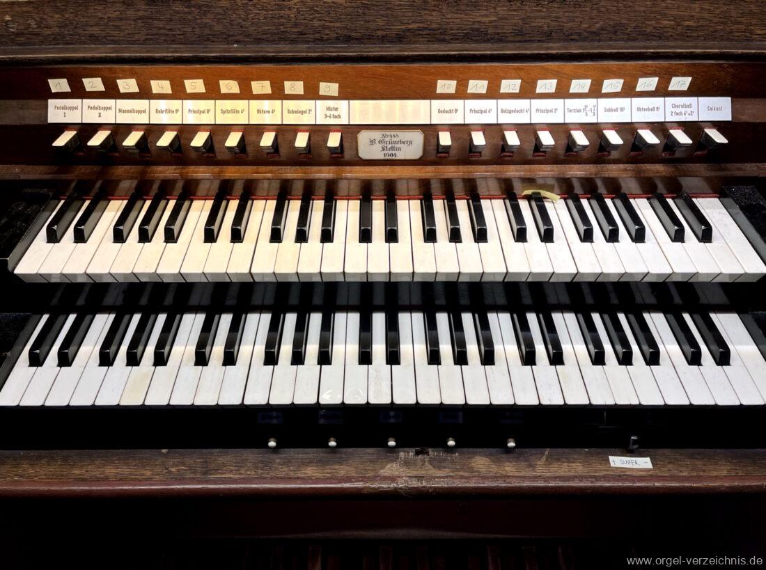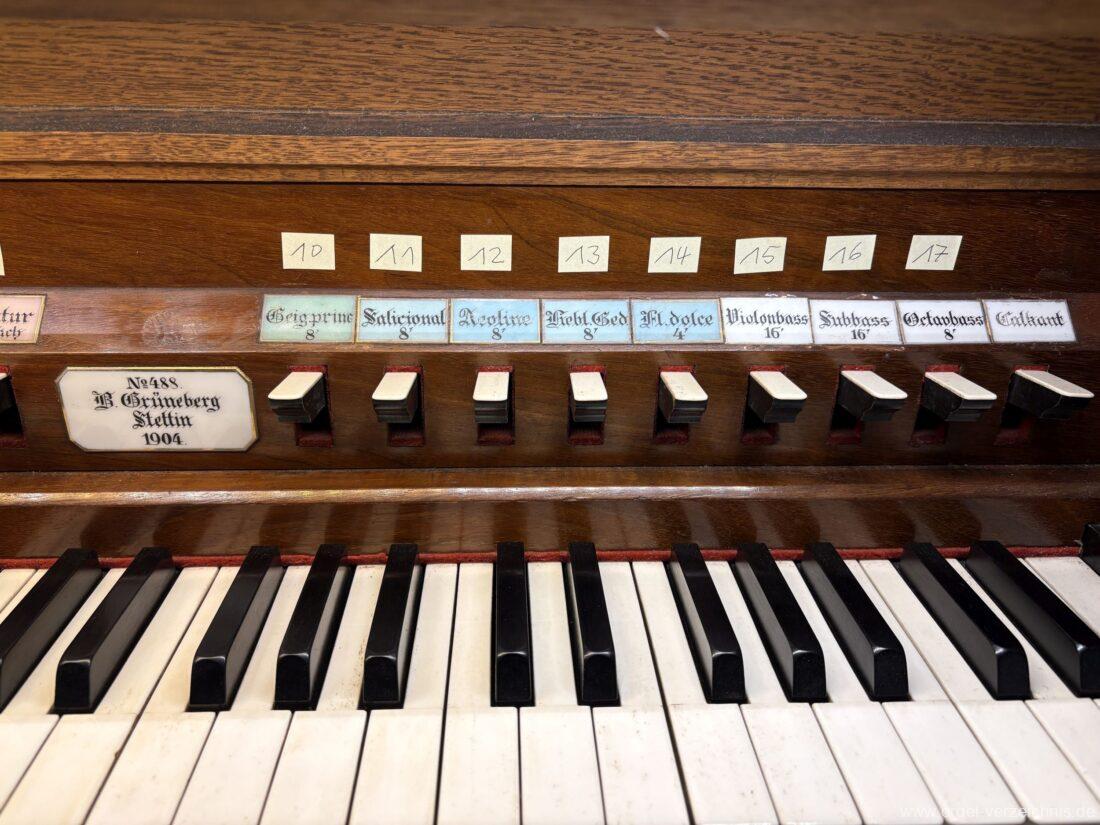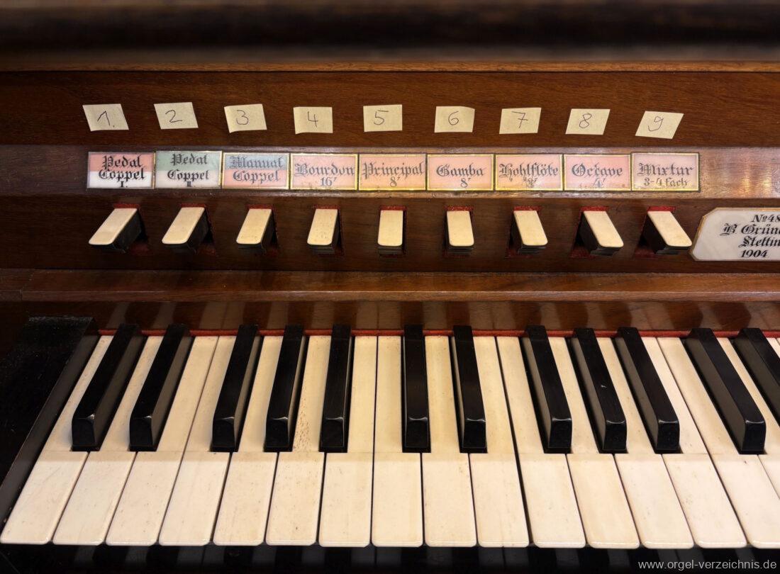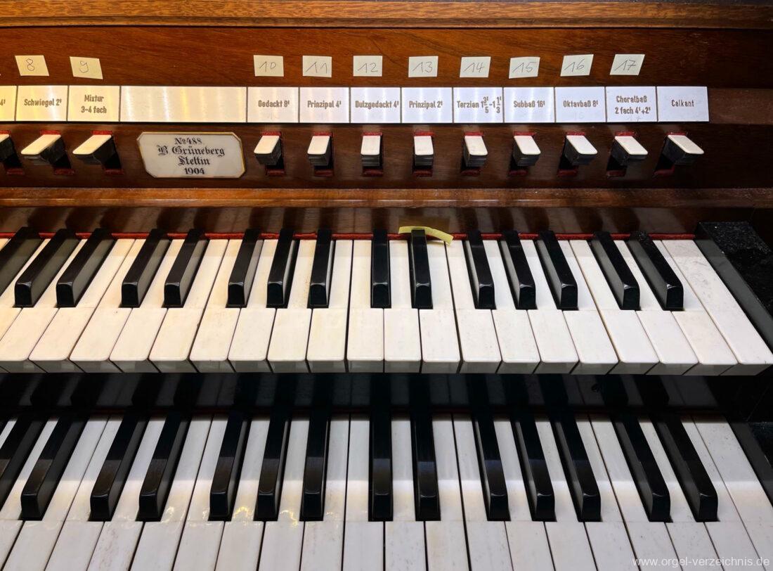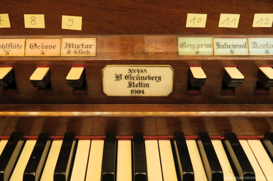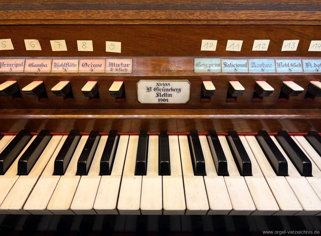 1904 pneumatische Kegelladenorgel (Registerkanzellen) mit mittig fest eingebautem Spielschrank, erbaut als Opus 488 von Orgelbau Barnim Grüneberg (Stettin) II/14.