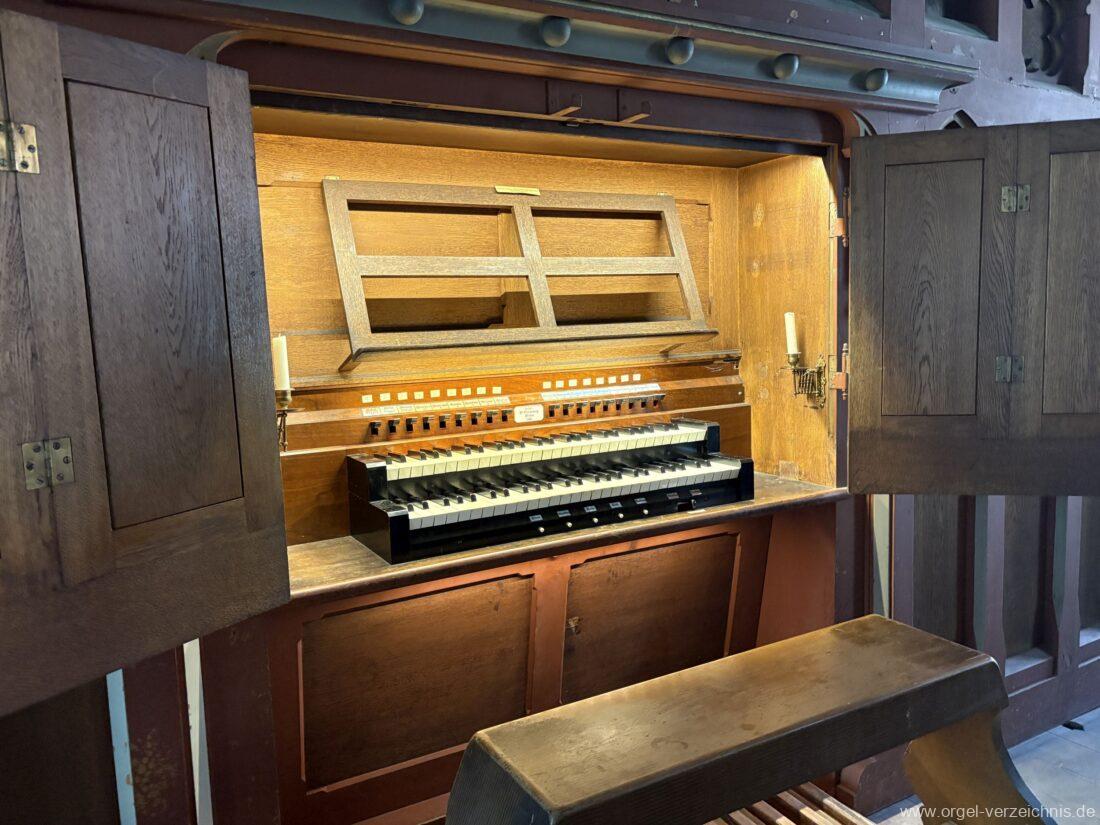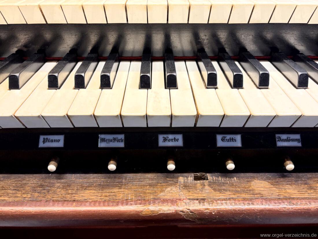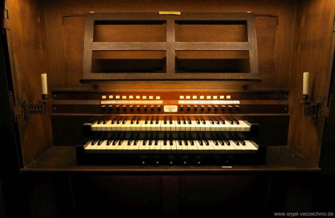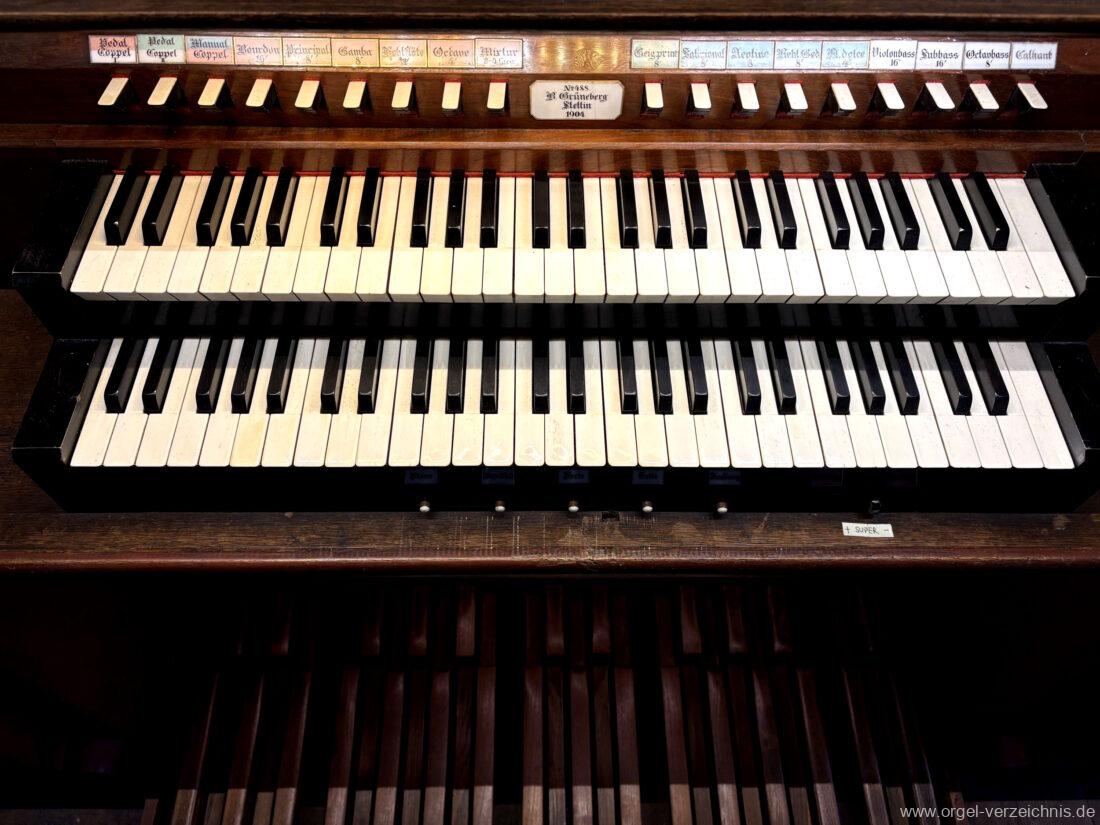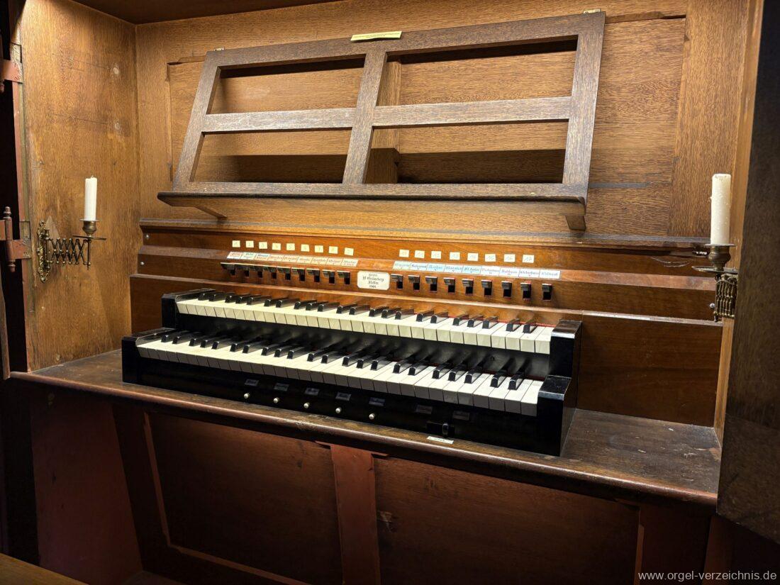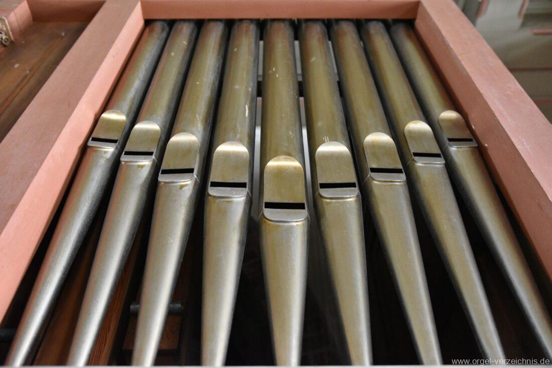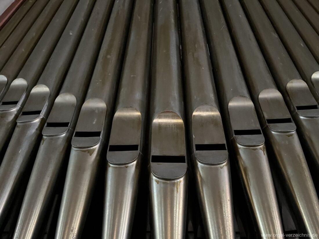 II Manual C – f“‘Geig.princ 8′ C – H Holz, ab c° Naturguss, ab fs° Metall Salicional 8′ Holz, ab c° Metall neu Aeoline 8′ neu, C – H Naturguss, ab c° Metall Liebl.Ged. 8′ C – h° Holz ged., ab c‘ Naturguss ged. Fl.dolce 4′ C – H Holz rohrged. neu, ab c° Naturguss rohrged. alt, ab f“ offen konisch und teilw. alt