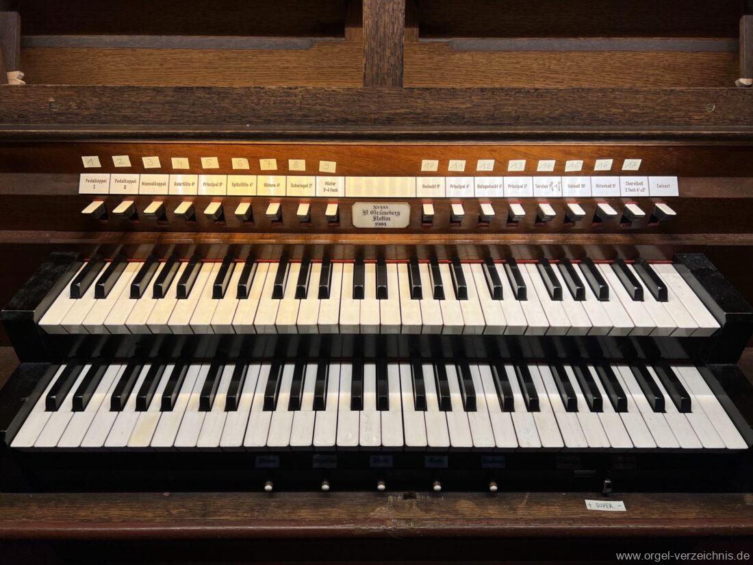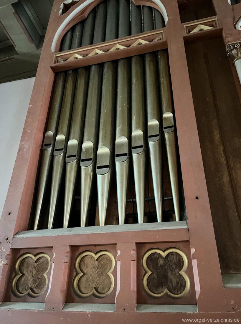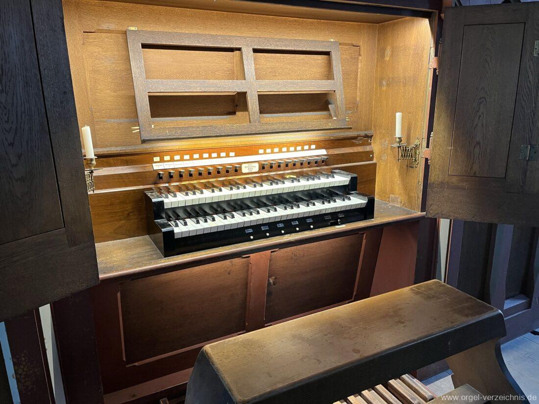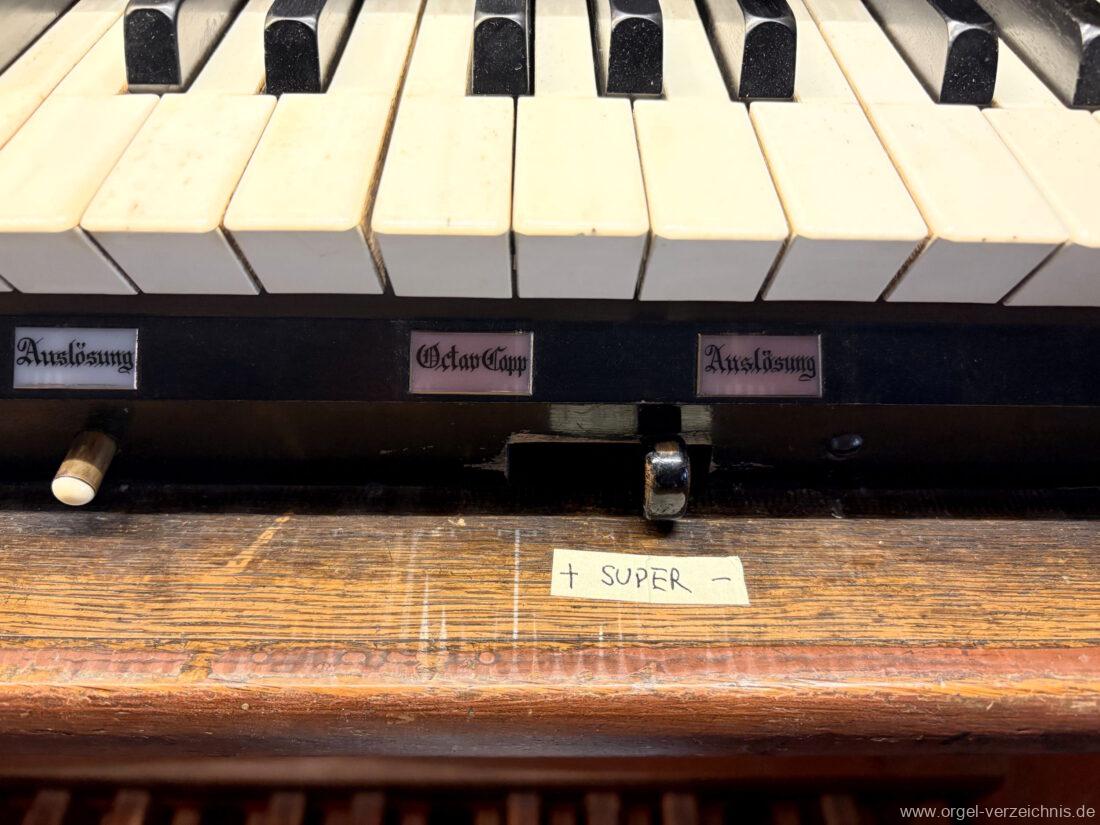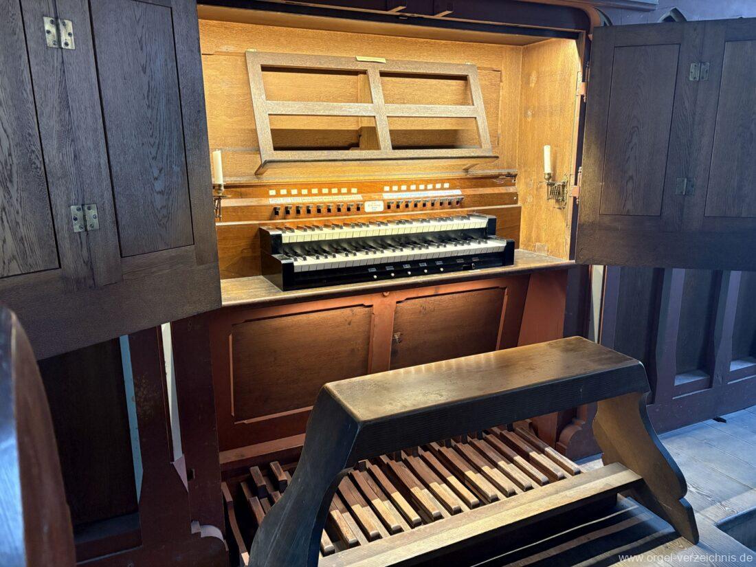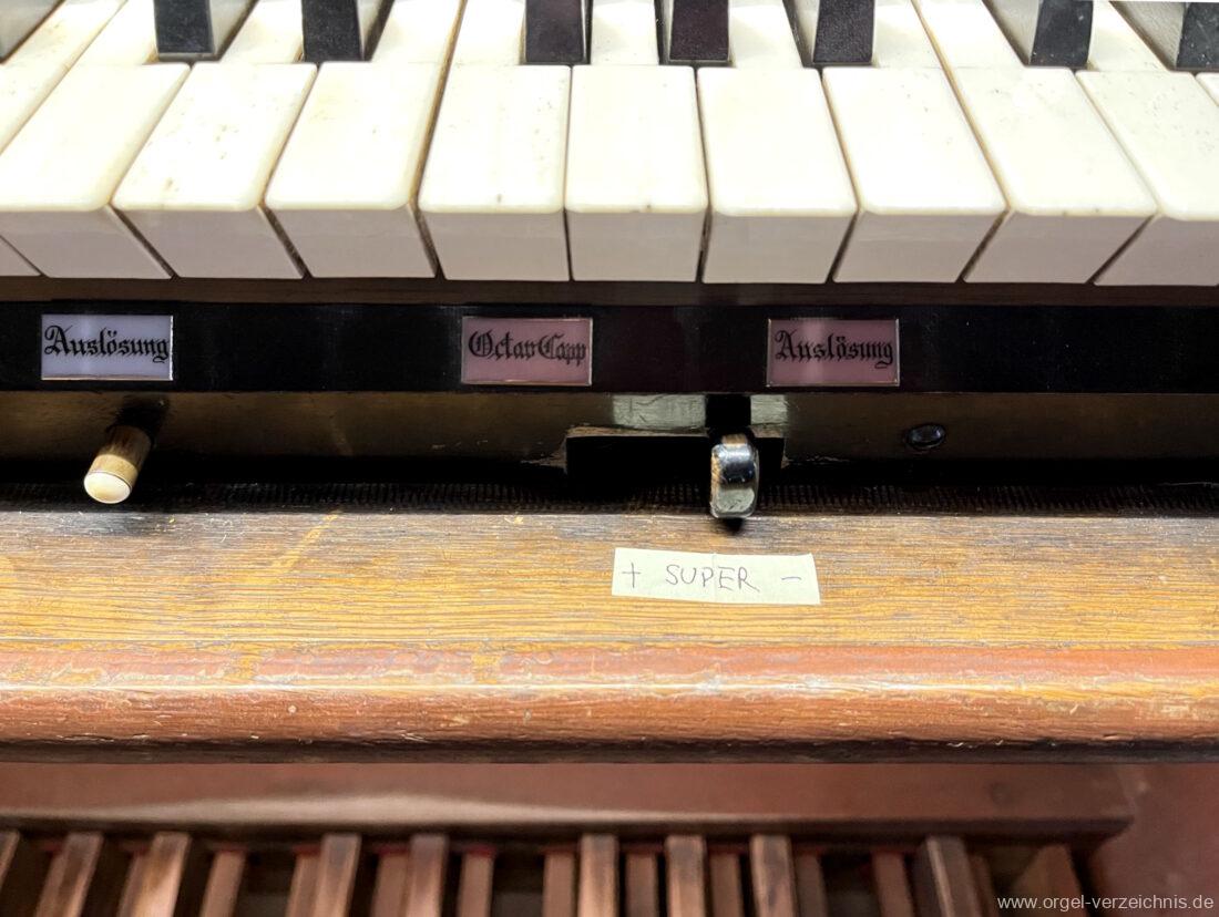 II Manual C – f“‘Geig.princ 8′ C – H Holz, ab c° Naturguss, ab fs° Metall Salicional 8′ Holz, ab c° Metall neu Aeoline 8′ neu, C – H Naturguss, ab c° Metall Liebl.Ged. 8′ C – h° Holz ged., ab c‘ Naturguss ged. Fl.dolce 4′ C – H Holz rohrged. neu, ab c° Naturguss rohrged. alt, ab f“ offen konisch und teilw. alt