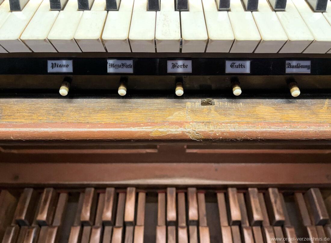 Druckknöpfe unter erstem Manual: Piano, MezzoForte, Forte, Tutti, Auslösung und OctavCopp – Auslösung als Schieber (Superkoppel I – nicht ausgebaut)