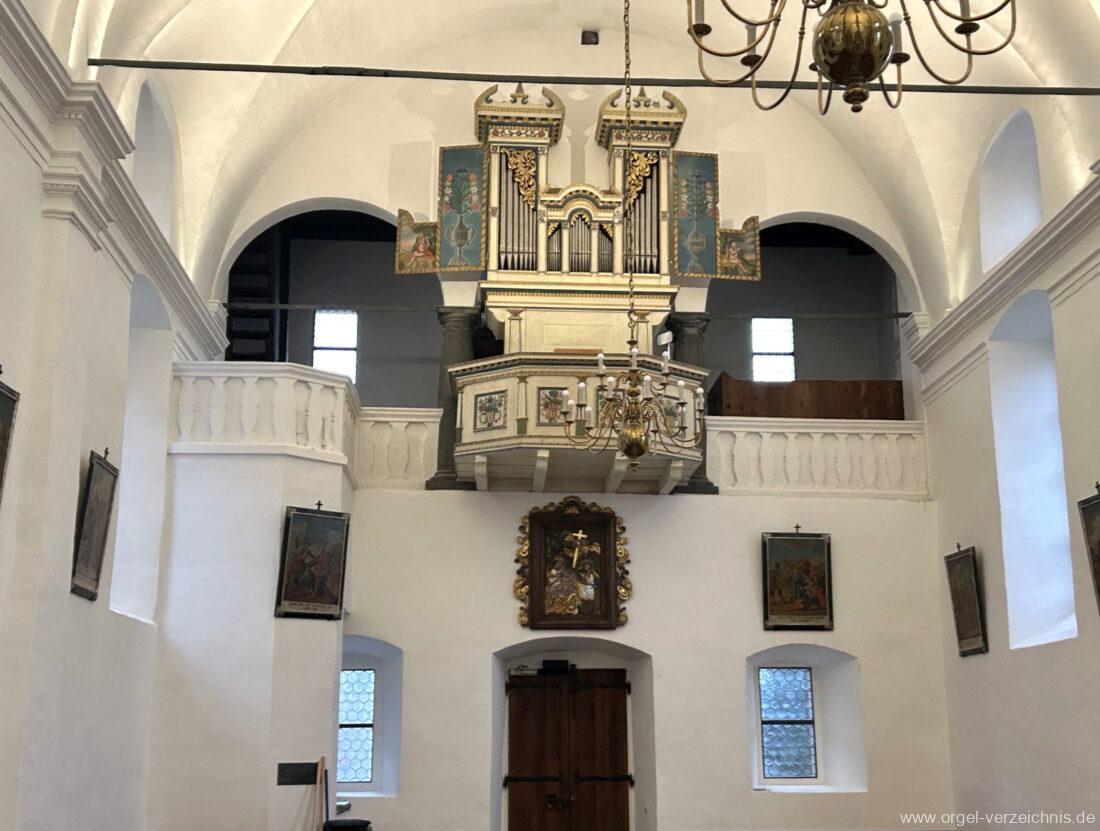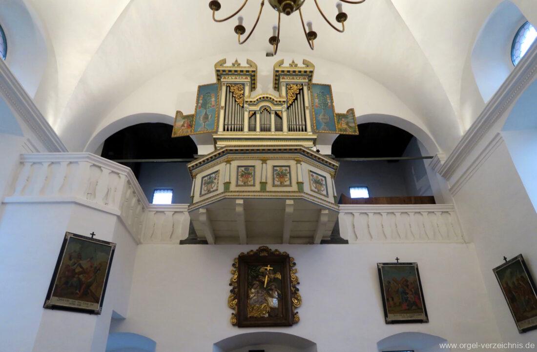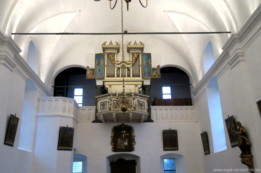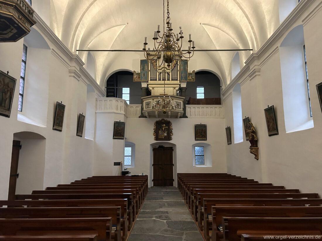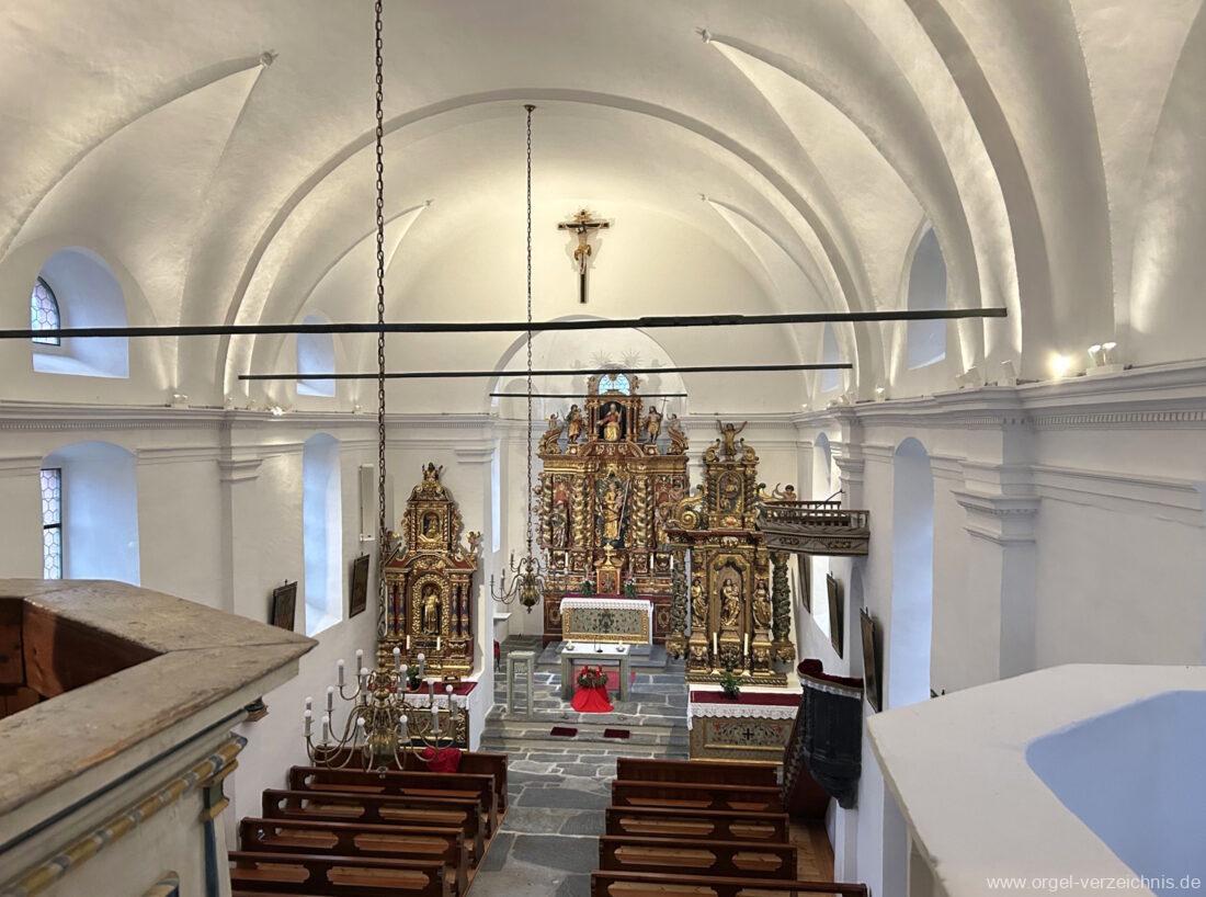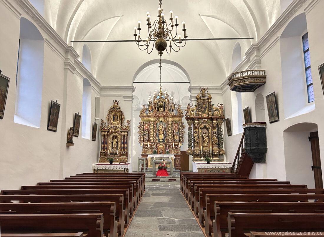 Um 1830 mechanische Schleifladenorgel mit mittig fest ins Gehäuse eingelassenem Spieltisch, erbaut von Orgelbauer Franz Josef (Joseph) Carlen (Glis) I/7 mit angehängtem Pedal. Vermutungen schliessen auf einen Umbau eines älteren Instrumentes durch Carlen.