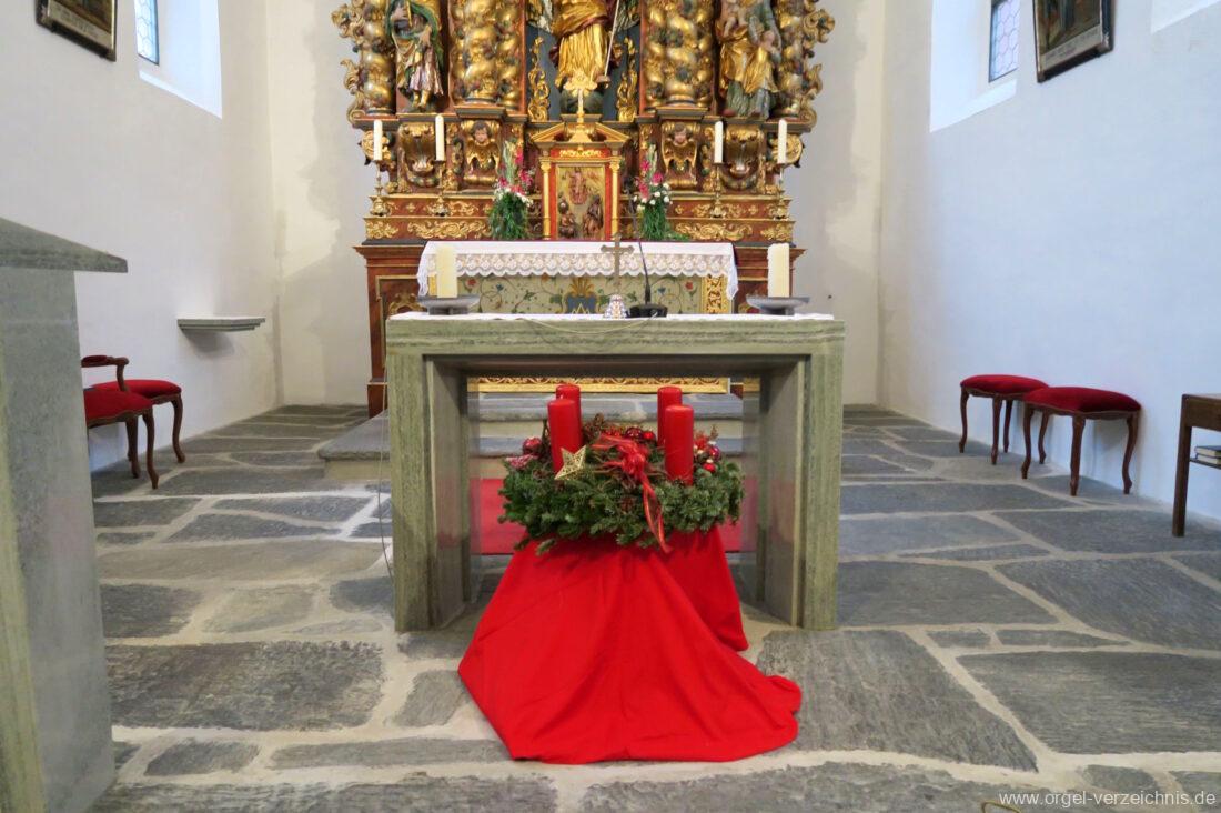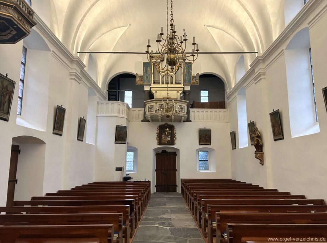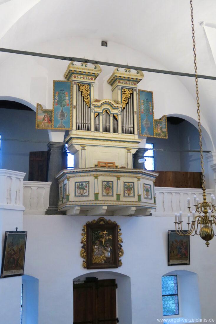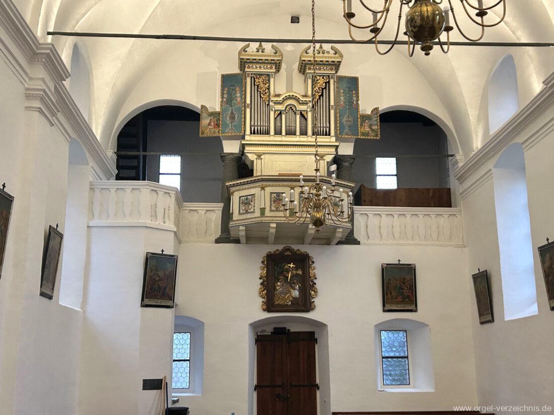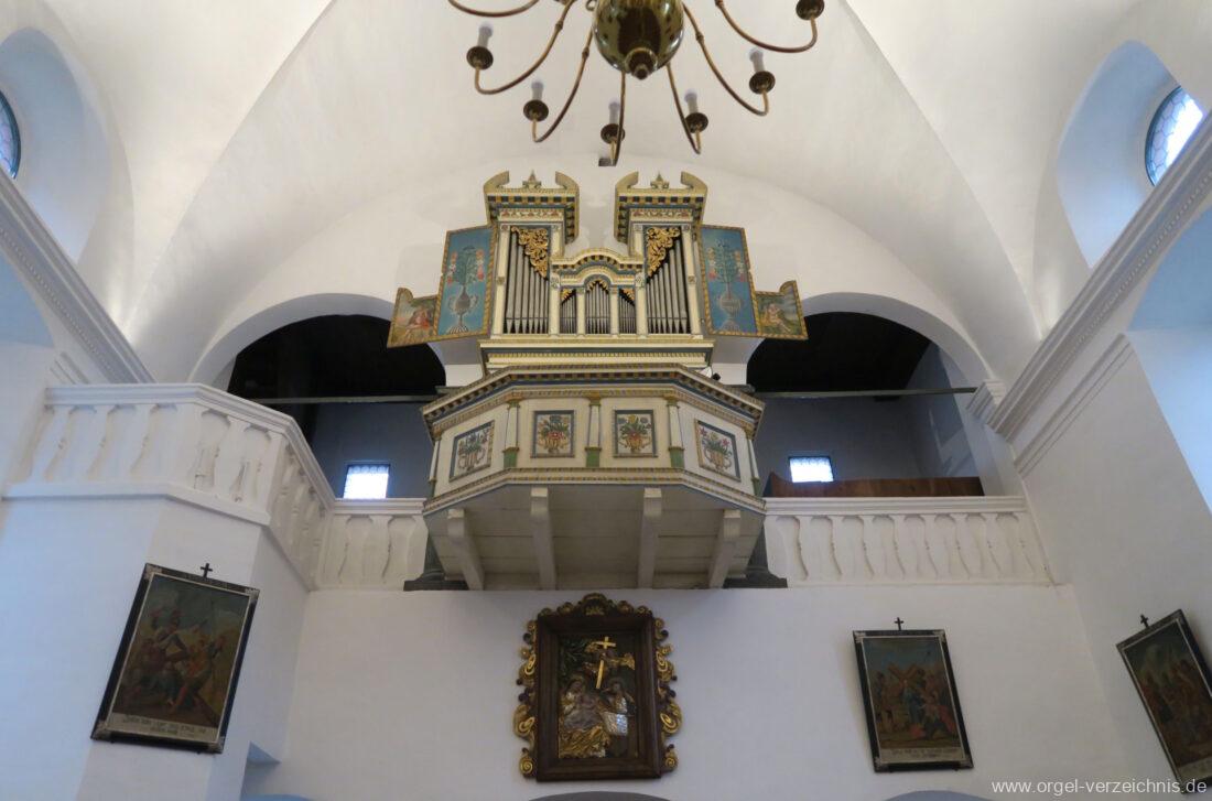 Um 1830 mechanische Schleifladenorgel mit mittig fest ins Gehäuse eingelassenem Spieltisch, erbaut von Orgelbauer Franz Josef (Joseph) Carlen (Glis) I/7 mit angehängtem Pedal. Vermutungen schliessen auf einen Umbau eines älteren Instrumentes durch Carlen.