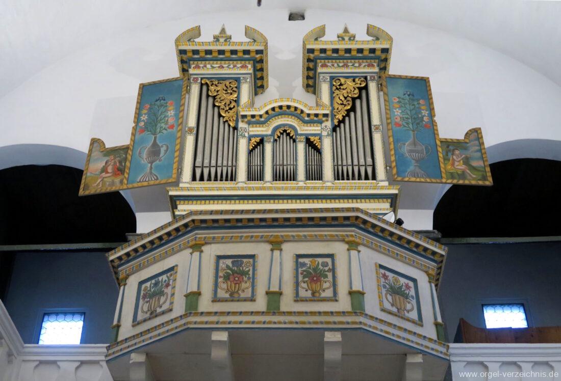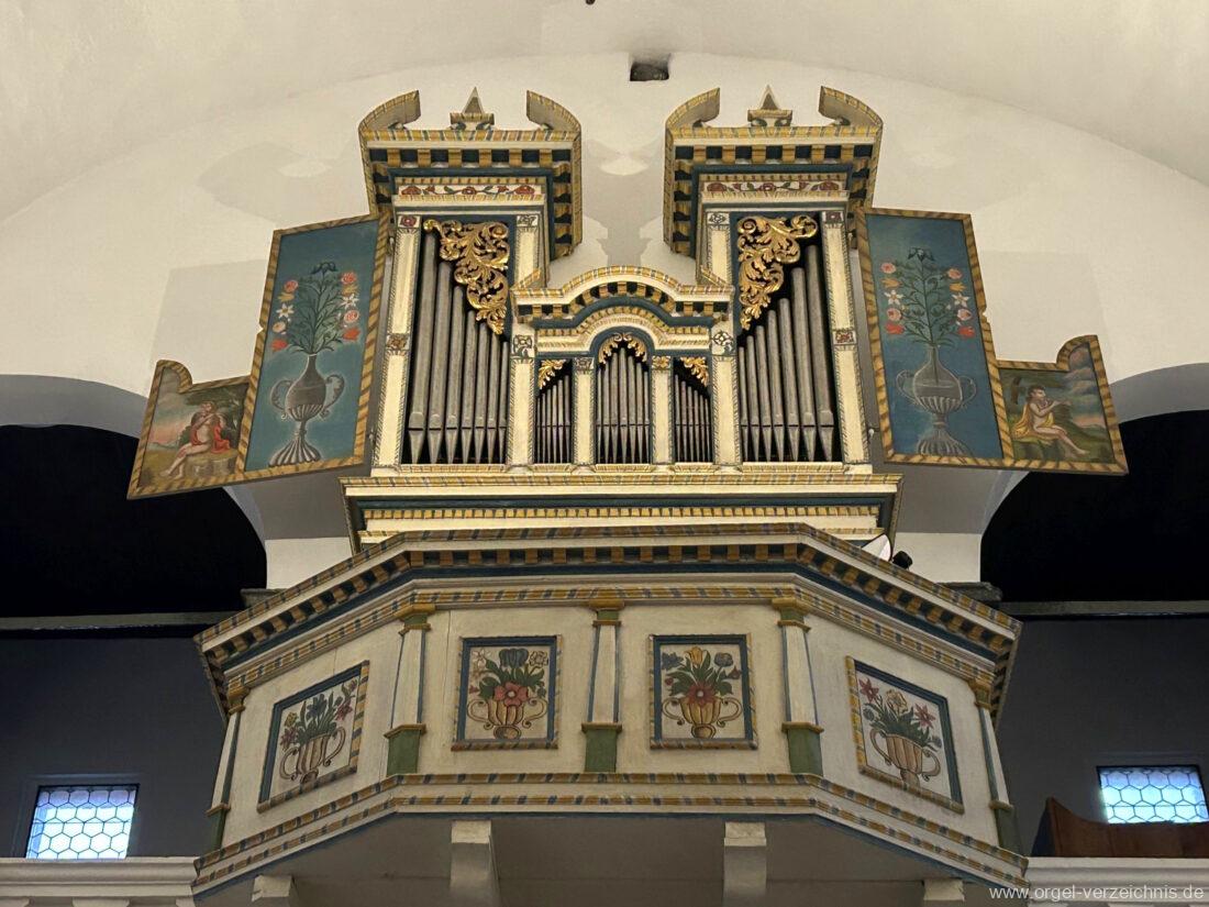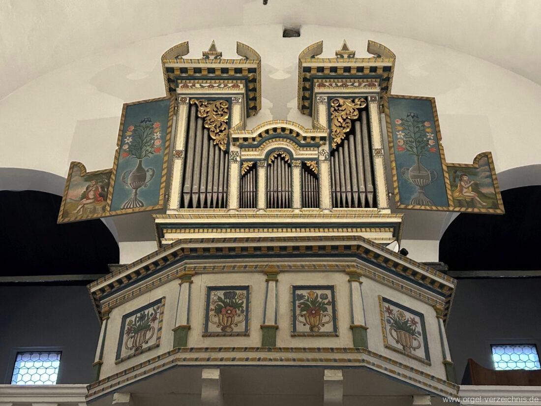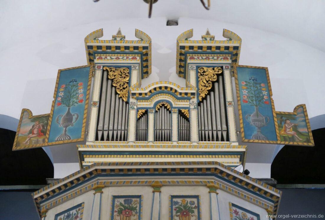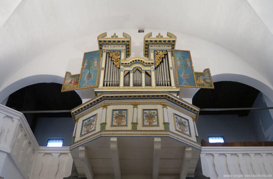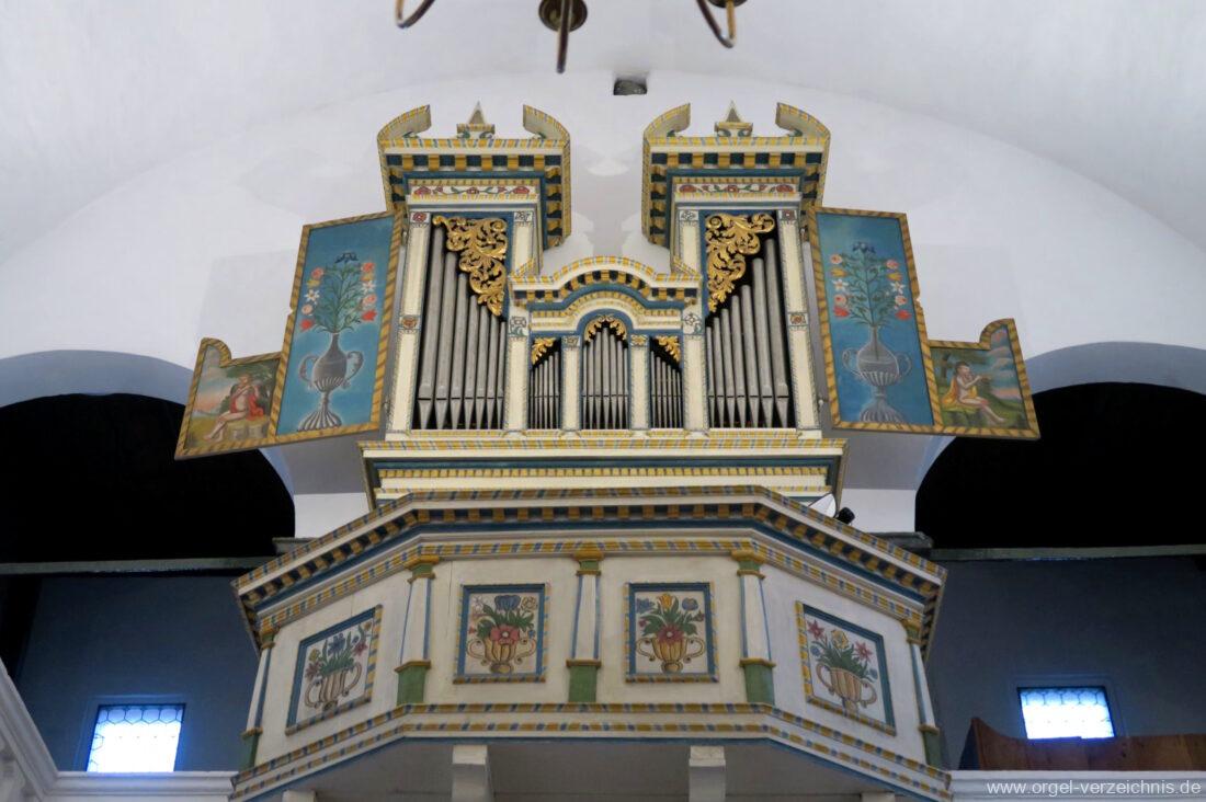 Um 1830 mechanische Schleifladenorgel mit mittig fest ins Gehäuse eingelassenem Spieltisch, erbaut von Orgelbauer Franz Josef (Joseph) Carlen (Glis) I/7 mit angehängtem Pedal. Vermutungen schliessen auf einen Umbau eines älteren Instrumentes durch Carlen.