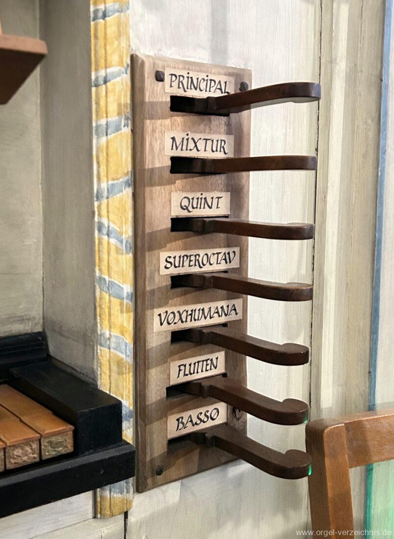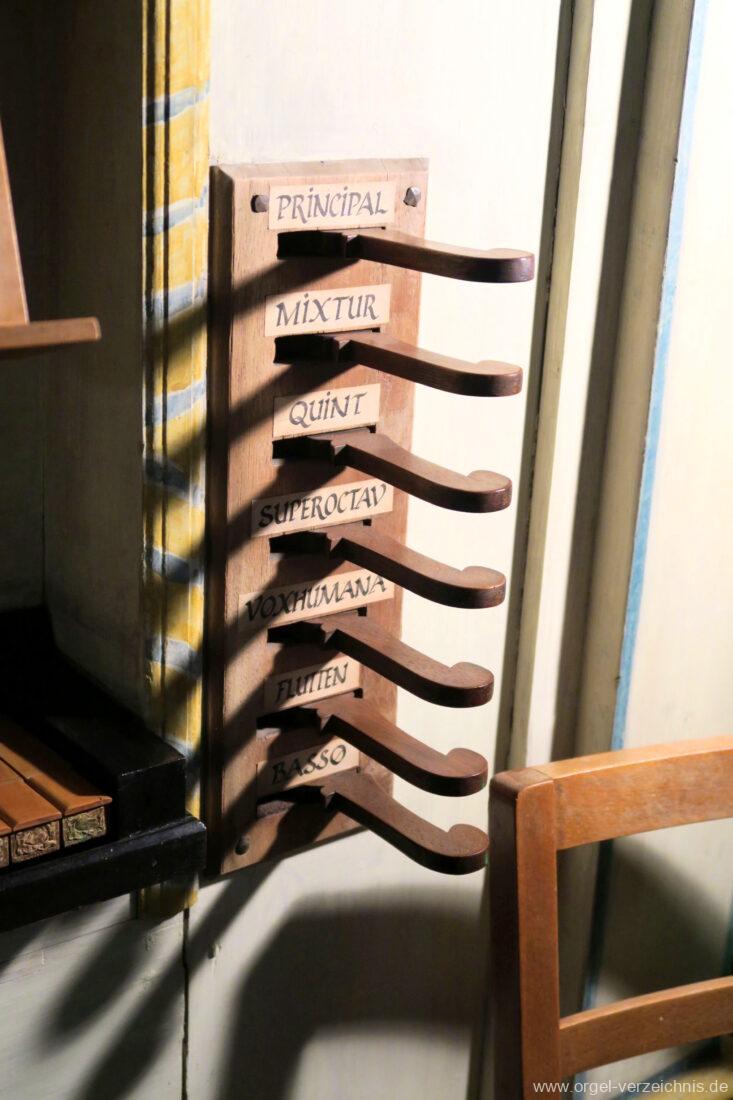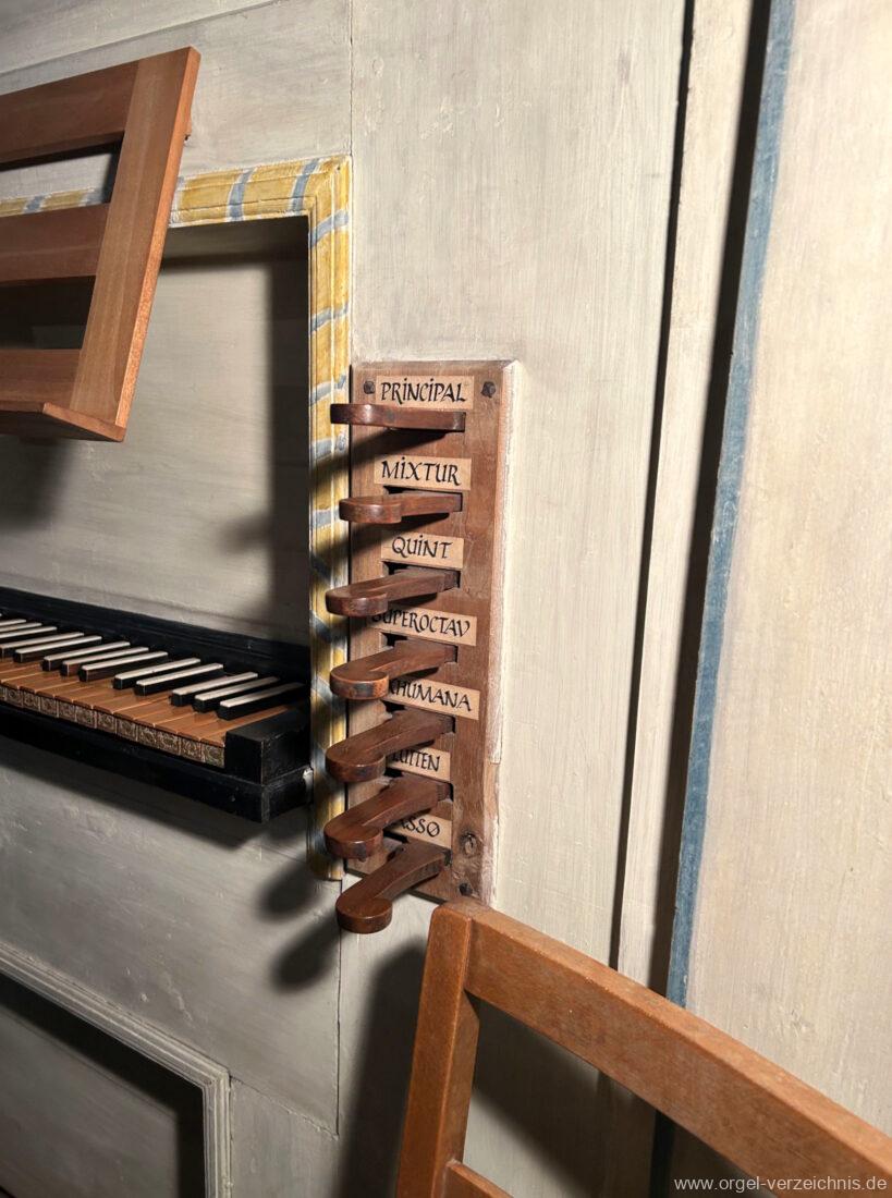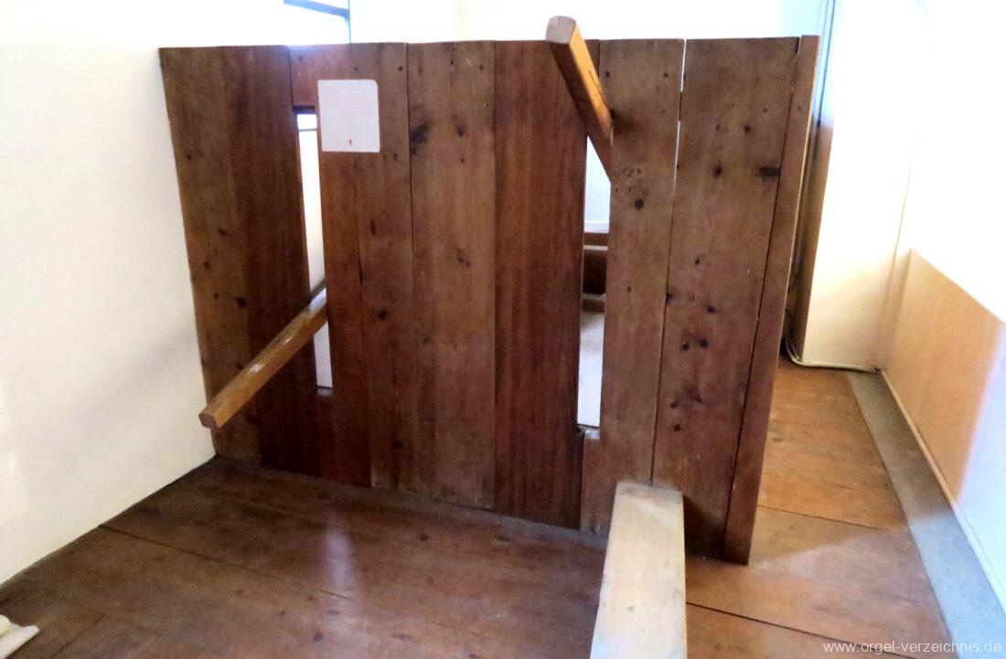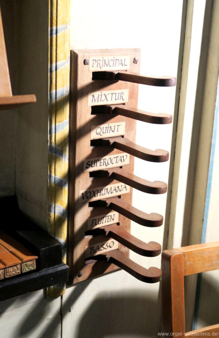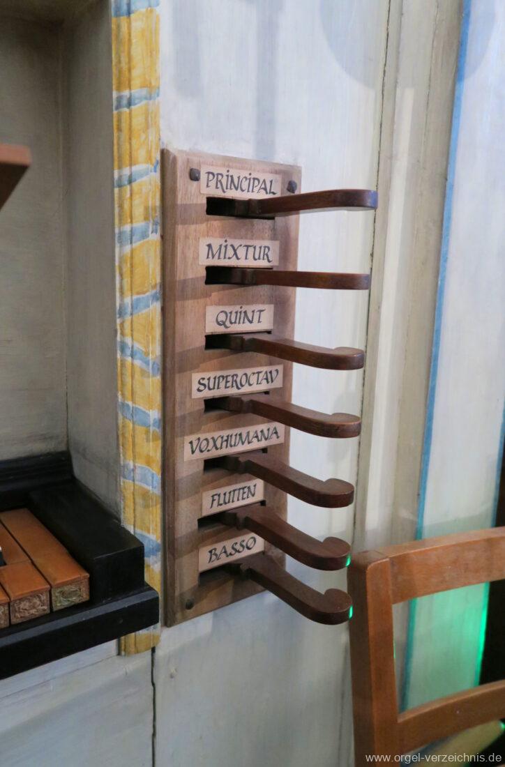 Manual C, D, E, F, G, A – c“‘Flutten 8′; Metall, konisch (Spitzflöte) Voxhumana 8′; ab c‘ (Schwebung, labial); Metall Principal 4′, Prospekt – Anm. 1; Metall, ab cs“ innen Superoctav 2′; Metall Quint 1 1/3′; Metall – rep. fs“ zu fs‘ Mixtur 2-fach 1′ – rep. c’/fs“