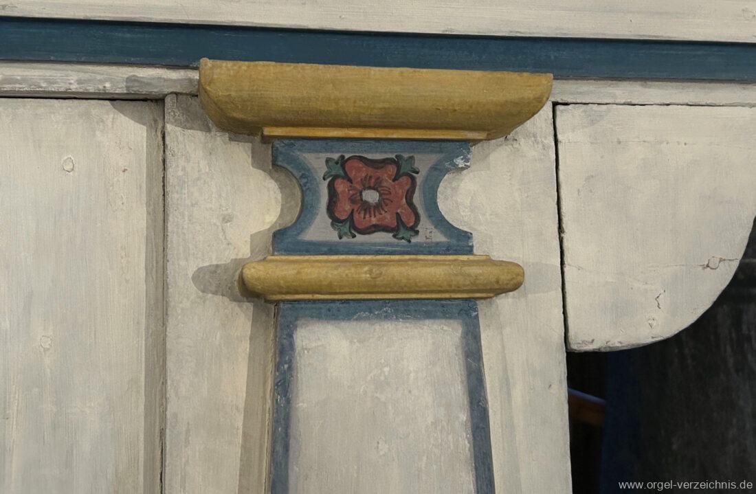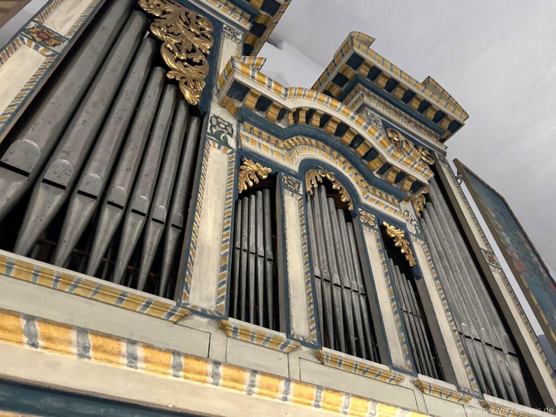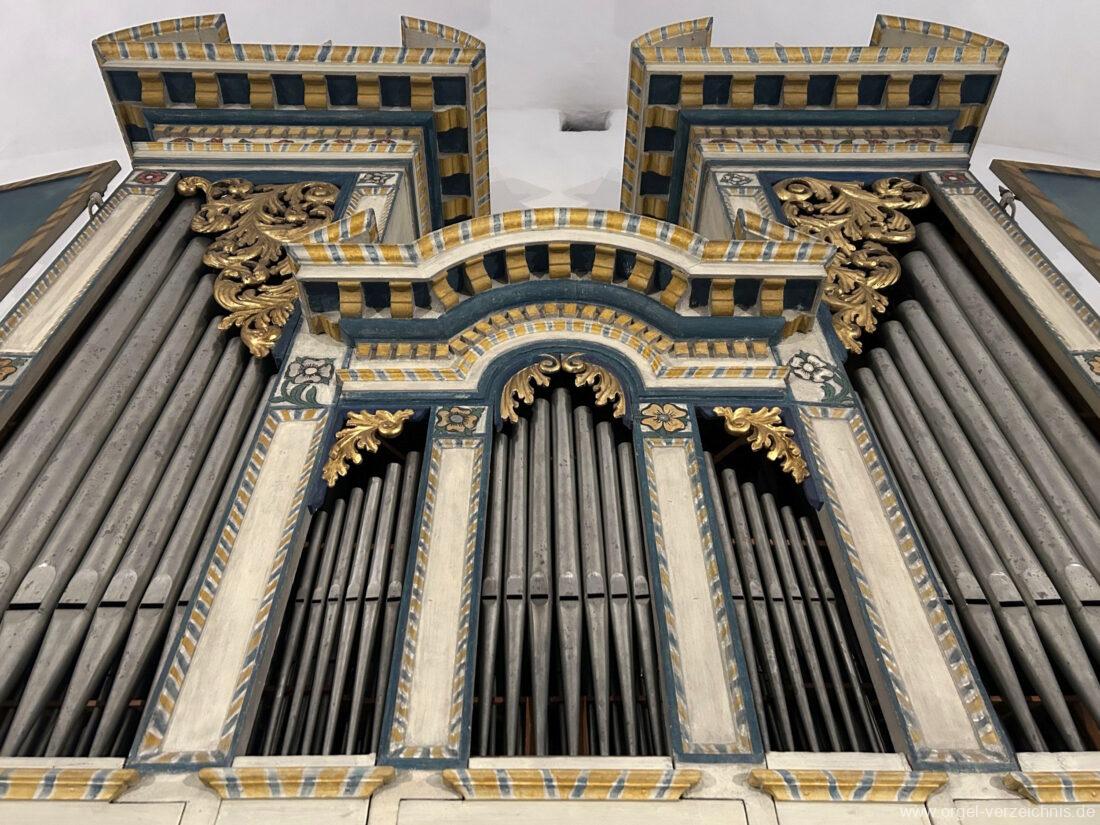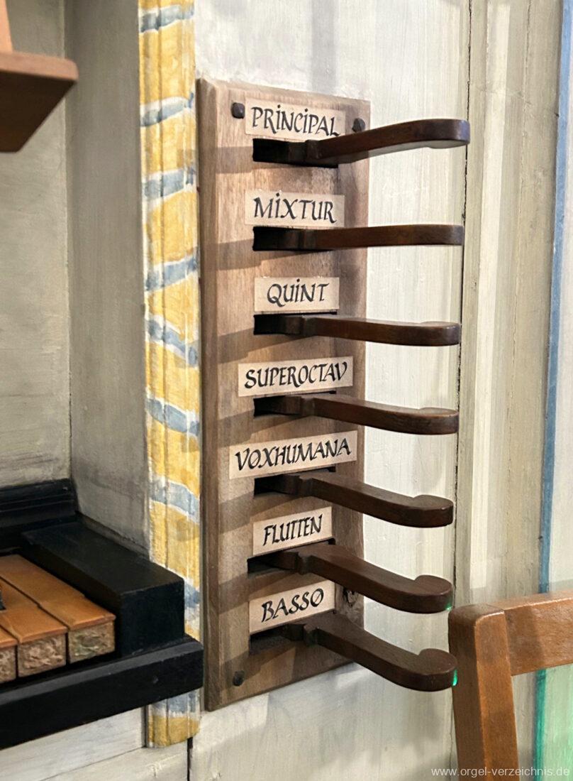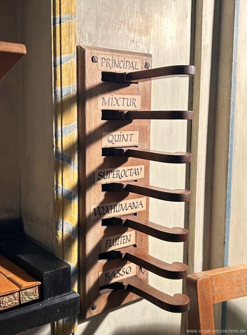 Manual C, D, E, F, G, A – c“‘Flutten 8′; Metall, konisch (Spitzflöte) Voxhumana 8′; ab c‘ (Schwebung, labial); Metall Principal 4′, Prospekt – Anm. 1; Metall, ab cs“ innen Superoctav 2′; Metall Quint 1 1/3′; Metall – rep. fs“ zu fs‘ Mixtur 2-fach 1′ – rep. c’/fs“