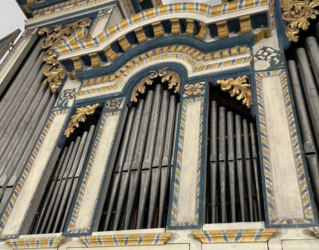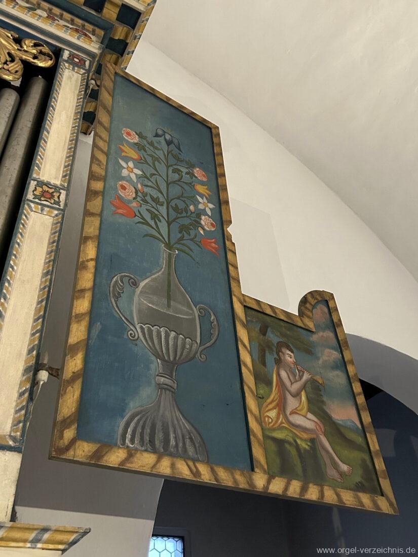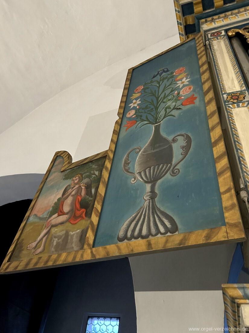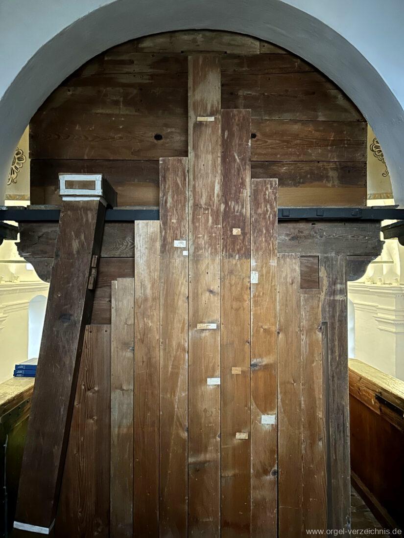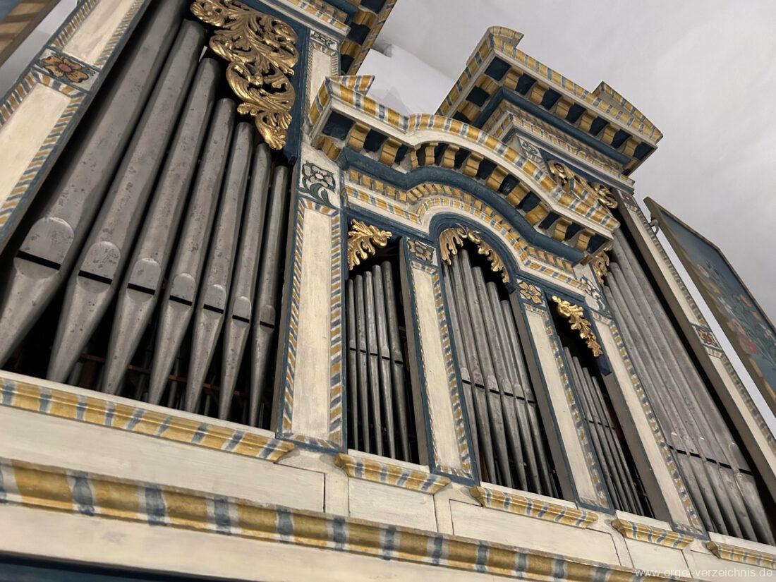 Manual C, D, E, F, G, A – c“‘Flutten 8′; Metall, konisch (Spitzflöte) Voxhumana 8′; ab c‘ (Schwebung, labial); Metall Principal 4′, Prospekt – Anm. 1; Metall, ab cs“ innen Superoctav 2′; Metall Quint 1 1/3′; Metall – rep. fs“ zu fs‘ Mixtur 2-fach 1′ – rep. c’/fs“