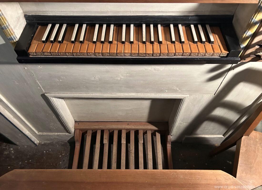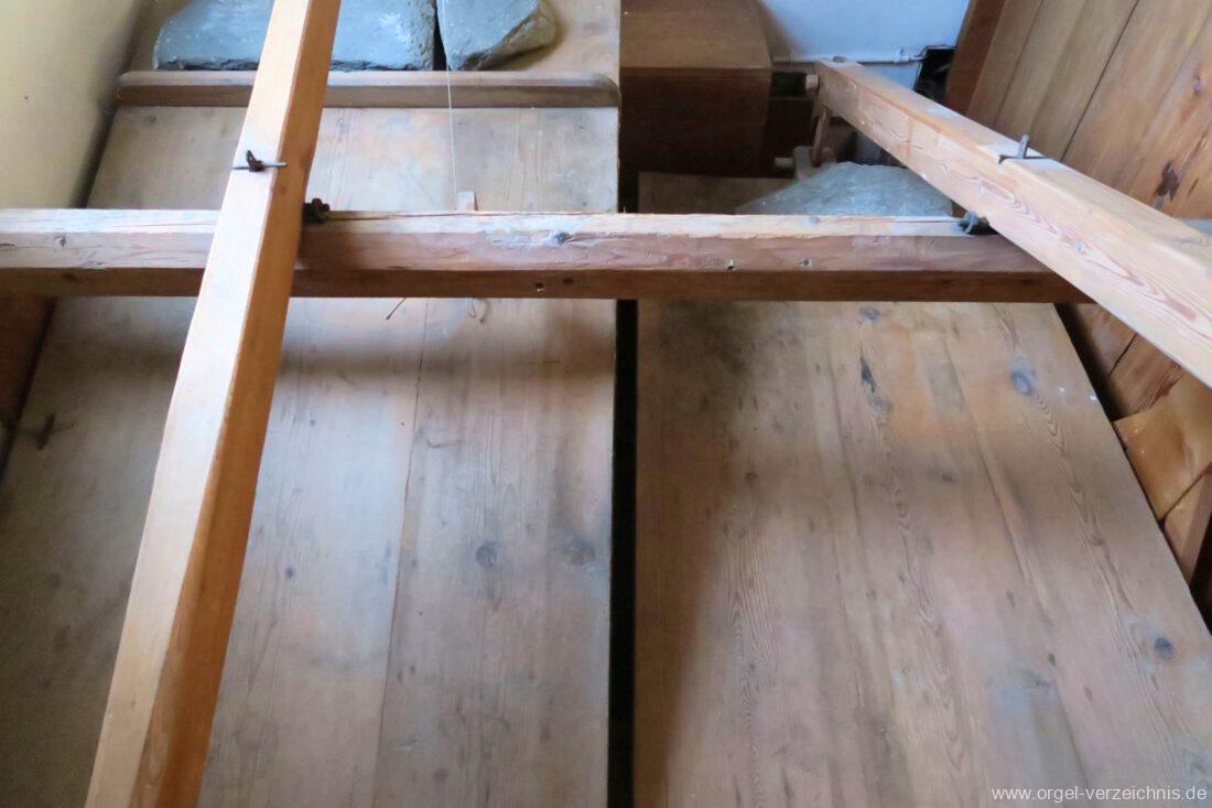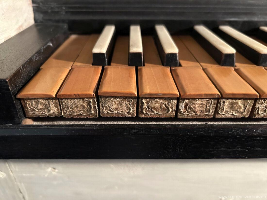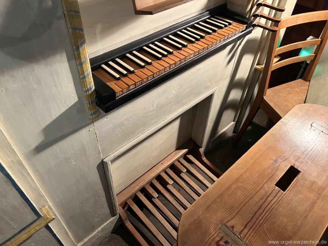 Die Orgel kann mittels zweier vierfaltiger Keilbälge immer noch von Hand gepumpt werden. Tastatur: Untertasten aus Buchsbaum, Obertasten mit Knochen belegt.
