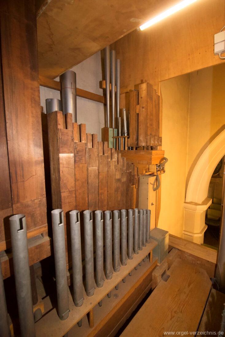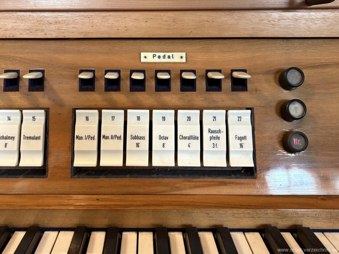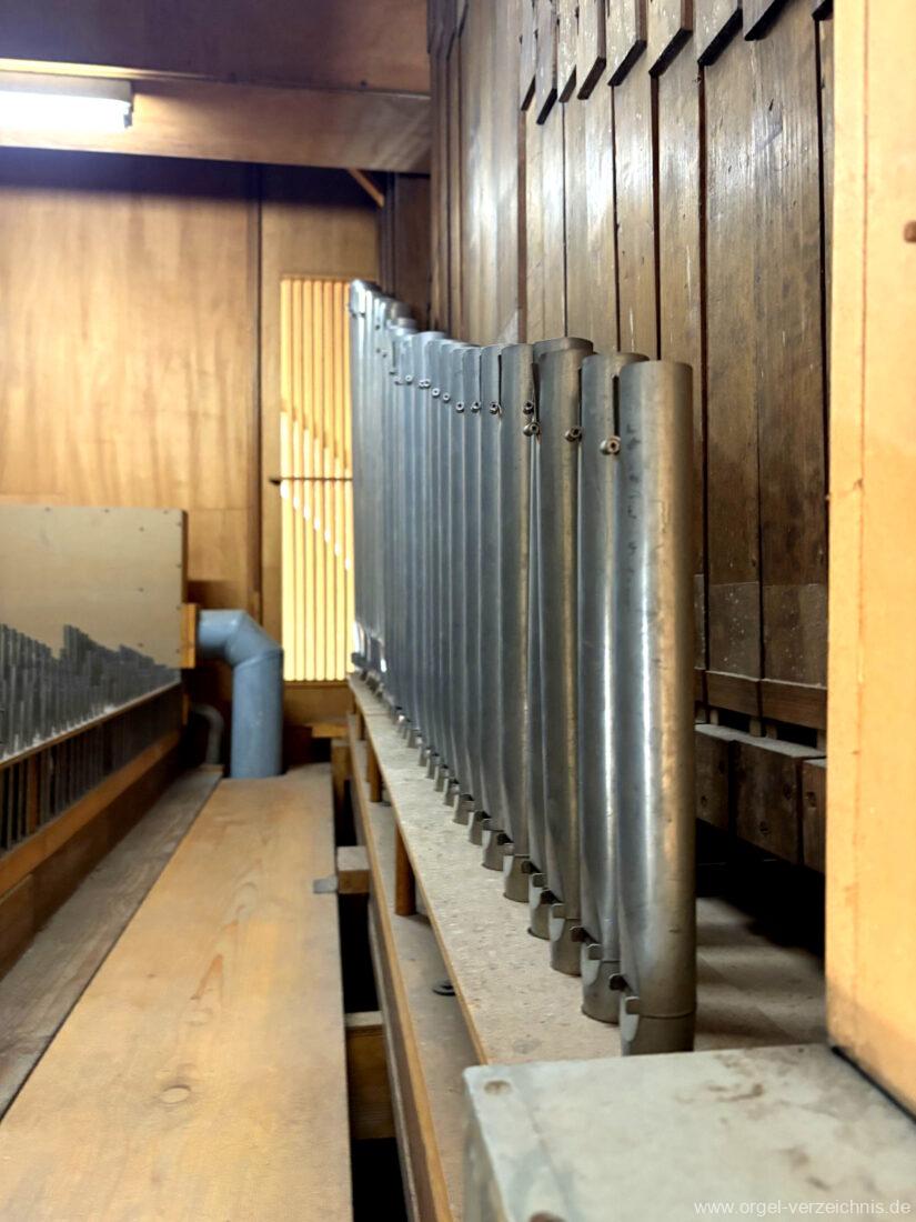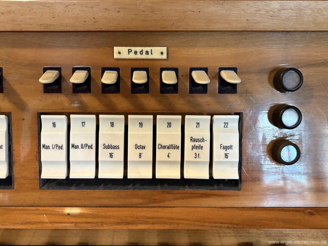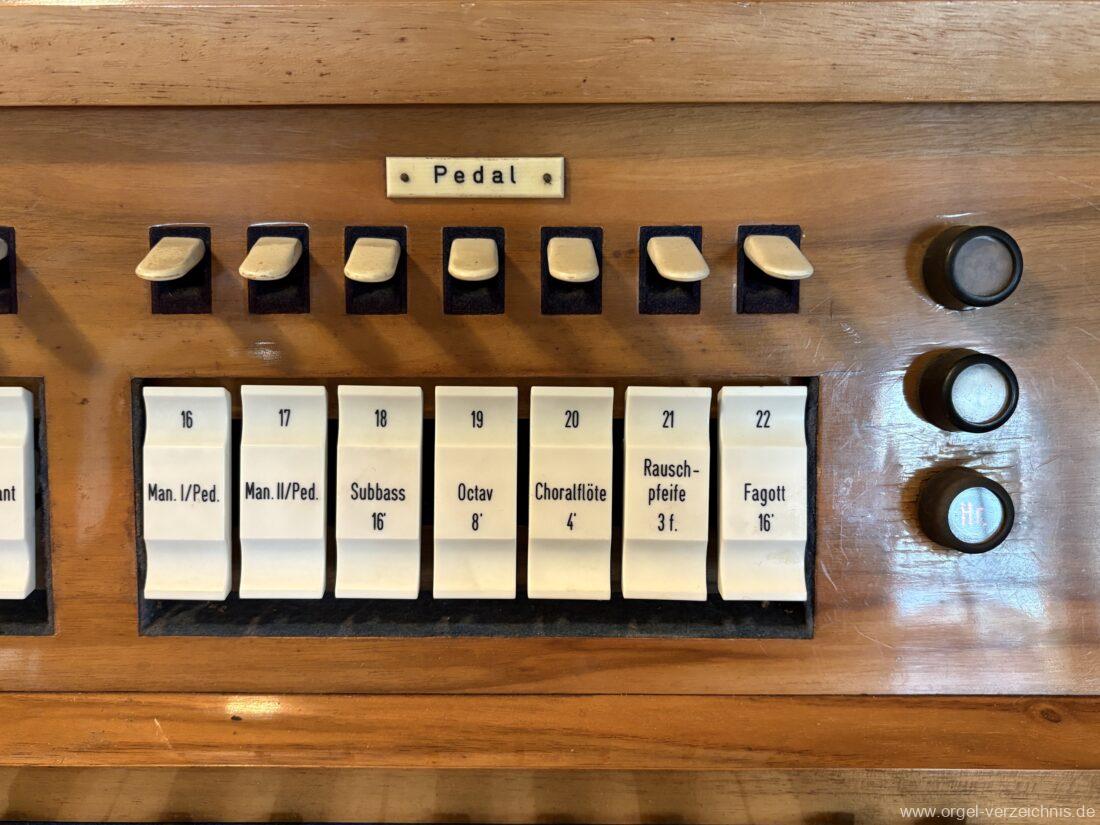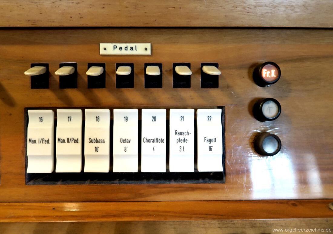 Pedal C – f‘Subbass 16′ Holz ged. Octav 8′ Holz offen, innenlabiiert Choralflöte 4′ C/CS Naturguss; ab D Metall Rauschpfeife 3 f. 2 2/3′; Metall Fagott 16′ Stiefel Holz/Becher Zink |