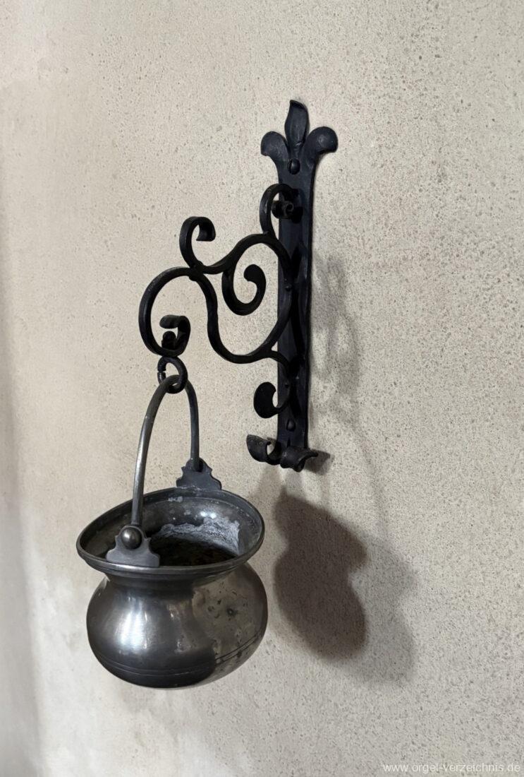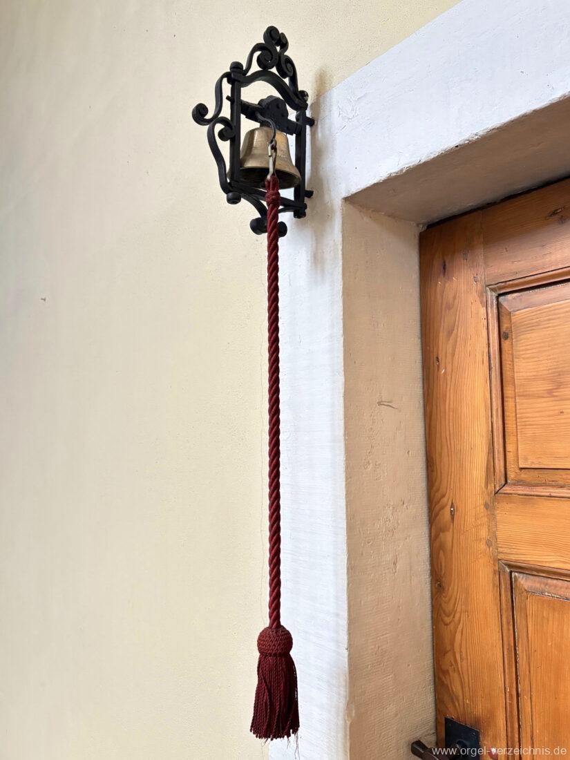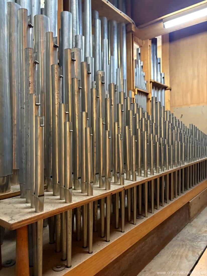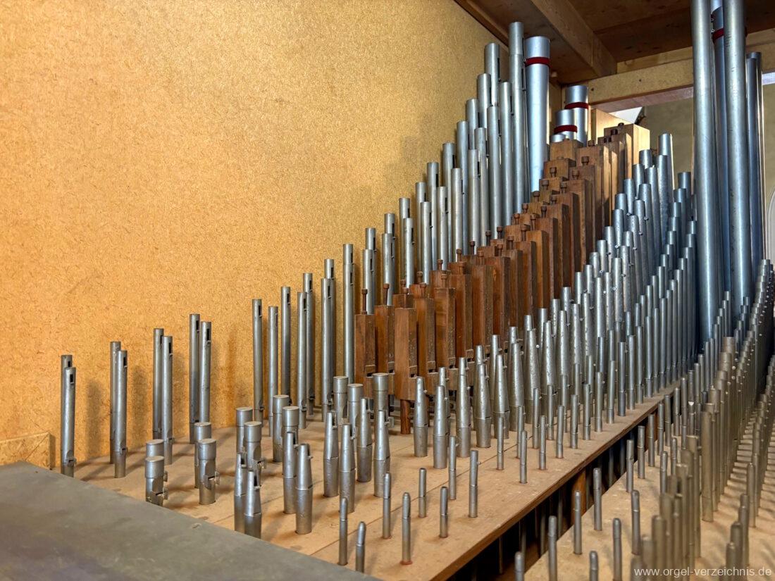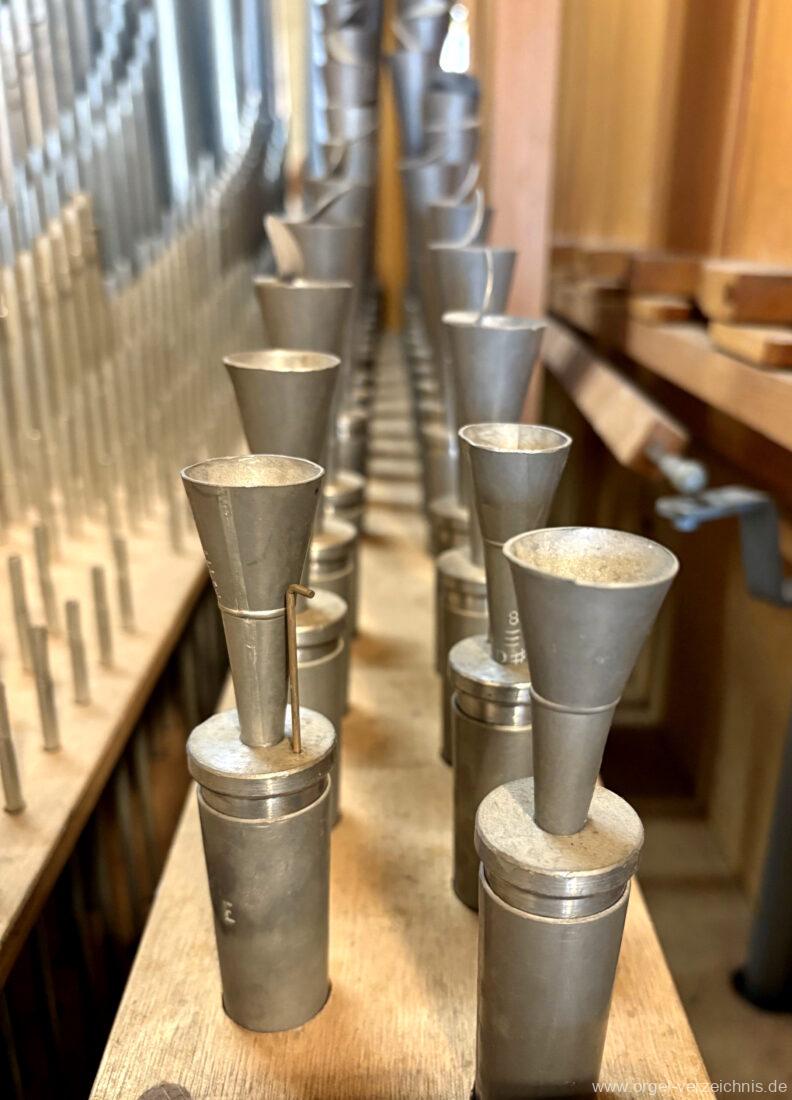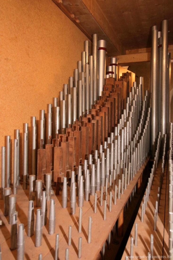 Pedal C – f‘Subbass 16′ Holz ged. Octav 8′ Holz offen, innenlabiiert Choralflöte 4′ C/CS Naturguss; ab D Metall Rauschpfeife 3 f. 2 2/3′; Metall Fagott 16′ Stiefel Holz/Becher Zink |