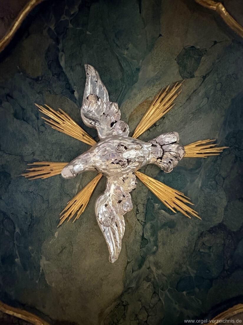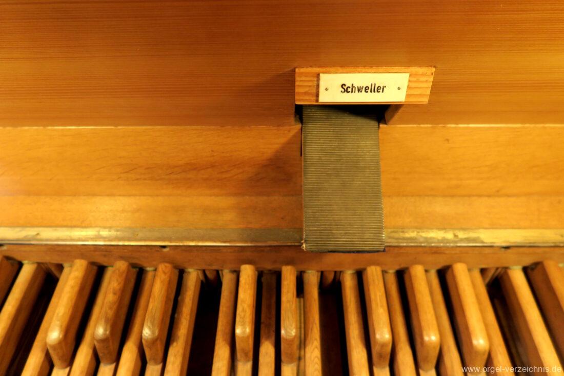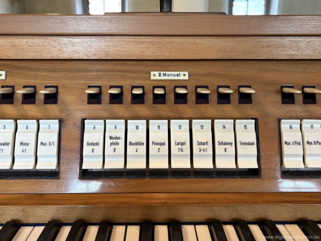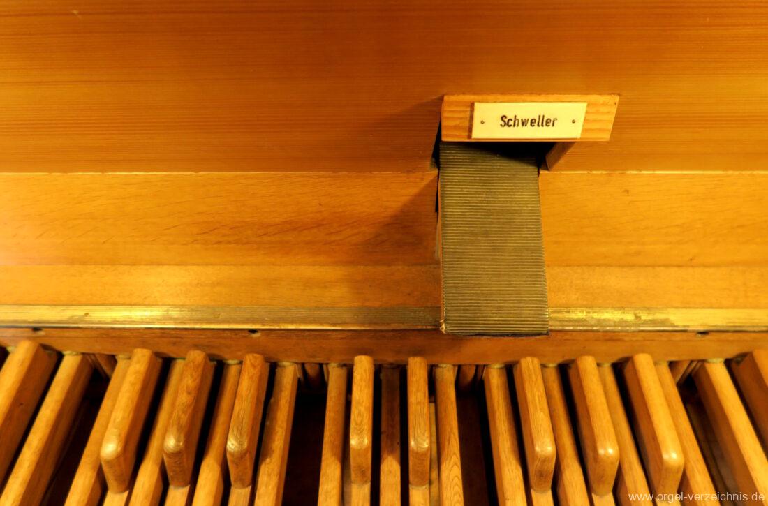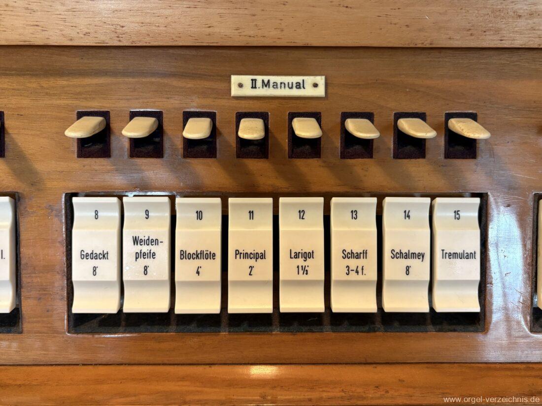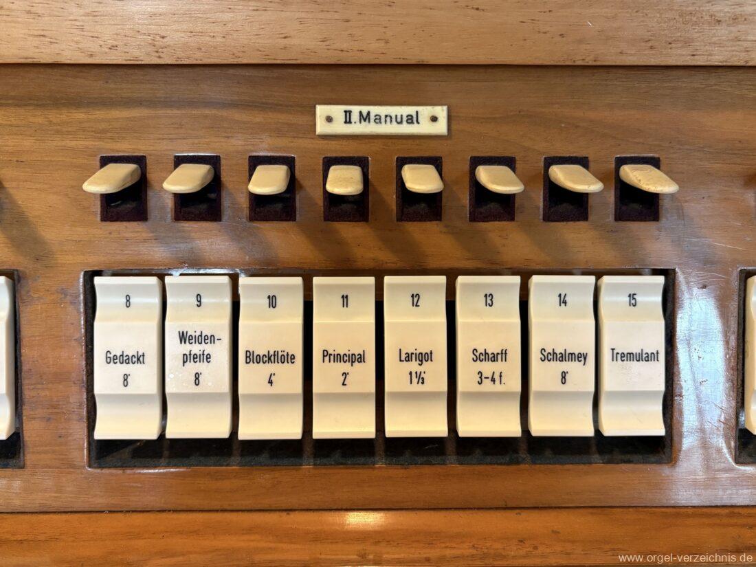 II Brustwerk im SW C – f“‘Gedackt 8′ Holz ged., innenlabiiert; ab g“ Metall ged. Weidenpfeife 8′ C – H Zink ged.; ab c° Metall offen Blockflöte 4′ Naturguss, konisch Principal 2′ Metall Larigot 1 1/3′ ab c°, Metall, prinzipalisch Scharff 3-4 f. 1′; Metall – rep. cs°/cs’/cs“/cs“‘; ab cs° 4 fach Schalmey 8′ Stiefel Metall; Becher C – h° Zink/ab c‘ Metall, konisch, Oboe Tremulant (II)
