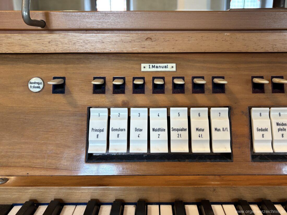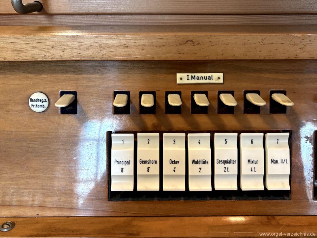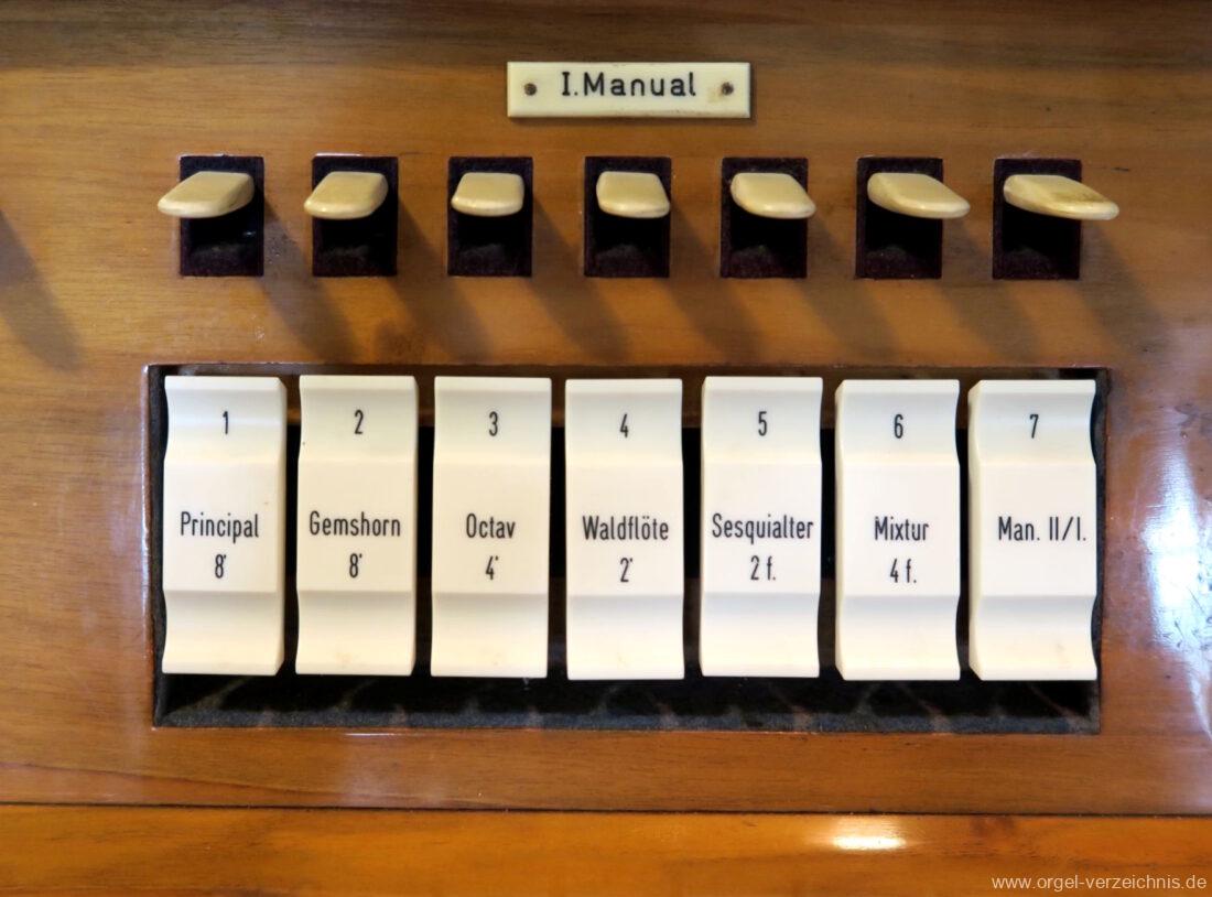 I Hauptwerk C – f“‘Principal 8′ C – b‘ Prospekt, ab b‘ innen, Metall – Anm. 1 Gemshorn 8′ Zink, konisch; ab c° Metall konisch Octav 4′ Metall Waldflöte 2′ Metall, leicht konisch Sesquialter 2 f. ab c°; Metall Mixtur 4 f. 1 1/3′; Metall – rep. c°/c’/c“/c“‘ |